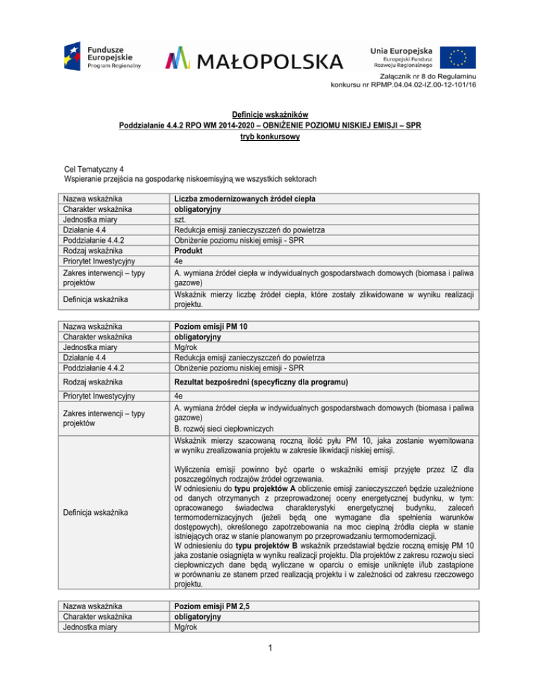 Załącznik nr 8 do Regulaminu konkursu nr RPMP.04.04.02-IZ.00-12-101/16 Definicje wskaźników Poddziałanie 4.4.2 RPO WM 2014-2020 – OBNIŻENIE POZIOMU NISKIEJ EMISJI – SPR tryb konkursowy Cel Tematyczny 4 Wspieranie przejścia na gospodarkę niskoemisyjną we wszystkich sektorach Nazwa wskaźnika Charakter wskaźnika Jednostka miary Działanie 4.4 Poddziałanie 4.4.2 Rodzaj wskaźnika Priorytet Inwestycyjny Zakres interwencji – typy projektów Definicja wskaźnika Liczba zmodernizowanych źródeł ciepła obligatoryjny szt. Redukcja emisji zanieczyszczeń do powietrza Obniżenie poziomu niskiej emisji - SPR Produkt 4e A. wymiana źródeł ciepła w indywidualnych gospodarstwach domowych (biomasa i paliwa gazowe) Wskaźnik mierzy liczbę źródeł ciepła, które zostały zlikwidowane w wyniku realizacji projektu. Nazwa wskaźnika Charakter wskaźnika Jednostka miary Działanie 4.4 Poddziałanie 4.4.2 Poziom emisji PM 10 obligatoryjny Mg/rok Redukcja emisji zanieczyszczeń do powietrza Obniżenie poziomu niskiej emisji - SPR Rodzaj wskaźnika Rezultat bezpośredni (specyficzny dla programu) Priorytet Inwestycyjny 4e A. wymiana źródeł ciepła w indywidualnych gospodarstwach domowych (biomasa i paliwa gazowe) B. rozwój sieci ciepłowniczych Wskaźnik mierzy szacowaną roczną ilość pyłu PM 10, jaka zostanie wyemitowana w wyniku zrealizowania projektu w zakresie likwidacji niskiej emisji. Zakres interwencji – typy projektów Definicja wskaźnika Nazwa wskaźnika Charakter wskaźnika Jednostka miary Wyliczenia emisji powinno być oparte o wskaźniki emisji przyjęte przez IZ dla poszczególnych rodzajów źródeł ogrzewania. W odniesieniu do typu projektów A obliczenie emisji zanieczyszczeń będzie uzależnione od danych otrzymanych z przeprowadzonej oceny energetycznej budynku, w tym: opracowanego świadectwa charakterystyki energetycznej budynku, zaleceń termomodernizacyjnych (jeżeli będą one wymagane dla spełnienia warunków dostępowych), określonego zapotrzebowania na moc cieplną źródła ciepła w stanie istniejących oraz w stanie planowanym po przeprowadzaniu termomodernizacji. W odniesieniu do typu projektów B wskaźnik przedstawiał będzie roczną emisję PM 10 jaka zostanie osiągnięta w wyniku realizacji projektu. Dla projektów z zakresu rozwoju sieci ciepłowniczych dane będą wyliczane w oparciu o emisje uniknięte i/lub zastąpione w porównaniu ze stanem przed realizacją projektu i w zależności od zakresu rzeczowego projektu. Poziom emisji PM 2,5 obligatoryjny Mg/rok 1 Działanie 4.4 Poddziałanie 4.4.2 Rodzaj wskaźnika Priorytet Inwestycyjny Zakres interwencji – typy projektów Definicja wskaźnika Nazwa wskaźnika Charakter wskaźnika Jednostka miary Działanie 4.4 Poddziałanie 4.4.2 Rodzaj wskaźnika Priorytet Inwestycyjny Zakres interwencji – typy projektów Definicja wskaźnika Nazwa wskaźnika Charakter wskaźnika Jednostka miary Działanie 4.4 Poddziałanie 4.4.2 Rodzaj wskaźnika Priorytet Inwestycyjny Redukcja emisji zanieczyszczeń do powietrza Obniżenie poziomu niskiej emisji - SPR Rezultat bezpośredni (specyficzny dla programu) 4e A. wymiana źródeł ciepła w indywidualnych gospodarstwach domowych (biomasa i paliwa gazowe) B. rozwój sieci ciepłowniczych Wskaźnik mierzy szacowaną roczną ilość pyłu PM 2.5, jaka zostanie wyemitowana w wyniku zrealizowania projektu w zakresie likwidacji niskiej emisji. Wyliczenia emisji powinno być oparte o wskaźniki emisji przyjęte przez IZ dla poszczególnych rodzajów źródeł ogrzewania. W odniesieniu do typu projektów A obliczenie emisji zanieczyszczeń będzie uzależnione od danych otrzymanych z przeprowadzonej oceny energetycznej budynku, w tym: opracowanego świadectwa charakterystyki energetycznej budynku, zaleceń termomodernizacyjnych (jeżeli będą one wymagane dla spełnienia warunków dostępowych), określonego zapotrzebowania na moc cieplną źródła ciepła w stanie istniejących oraz w stanie planowanym po przeprowadzaniu termomodernizacji. W odniesieniu do typu projektów B wskaźnik przedstawiał będzie roczną emisję PM 2.5 jaka zostanie osiągnięta w wyniku realizacji projektu. Dla projektów z zakresu rozwoju sieci ciepłowniczych dane będą wyliczane w oparciu o emisje uniknięte i/lub zastąpione w porównaniu ze stanem przed realizacją projektu i w zależności od zakresu rzeczowego projektu. Szacowany roczny spadek emisji gazów cieplarnianych (CI 34) obligatoryjny tony równoważnika CO2/rok Redukcja emisji zanieczyszczeń do powietrza Obniżenie poziomu niskiej emisji - SPR Rezultat bezpośredni 4e A. wymiana źródeł ciepła w indywidualnych gospodarstwach domowych (biomasa i paliwa gazowe) B. rozwój sieci ciepłowniczych Wskaźnik mierzy szacowaną roczną ilość gazów cieplarnianych, jaka zostanie zredukowana w wyniku zrealizowania projektu w zakresie likwidacji niskiej emisji. Wyliczenia emisji powinno być oparte o wskaźniki emisji przyjęte przez IZ dla poszczególnych rodzajów źródeł ogrzewania. W odniesieniu do typu projektów A obliczenie emisji zanieczyszczeń będzie uzależnione od danych otrzymanych z przeprowadzonej oceny energetycznej budynku, w tym: opracowanego świadectwa charakterystyki energetycznej budynku, zaleceń termomodernizacyjnych (jeżeli będą one wymagane dla spełnienia warunków dostępowych), określonego zapotrzebowania na moc cieplną źródła ciepła w stanie istniejących oraz w stanie planowanym po przeprowadzaniu termomodernizacji. W odniesieniu do typu projektów B wskaźnik przedstawiał będzie roczną emisję CO2 jaka zostanie osiągnięta w wyniku realizacji projektu. Dla projektów z zakresu rozwoju sieci ciepłowniczych dane będą wyliczane w oparciu o emisje uniknięte i/lub zastąpione w porównaniu ze stanem przed realizacją projektu i w zależności od zakresu rzeczowego projektu. Długość wybudowanej sieci ciepłowniczej obligatoryjny km Redukcja emisji zanieczyszczeń do po