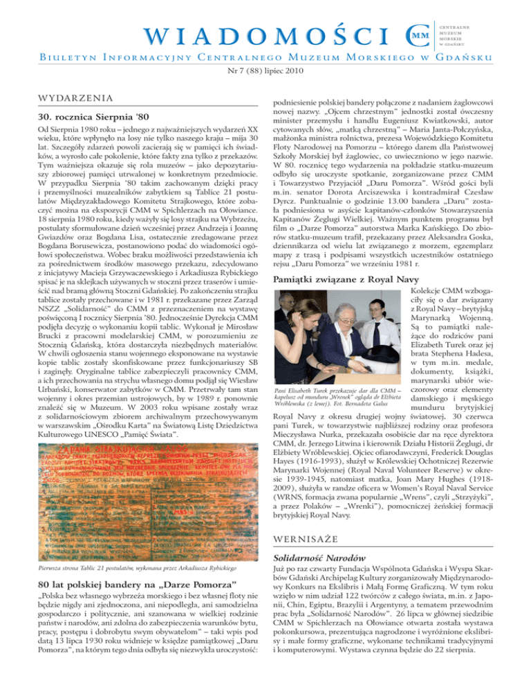 WIADOMOŚCI BIULETYN INFORMACYJNY CENTRALNEGO MUZEUM MORSKIEGO W GDAŃSKU Nr 7 (88) lipiec 2010 WY DARZENIA 30. rocznica Sierpnia '80 Od Sierpnia 1980 roku – jednego z najważniejszych wydarzeń XX wieku, które wpłynęło na losy nie tylko naszego kraju – mija 30 lat. Szczegóły zdarzeń powoli zacierają się w pamięci ich świadków, a wyrosło całe pokolenie, które fakty zna tylko z przekazów. Tym ważniejsza okazuje się rola muzeów – jako depozytariuszy zbiorowej pamięci utrwalonej w konkretnym przedmiocie. W przypadku Sierpnia ’80 takim zachowanym dzięki pracy i przemyślności muzealników zabytkiem są Tablice 21 postulatów Międzyzakładowego Komitetu Strajkowego, które zobaczyć można na ekspozycji CMM w Spichlerzach na Ołowiance. 18 sierpnia 1980 roku, kiedy ważyły się losy strajku na Wybrzeżu, postulaty sformułowane dzień wcześniej przez Andrzeja i Joannę Gwiazdów oraz Bogdana Lisa, ostatecznie zredagowane przez Bogdana Borusewicza, postanowiono podać do wiadomości ogółowi społeczeństwa. Wobec braku możliwości przedstawienia ich za pośrednictwem środków masowego przekazu, zdecydowano z inicjatywy Macieja Grzywaczewskiego i Arkadiusza Rybickiego spisać je na sklejkach używanych w stoczni przez traserów i umieścić nad bramą główną Stoczni Gdańskiej. Po zakończeniu strajku tablice zostały przechowane i w 1981 r. przekazane przez Zarząd NSZZ „Solidarność” do CMM z przeznaczeniem na wystawę poświęconą I rocznicy Sierpnia ’80. Jednocześnie Dyrekcja CMM podjęła decyzję o wykonaniu kopii tablic. Wykonał je Mirosław Brucki z pracowni modelarskiej CMM, w porozumieniu ze Stocznią Gdańską, która dostarczyła niezbędnych materiałów. W chwili ogłoszenia stanu wojennego eksponowane na wystawie kopie tablic zostały skonfiskowane przez funkcjonariuszy SB i zaginęły. Oryginalne tablice zabezpieczyli pracownicy CMM, a ich przechowania na strychu własnego domu podjął się Wiesław Urbański, konserwator zabytków w CMM. Przetrwały tam stan wojenny i okres przemian ustrojowych, by w 1989 r. ponownie znaleźć się w Muzeum. W 2003 roku wpisane zostały wraz z solidarnościowym zbiorem archiwalnym przechowywanym w warszawskim „Ośrodku Karta” na Światową Listę Dziedzictwa Kulturowego UNESCO „Pamięć Świata”. podniesienie polskiej bandery połączone z nadaniem żaglowcowi nowej nazwy. „Ojcem chrzestnym” jednostki został ówczesny minister przemysłu i handlu Eugeniusz Kwiatkowski, autor cytowanych słów, „matką chrzestną” – Maria Janta-Połczyńska, małżonka ministra rolnictwa, prezesa Wojewódzkiego Komitetu Floty Narodowej na Pomorzu – którego darem dla Państwowej Szkoły Morskiej był żaglowiec, co uwieczniono w jego nazwie. W 80. rocznicę tego wydarzenia na pokładzie statku-muzeum odbyło się uroczyste spotkanie, zorganizowane przez CMM i Towarzystwo Przyjaciół „Daru Pomorza”. Wśród gości byli m.in. senator Dorota Arciszewska i kontradmirał Czesław Dyrcz. Punktualnie o godzinie 13.00 bandera „Daru” została podniesiona w asyście kapitanów-członków Stowarzyszenia Kapitanów Żeglugi Wielkiej. Ważnym punktem programu był film o „Darze Pomorza” autorstwa Marka Kańskiego. Do zbiorów statku-muzeum trafił, przekazany przez Aleksandra Goska, dziennikarza od wielu lat związanego z morzem, egzemplarz mapy z trasą i podpisami wszystkich uczestników ostatniego rejsu „Daru Pomorza” we wrześniu 1981 r. Pamiątki związane z Royal Navy Kolekcje CMM wzbogaciły się o dar związany z Royal Navy – brytyjską Marynarką Wojenną. Są to pamiątki należące do rodziców pani Elizabeth Turek oraz jej brata Stephena Hadesa, w tym m.in. medale, dokumenty, książki, marynarski ubiór wieczorowy oraz elementy Pani Elisabeth Turek przekazuje dar dla CMM – kapelusz od munduru „Wrenek” ogląda dr Elżbieta damskiego i męskiego Wróblewska (z lewej). Fot. Bernadeta Galus munduru brytyjskiej Royal Navy z okresu drugiej wojny światowej. 30 czerwca pani Turek, w towarzystwie najbliższej rodziny oraz profesora Mieczysława Nurka, przekazała osobiście dar na ręce dyrektora CMM, dr. Jerzego Litwina i kierownik Działu Historii Żeglugi, dr Elżbiety Wróblewskiej. Ojciec ofiarodawczyni, Frederick Douglas Hayes (1916-1993), służył w Królewskiej Ochotniczej Rezerwie Marynarki Wojennej (Royal Naval Volunteer Reserve) w okresie 1939-1945, natomiast matka, Joan Mary Hughes (19182009), służyła w randze oficera w Women’s Royal Naval Service (WRNS, formacja zwana popularnie „Wrens”, czyli „Strzyżyki”, a przez Polaków – „Wrenki”), pomocniczej żeńskiej formacji brytyjskiej Royal Navy. W E R NI S A Ż E Solidarność Narodów Pierwsza strona Tablic 21 postulatów, wykonana przez Arkadiusza Rybickiego 80 lat polskiej bandery na „Darze Pomorza” „Polska bez własnego wybrzeża morskiego i bez własnej floty nie będzie nigdy ani zjednoczona, ani niepodległa, ani samodzielna gospodarczo i politycznie, ani szanowana w wielkiej rodzinie państw i narodów, ani zdolna do zabezpieczenia warunków bytu, pracy, postępu i dobrobytu swym obywatelom” – taki wpis pod datą 13 lipca 1930 roku widnieje w księdze pamiątkowej „Daru Pomorza”, na którym tego dnia odbyła się niezwykła uroczystość: Już po raz czwarty Fundacja Wspólnota Gdańska i Wyspa Skarbów Gdański Archipelag Kultury zorganizowały Międzynarodowy Konkurs na Ekslibris i Małą Formę Graficzną. W tym roku wzięło w nim udział 122 twórców z całego świata, m.in. z Japonii, Chin, Egiptu, Brazylii i Argentyny, a tematem przewodnim prac była „Solidarność Narodów”. 26 lipca w głównej siedzibie CMM w Spichlerzach na Ołowiance otwarta została wystawa pokonkursowa, prezentująca nagrodzone i wyróżnione ekslibrisy i małe formy graficzne, wykonane technikami tradycyjnymi i komputerowymi. Wystawa czynna będzie do 22 sierpnia. Spotkanie z Jerzym Radom