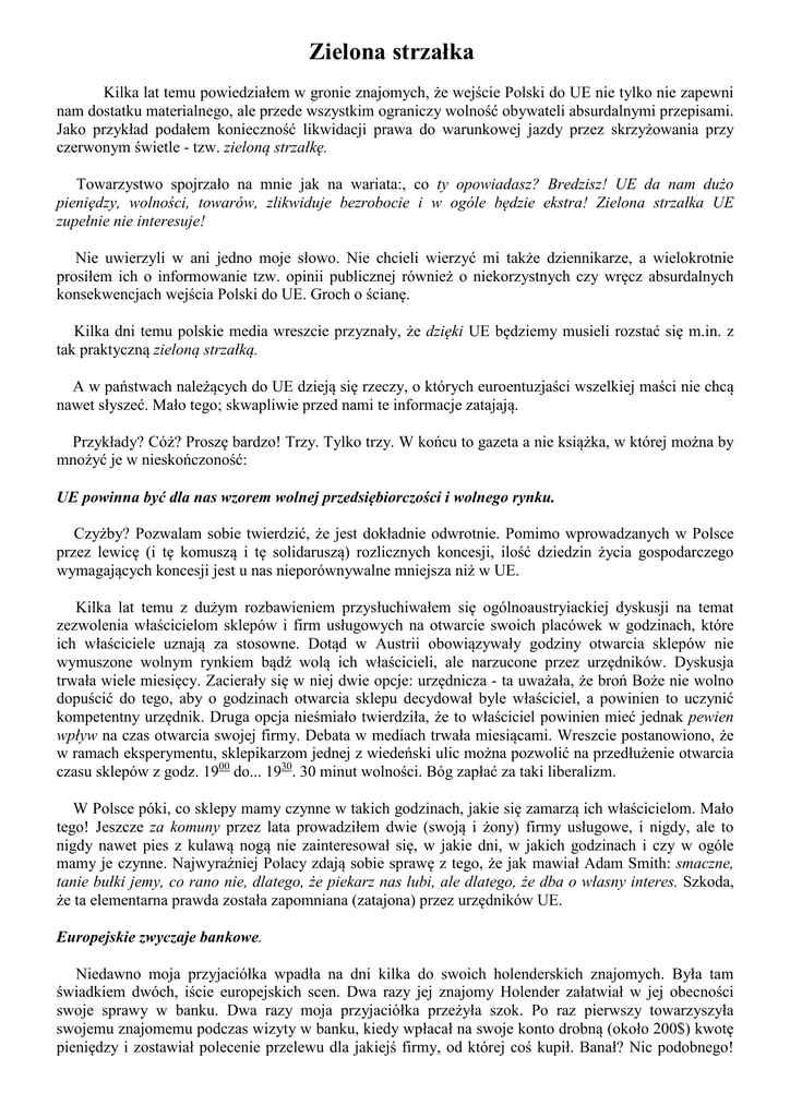 Zielona strzałka Kilka lat temu powiedziałem w gronie znajomych, że wejście Polski do UE nie tylko nie zapewni nam dostatku materialnego, ale przede wszystkim ograniczy wolność obywateli absurdalnymi przepisami. Jako przykład podałem konieczność likwidacji prawa do warunkowej jazdy przez skrzyżowania przy czerwonym świetle - tzw. zieloną strzałkę. Towarzystwo spojrzało na mnie jak na wariata:, co ty opowiadasz? Bredzisz! UE da nam dużo pieniędzy, wolności, towarów, zlikwiduje bezrobocie i w ogóle będzie ekstra! Zielona strzałka UE zupełnie nie interesuje! Nie uwierzyli w ani jedno moje słowo. Nie chcieli wierzyć mi także dziennikarze, a wielokrotnie prosiłem ich o informowanie tzw. opinii publicznej również o niekorzystnych czy wręcz absurdalnych konsekwencjach wejścia Polski do UE. Groch o ścianę. Kilka dni temu polskie media wreszcie przyznały, że dzięki UE będziemy musieli rozstać się m.in. z tak praktyczną zieloną strzałką. A w państwach należących do UE dzieją się rzeczy, o których euroentuzjaści wszelkiej maści nie chcą nawet słyszeć. Mało tego; skwapliwie przed nami te informacje zatajają. Przykłady? Cóż? Proszę bardzo! Trzy. Tylko trzy. W końcu to gazeta a nie książka, w której można by mnożyć je w nieskończoność: UE powinna być dla nas wzorem wolnej przedsiębiorczości i wolnego rynku. Czyżby? Pozwalam sobie twierdzić, że jest dokładnie odwrotnie. Pomimo wprowadzanych w Polsce przez lewicę (i tę komuszą i tę solidaruszą) rozlicznych koncesji, ilość dziedzin życia gospodarczego wymagających koncesji jest u nas nieporównywalne mniejsza niż w UE. Kilka lat temu z dużym rozbawieniem przysłuchiwałem się ogólnoaustryiackiej dyskusji na temat zezwolenia właścicielom sklepów i firm usługowych na otwarcie swoich placówek w godzinach, które ich właściciele uznają za stosowne. Dotąd w Austrii obowiązywały godziny otwarcia sklepów nie wymuszone wolnym rynkiem bądź wolą ich właścicieli, ale narzucone przez urzędników. Dyskusja trwała wiele miesięcy. Zacierały się w niej dwie opcje: urzędnicza - ta uważała, że broń Boże nie wolno dopuścić do tego, aby o godzinach otwarcia sklepu decydował byle właściciel, a powinien to uczynić kompetentny urzędnik. Druga opcja nieśmiało twierdziła, że to właściciel powinien mieć jednak pewien wpływ na czas otwarcia swojej firmy. Debata w mediach trwała miesiącami. Wreszcie postanowiono, że w ramach eksperymentu, sklepikarzom jednej z wiedeński ulic można pozwolić na przedłużenie otwarcia czasu sklepów z godz. 1900 do... 1930. 30 minut wolności. Bóg zapłać za taki liberalizm. W Polsce póki, co sklepy mamy czynne w takich godzinach, jakie się zamarzą ich właścicielom. Mało tego! Jeszcze za komuny przez lata prowadziłem dwie (swoją i żony) firmy usługowe, i nigdy, ale to nigdy nawet pies z kulawą nogą nie zainteresował się, w jakie dni, w jakich godzinach i czy w ogóle mamy je czynne. Najwyraźniej Polacy zdają sobie sprawę z tego, że jak mawiał Adam Smith: smaczne, tanie bułki jemy, co rano nie, dlatego, że piekarz nas lubi, ale dlatego, że dba o własny interes. Szkoda, że ta elementarna prawda została zapomniana (zatajona) przez urzędników UE. Europejskie zwyczaje bankowe. Niedawno moja przyjaciółka wpadła na dni kilka do swoich holenderskich znajomych. Była tam świadkiem dwóch, iście europejskich scen. Dwa razy jej znajomy Holender załatwiał w jej obecności swoje sprawy w banku. Dwa razy moja przyjaciółka przeżyła szok. Po raz pierwszy towarzyszyła swojemu znajomemu podczas wizyty w banku, kiedy wpłacał na swoje konto drobną (około 200$) kwotę pieniędzy i zostawiał polecenie przelewu dla jakiejś firmy, od której coś kupił. Banał? Nic podobnego! Holender musiał wytłumaczyć się przed urzędniczką banku SKĄD wziął pieniądze na wpłatę i musiał przedstawić rachunek od firmy, na dobro, której przelewał swoje (?) pieniądze. To jeszcze nic! Kilka dni później była świadkiem, jak to rzeczony Holender wypisał czek i pobierał swoje (?) pieniądze ze swojego (?) konta. Kasjerka zapytała NA CO chce przeznaczyć podejmowane pieniądze. I musiał się biedak (kretyn?) tłumaczyć. Rewelacja. Póki, co kilka razy w tygodniu korzystam z usług polskich banków. Wpłacam ile chcę, wypłacam, co mam i przelewam, gdzie chcę i ile chcę bez jednego słowa wyjaśnienia, bo póki, co pieniądze na moich kontach są MOJE. Na razie. Co będzie po wejściu do UE? Na razie wolę o tym nie myśleć. No to wszystko może i prawda, ale dzięki temu w UE panuje powszechny dobrobyt i szczęśliwość. Tak? Tak twierdzą ludzie, którzy odwiedzali kraje UE... Z wycieczką. Ludzie, którzy nie widzieli dzielnic okalających np. hamburską St., Pauli, którzy nie widzieli położonych daleko od szosy wsi francuskich, którzy nie widzieli niektórych dzielnic Wiednia czy nawet Londynu, którzy nie widzieli wsi portugalskich i hiszpańskich, którzy nie widzieli realiów (nie turystycznych enklaw) południowych Włoch. Ja widziałem. Tak potwornej nędzy i ruiny w Polsce po prostu nie ma. Nigdzie. Nawet po wschodniej stronie Wisły. Cóż, po raz tysiącznym powtarzanym truizmem (już nawet nie pamiętam czyjego autorstwa) jest stwierdzenie: wchodząc do Unii Europejskiej nie wchodzimy do Stanów Zjednoczonych Europy, ale do Związku Socjalistycznych Republik Europejskich.