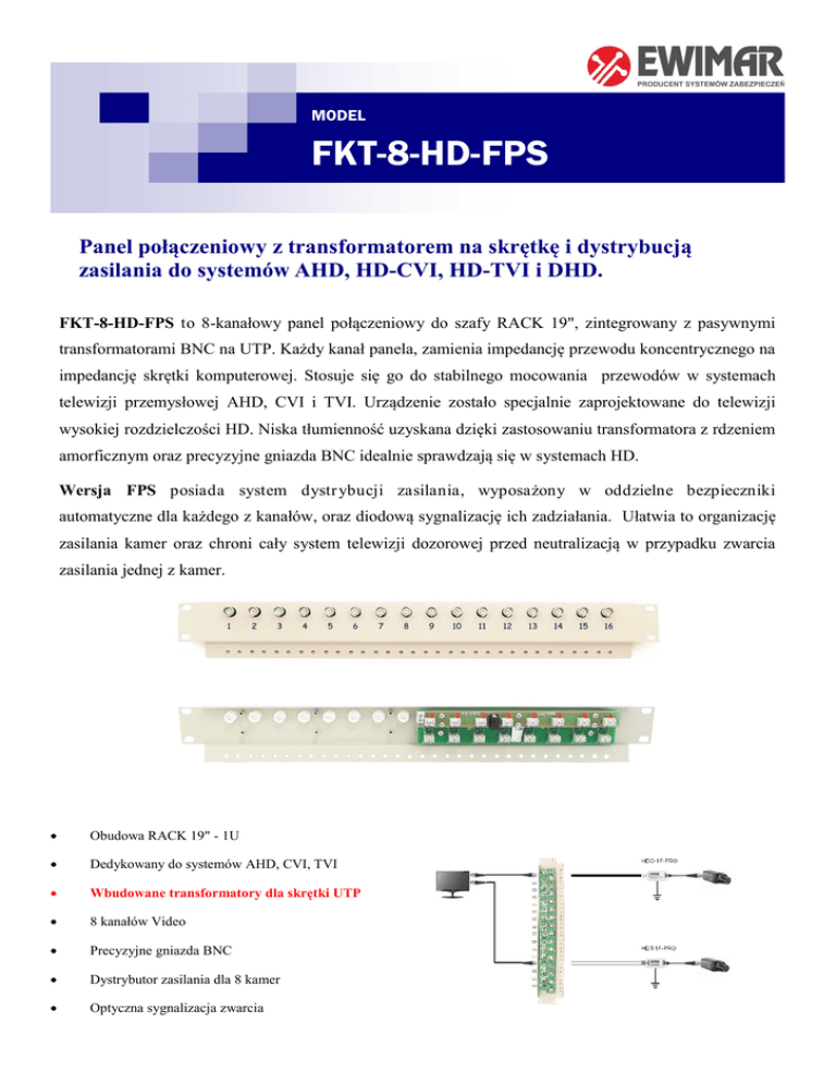 MODEL FKT-8-HD-FPS Panel połączeniowy z transformatorem na skrętkę i dystrybucją zasilania do systemów AHD, HD-CVI, HD-TVI i DHD. FKT-8-HD-FPS to 8-kanałowy panel połączeniowy do szafy RACK 19", zintegrowany z pasywnymi transformatorami BNC na UTP. Każdy kanał panela, zamienia impedancję przewodu koncentrycznego na impedancję skrętki komputerowej. Stosuje się go do stabilnego mocowania przewodów w systemach telewizji przemysłowej AHD, CVI i TVI. Urządzenie zostało specjalnie zaprojektowane do telewizji wysokiej rozdzielczości HD. Niska tłumienność uzyskana dzięki zastosowaniu transformatora z rdzeniem amorficznym oraz precyzyjne gniazda BNC idealnie sprawdzają się w systemach HD. Wersja FPS posiada system dystr ybucji zasilania, wyposażony w oddzielne bezpieczniki automatyczne dla każdego z kanałów, oraz diodową sygnalizację ich zadziałania. Ułatwia to organizację zasilania kamer oraz chroni cały system telewizji dozorowej przed neutralizacją w przypadku zwarcia zasilania jednej z kamer. Obudowa RACK 19" - 1U Dedykowany do systemów AHD, CVI, TVI Wbudowane transformatory dla skrętki UTP 8 kanałów Video Precyzyjne gniazda BNC Dystrybutor zasilania dla 8 kamer Optyczna sygnalizacja zwarcia