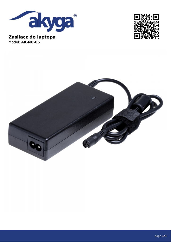 Zasilacz do laptopa Model: AK-NU-05 page 1/3 Zasilacz do laptopa model: AK-NU-05 Kod produktu AK-NU-05 Typ produktu Zasilacz do laptopa Seria Napięcie zasilające Pobór prądu Sprawność Napięcie wyjściowe Automatyczny dobór napięcia wyjściowego Universal 110-240V / 50/60Hz <2A > 80 % 18.5V / 19V / 19.5V / 20V Tak Wyjściowe natężenie prądu max. 6 A Długość kabla wyjściowego 1.2 m Złacze kabla wyjściowego Maksymalna moc Wtyk gniazda zasilania Wyłacznik mechaniczny M5 19V 5.5x2.5mm, M6 19V 5.0x3.0mm + pin, M9 19.5V 7.4x5.0mm + pin, M11 20V 7.9x5.5mm + pin, M12 18.5V 7.4x5.0mm + pin, M15 19V 5.5x1.7mm 90 W IEC C6 Brak Uziemienie Tak Łagodny start Tak Filtr ferrytowy Tak Złącze USB Brak Kabel zasilający w zestawie Tak Materiał wykonania ABS Kolor produktu Czarny Kolor podświetlania Zielony Wyświetlacz MTBF Temperatura pracy Opakowanie Wymiary opakowania (L x W x H) Brak 100000 h 5 - 50 °C EcoBox 235 x 173 x 64 mm Waga netto 253 g Waga brutto 484 g Zgodność z CE Tak Zgodność z FCC Tak Zgodność z RoHS Tak Dołączone wyposażenie Kod EAN Kabel AK-RD-01A 5901720133151 page 2/3 Zasilacz do laptopa model: AK-NU-05 Opis Akyga pośród szerokiej gamy produktów oferuje serię najwyższej jakości uniwersalnych zasilaczy do laptopów. AK-NU-05 to zasilacz o mocy 90W, do którego dołączony jest zestaw 6 wtyczek. Wtyczki różnią się od siebie wymiarami i obecnością pinu. Rozwiązanie takie szczególnie polecane jest osobom, które chcą zasilać różne modele laptopów różnych marek, bez konieczności kupowania i noszenia ze sobą wielu zasilaczy. W razie potrzeby, by dopasować zasilacz do zupełnie innej gamy produktów, wystarczy jedynie wymienić wtyczkę. Przewód zasilacza wyposażony został w wysokiej jakości filtr ferrytowy, pozwalający na minimalizację ewentualnych zakłóceń pochodzących z sieci. Komplet zabezpieczeń OVP, OTP, OPP, SCP oraz OCP gwarantuje w 100% bezpieczną, stabilną pracę zarówno zasilanych urządzeń, jak i samego zasilacza. Wysoka sprawność zasilacza powyżej 80% zapewnia szybkie ładowanie. Dodatkowe bezpieczeństwo dla sprzętu gwarantuje zastosowana technologia tzw. łagodnego startu, która neutralizuje szok związany z pierwszym uderzeniem prądu w trakcie włączania urządzenia. Dodatkowo do zestawu dołączony jest kabel zasilający o długości 1.5 m. Wszystkie zasilacze Akyga pakowane są w przyjazne środowisku opakowanie typu EcoBox. page 3/3