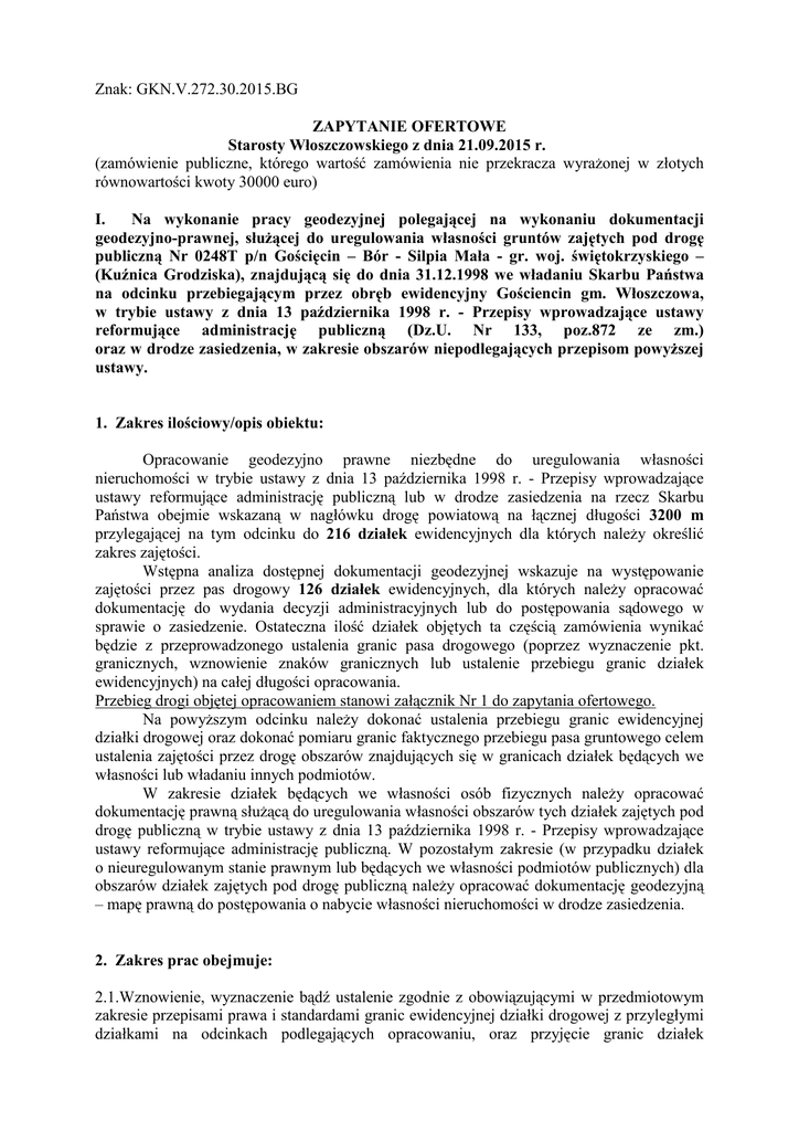 Znak: GKN.V.272.30.2015.BG ZAPYTANIE OFERTOWE Starosty Włoszczowskiego z dnia 21.09.2015 r. (zamówienie publiczne, którego wartość zamówienia nie przekracza wyrażonej w złotych równowartości kwoty 30000 euro) I. Na wykonanie pracy geodezyjnej polegającej na wykonaniu dokumentacji geodezyjno-prawnej, służącej do uregulowania własności gruntów zajętych pod drogę publiczną Nr 0248T p/n Gościęcin – Bór - Silpia Mała - gr. woj. świętokrzyskiego – (Kuźnica Grodziska), znajdującą się do dnia 31.12.1998 we władaniu Skarbu Państwa na odcinku przebiegającym przez obręb ewidencyjny Gościencin gm. Włoszczowa, w trybie ustawy z dnia 13 października 1998 r. - Przepisy wprowadzające ustawy reformujące administrację publiczną (Dz.U. Nr 133, poz.872 ze zm.) oraz w drodze zasiedzenia, w zakresie obszarów niepodlegających przepisom powyższej ustawy. 1. Zakres ilościowy/opis obiektu: Opracowanie geodezyjno prawne niezbędne do uregulowania własności nieruchomości w trybie ustawy z dnia 13 października 1998 r. - Przepisy wprowadzające ustawy reformujące administrację publiczną lub w drodze zasiedzenia na rzecz Skarbu Państwa obejmie wskazaną w nagłówku drogę powiatową na łącznej długości 3200 m przylegającej na tym odcinku do 216 działek ewidencyjnych dla których należy określić zakres zajętości. Wstępna analiza dostępnej dokumentacji geodezyjnej wskazuje na występowanie zajętości przez pas drogowy 126 działek ewidencyjnych, dla których należy opracować dokumentację do wydania decyzji administracyjnych lub do postępowania sądowego w sprawie o zasiedzenie. Ostateczna ilość działek objętych ta częścią zamówienia wynikać będzie z przeprowadzonego ustalenia granic pasa drogowego (poprzez wyznaczenie pkt. granicznych, wznowienie znaków granicznych lub ustalenie przebiegu granic działek ewidencyjnych) na całej długości opracowania. Przebieg drogi objętej opracowaniem stanowi załącznik Nr 1 do zapytania ofertowego. Na powyższym odcinku należy dokonać ustalenia przebiegu granic ewidencyjnej działki drogowej oraz dokonać pomiaru granic faktycznego przebiegu pasa gruntowego celem ustalenia zajętości przez drogę obszarów znajdujących się w granicach działek będących we własności lub władaniu innych podmiotów. W zakresie działek będących we własności osób fizycznych należy opracować dokumentację prawną służącą do uregulowania własności obszarów tych działek zajętych pod drogę publiczną w trybie ustawy z dnia 13 października 1998 r. - Przepisy wprowadzające ustawy reformujące administrację publiczną. W pozostałym zakresie (w przypadku działek o nieuregulowanym stanie prawnym lub będących we własności podmiotów publicznych) dla obszarów działek zajętych pod drogę publiczną należy opracować dokumentację geodezyjną – mapę prawną do postępowania o nabycie własności nieruchomości w drodze zasiedzenia. 2. Zakres prac obejmuje: 2.1.Wznowienie, wyznaczenie bądź ustalenie zgodnie z obowiązującymi w przedmiotowym zakresie przepisami prawa i standardami granic ewidencyjnej działki drogowej z przyległymi działkami na odcinkach podlegających opracowaniu, oraz przyjęcie granic działek przyległych do drogi powiatowej w zakresie niezbędnym do wykonania projektów podziałów działek, zmierzających do wykazania w opracowanej dokumentacji nowych granic nieruchomości, zgodnych z faktycznym zajęciem nieruchomości pod pas drogowy. O czynnościach „ granicznych” należy zgodnie z art. 32 Prawa geodezyjnego i kartograficznego powiadomić uczestników postępowania a z ich przeprowadzenia sporządzić właściwe protokoły. 2.2. Ustalenie faktycznego zasięgu zajętości gruntów pod pas drogowy z uwzględnieniem przepisów Ustawy o drogach publicznych, zgodnego ze stanem na dzień 31.12.1998. Wykonawca po wstępnym ustaleniu na gruncie zakresu zajętości działek pod pas drogowy wskaże ten zakres Zamawiającemu, w celu dokonania ewentualnych korekt uwzględniających uwagi Zamawiającego. Z czynności określenia faktycznej granicy zajęcia nieruchomości pod pas drogowy należy sporządzić oddzielny protokół. Protokół powinien być zredagowany w formie tabelarycznej, z odrębnymi wierszami dla poszczególnych działek. Powinien zawierać informacje o sposobie ustalenia granicy zajętości pasa drogowego na dzień 31.12.1998 r. dla poszczególnych działek, ewentualne oświadczenia właścicieli nieruchomości zajętych, informacje o właścicielu działki na dzień 31.12.1998 r. lub o jego ewentualnych następcach prawnych, podpis geodety uprawnionego dokonującego czynności ustalenia oraz ewentualne podpisy zainteresowanych stron. O terminie dokonywania w terenie czynności zmierzających do sporządzenia powyższego protokołu Wykonawca zawiadomi Zamawiającego. Wykonawca opracuje i przekaże Zamawiającemu mapę przeglądową wykazującą w postaci szrafur na tle przebiegu drogi, działki dla których stwierdzono zajętość przez pas drogowy i wskazującą, które z tych działek regulowane będą w trybie art. 73 a które w drodze zasiedzenia. Celem ustalenia zakresu zajętości pasa drogowego na dzień 31.12.1998 r. Wykonawca pozyska konieczne informacje w wyniku wywiadu terenowego, analizy sposobu i trwałości zagospodarowania pasa drogowego, oświadczeń właścicieli nieruchomości. Wykonawcy w tym celu udostępnione zostaną także przez Zamawiającego, zebrane dotychczas informacje i dokumenty potwierdzające władanie guntem/drogą. Udostępnione zostaną także archiwalne dokumenty i mapy znajdujące się w PZGiK, umożliwiające sprawdzenie wykazania stanu zagospodarowania opracowywanego obszaru na materiałach kartograficznych pochodzących z przełomu roku 1998 i 1999. 2.3.Opracowanie na podstawie powyżej wykonanych czynności projektu podziału działek pierwotnych, z wykazaniem nowej linii granicznej zgodnej z granicą nabyc