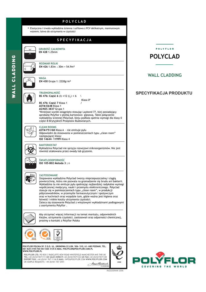 P O LY C LAD • Elastyczna i trwała wykładzina ścienna i sufitowa z PCV delikatnym, marmurowym wzorem; łatwa do utrzymania w czystości SPECYFIKACJA GRUBOŚĆ CAŁKOWITA EN 428 1.25mm POLYCLAD ROZMIAR ROLKI EN 426 1.83m X 30m = 54.9m² WALL CLADDING WAGA EN 430 Grupa 1: 2220g/m² TRUDNOPALNOŚĆ BS 476: Część 6 (I) <12 (i1) < 6 SPECYFIKACJA PRODUKTU \ Klasa 0* BS 476: Część 7 Klasa 1 / ASTM E648 Klasa 1 AS/NZS 3837 Grupa 1 *Niniejsze wyniki osiągnięto stosując Laybond 77, klej posiadający aprobatę Polyflor z płytką kartonowo- gipsową. Takie połączenie wykładziny ściennej Polyclad, kleju podłoża spełnia wymogi dla klasy 0 części B Brytyjskich Przepisów Budowlanych. CLEAN ROOMS ASTM F51/68 Klasa A - nie emituje pyłu Odpowiedni do stosowania w pomieszczeniach typu „clean room” następującej klasy: ISO 14644- 11999 Klasa 4 BAKTERIOSTAT Wykładzina Polyclad nie sprzyja rozwojowi mikroorganizmów. Nie jest również atakowana przez owady lub gryzonie. ŚWIATŁOODPORNOŚĆ ISO 105-B02 Metoda 3 ≥ 6 ZASTOSOWANIE Zespawana wykładzina Polyclad tworzy nieprzepuszczalną i ciągłą powierzchnię, która nie pozwala na gromadzenie się brudu ani bakterii. Wykładzina ta nie emituje pyłu spełniając najbardziej radykalne wymogi współczesnej medycyny, nauki i przemysłu elektronicznego. Polyclad stosuje się w pomieszczeniach typu „clean room”, w produkcji półprzewodników, w przemyśle farmaceutycznym i spożywczym oraz w kuchniach oraz wszędzie tam, gdzie ważna jest higiena oraz łatwość i niskie koszty utrzymania czystości. Zaleca się stosowanie Polyclad z winylowymi wykładzinami podłogowymi z asortymentu Polyflor . Aby otrzymać więcej informacji na temat montażu, odpowiednich klejów, utrzymania czystości, zastosowań oraz odporności chemicznej, prosimy o kontakt z Polyflor Polska POLYFLOR POLSKA SP. Z O.O. UL. GRONOWA 22 LOK. 506- 510, 61- 680 POZNAŃ, TEL. 061 820 3155 FAX 061 820 3135 E-MAIL: [email protected] WWW.POLYFLOR.PL POLYFLOR LTD. PO BOX 3 RADCLIFFE NEW ROAD WHITEFIELD MANCHESTER M45 7NR UK TEL:+44 (0)1617671111 UK SALES DIRECT:+44 (0)1617671122 UK FAX:+44 (0)1617671128 EXPORT FAX: +44 (0)161 767 11 66 E-MAIL: [email protected] WWW.POLYFLOR.COM UK SAMPLE REQUESTS: +44 (0)161 767 2551 PAŹDZIERNIK 2006 WALL CLADDING Polyclad PU TOUGH, DURABLE AND FLEXIBLE VINYL WALL AND CEILING CLADDING FEATURING THE PROTECTION OF A POLYURETHANE SURFACE TREATMENT Champagne PC10 Soft Ivory PC1 Glacier PC4 Wedgewood PC3 Frosted Mint PC2 Pewter Grey PC11 KEY FEATURES SPECIFICATIONS Wall and ceiling cladding sheet featuring a subtle marbleised decoration. GAUGE: 1.25mm Polyurethane surface treatment provides benefits in terms of hygiene and ease of maintenance. AVAILABILITY: Sheet Designed to be welded to Polyflor floorcoverings, to provide a floor-to-wall surface that provides an excellent barrier to dirt and infection. Ideal for wet and hygiene-critical areas. 100% RECYCLABLE 25% RECYCLED MATERIAL Please note: due to limitations of colour printing, actual samples should be seen before colour selection is made. 40