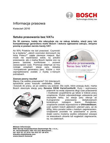 Informacja prasowa Kwiecień 2016 Sztuka prasowania bez VATu Do 30 czerwca, każdy kto zdecyduje się na zakup żelazka, stacji pary lub kompaktowego generatora marki Bosch i dokona zgłoszenia zakupu, otrzyma premię w postaci zwrotu kwoty VAT. Aż 50% Polaków nie lubi prasować. Czynność ta w badaniu* „Jakich czynności domowych nie lubią Polacy?” zajęła pierwsze miejsce. Być może nie wyobrażasz sobie, by polubić prasowanie, ale z marką Bosch będzie ono na pewno bardziej komfortowe i pozwoli zaoszczędzić czas. Promocja obejmuje aż trzy rodzaje urządzeń: stacje pary, żelazka i kompaktowe generatory pary. Każde z nich zaprojektowane zostało z myślą o różnych potrzebach. Zawsze pewny rezultat Męczy Cię wielkie prasowanie? Od dziecięcych śpioszków przez koszulki nastolatka, żakiet i koszule do pracy, aż po zasłony czy pościel. Dla osób, które prasują dużo, marka Bosch stworzyła stację pary Sensixx DS38 VarioComfort9. Duży i wyjmowany pojemnik na wodę zapewnia długi czas prasowania i możliwość uzupełnienia go także w trakcie pracy urządzenia. Wybór odpowiedniego ustawienia jest niezwykłe łatwy, bo stacja pary oferuje aż 8 programów prasowania dedykowanych konkretnym rodzajom tkanin. Dodatkowo, urządzenie zostało wyposażone w UltimateSteam, czyli system trzech głębokich uderzeń pary, aż do 400g, który poradzi sobie z każdym zagnieceniem. Urządzenie pozwala na prasowanie w pionie, dzięki czemu możemy szybko odświeżyć wiszące na wieszakach ubrania lub wygładzić zagniecenia, np. na zasłonach. Bliższe informacje: BSH Sprzęt Gospodarstwa Domowego Sp. z o.o., Al. Jerozolimskie 183; 02-222 Warszawa , tel. 022 57 27 674; fax 022 57 26 674 [email protected] www.bosch-home.pl Bez zagnieceń – bez wysiłku Kompaktowy generator pary marki Bosch to urządzenie dla osób, które cenią sobie oszczędność miejsca. Szybki i zawsze pewny rezultat prasowania zapewnia wbudowany silnik MotorSteam, który wytwarza o wiele więcej pary i zapewnia jej głębokie przenikanie. Nowym ubraniom odcinamy metki, a każde wymaga innej temperatury prasowania: koszule, jeansy, koszulki, czy w końcu delikatne bluzki. Funkcja i-Temp Advanced, zastosowana w kompaktowym generatorze pary TDI903231A to odpowiednie i bezpieczne dla wszystkich tkanin ustawienie temperatury oraz pary. Dzięki temu możemy skutecznie prasować ubrania w dowolnej kolejności i bez względu na materiał. Moc w parze z bezpieczeństwem Zdarza Ci się prasować w pośpiechu? Żelazko z czujnikiem dotyku SensorSecure działa tylko wtedy, kiedy trzymasz je w ręku. Dlatego, jeśli prasujesz w ostatniej chwili i po wyjściu z domu nie pamiętasz czy wyłączyłeś żelazko, będziesz mógł czuć się spokojnie. Gdy tylko zdejmiesz dłoń z uchwytu, nastąpi automatyczne odłączenie zasilania. Gwarancja bezpieczeństwa to nie wszystko, bo rozwiązanie to oszczędza także energię. Dodatkowo, ceramiczna stopa CeraniumGlissee posiada wyjątkowe właściwości ślizgowe i dużą odporność na zarysowania, dzięki czemu szybko wyprasujemy nawet najbardziej wygniecioną koszulę. Marzysz o pomocniku domowym najwyższej jakości? Skorzystaj z promocji i do 7 lipca br. zgłoś zakup urządzenia zgodnie ze wskazówkami na stronie www.bosch-home.pl. Wartość VAT zostanie zwrócona na konto bankowe podane w zgłoszeniu. Promocja trwa do 30 czerwca br. lub do wyczerpania puli premii. Pełny regulamin i lista sprzętów objętych promocją dostępne są tutaj. Liczba znaków ze spacjami: 3153 *W tekście wykorzystano badanie: Jakich czynności domowych nie lubią Polacy, przygotowane przez ICAN Research na zlecenie Blue Media, http://www.bluemedia.pl/. Bliższe informacje: BSH Sprzęt Gospodarstwa Domowego Sp. z o.o., Al. Jerozolimskie 183; 02-222 Warszawa , tel. 022 57 27 674; fax 022 57 26 674 [email protected] www.bosch-home.pl Przykładowe urządzenia biorące udział w promocji: Stacja pary Kompaktowy generator Żelazko Model: TDS3831100 Model: TDI903231A Model: TDA703021A – VarioComfort9: łatwy wybór programów – Calc'nClean Perfect: system oczyszczania z kamienia: pierwszy zarówno dla stacji jak i samego żelazka – i-Temp Advanced – gotowość do pracy w ciągu 2 min – AntiShine: ochrona przed wybłyszczeniem – SecureLock System: blokada żelazka dla większego bezpieczeństwa podczas przechowywania/przenoszenia Cena: 1 079 zł – MotorSteam: wbudowany kompaktowy silnik wspomagający wytwarzanie stałej, dużej ilości pary – i-Temp Advanced – wyświetlacz TempOK informujący o ustawieniach temperatury – duży zbiornik na wodę 400 ml – SensorSteam w uchwycie żelazko grzeje i produkuje parę tylko wtedy, gdy trzyma się je w ręku Cena: 439 zł Bliższe informacje: BSH Sprzęt Gospodarstwa Domowego Sp. z o.o., Al. Jerozolimskie 183; 02-222 Warszawa , tel. 022 57 27 674; fax 022 57 26 674 [email protected] www.bosch-home.pl – stopa trójfazowa CeraniumGlissée - idealna dystrybucja pary i doskonałe właściwości ślizgowe – system SensorSecure – blokada kapania w niskich temperaturach – duży zbiornik na wodę 380 ml Cena: 339 zł