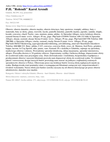 Adres URL strony http://www.adresyfirm.net/68647 P.H. "Rolendt" Karol Arendt Gdańsk, 80-299, woj. pomorskie Ulica: Galaktyczna 37 Telefon: 583427798, 660000222 Fax: 585221349 Strona www: http://www.eastend.pl Obuwie: obuwie damskie, obuwie męskie, obuwie dziecięce, buty sportowe, trampki, adidasy, buty z materiału, buty ze skóry, glany, trzewiki, laczki, pantofle damskie, pantofle męskie, japonki, sandały, klapki, kozaki, converse, chuck Taylor, vans, martens, puma, adidas. A) Sprzedaż Allegro, nowe kolekcje obuwia, eastend Strona O mnie: www. Allegro. Pl my_page. Php?uid=1554694 Telefon: 696 222 660, b) Sprzedaż Allegro, okazje, eastend_okazje Strona O mnie: www. Allegro. Pl my_page. Php?uid=6467396 Telefon: 660 200 800, c) Sprzedaż Allegro, ciuchy, eastend_ciuchy Strona O mnie: www. Allegro. Pl my_page. Php?uid=3016275&showing_type=gtext&order=t&listing_sel=2&listing_interval=7&nolimit=1&order=t Telefon: 660 000 222. Buty: adidas, CAT, converse, converse Kids, crocs, dr. Martens, fred Perry, grinders, kappa, lacoste, le Coq Sportif, nike, puma, vans. Eastend. Pl z siedzibą w Gdańsku, zajmuje się sprzedażą markowego obuwia i odzieży. Prowadzimy sprzedaż detaliczną, sklep stacjonarny, sprzedaż internetowa, allegro. Przesyłka dociera w 24 godziny robocze. Zapewniamy szybką i fachową obsługę, dopasowanie oferty do oczekiwań rynku oraz przystępne ceny. Duże doświadczenie i wieloletnia, bezpośrednia współpraca z producentami obuwia i naszymi klientami pozwala nam dopasować ofertę do oczekiwań rynku. To właśnie jakość i nowoczesny design naszych butów pozwalają nam stawać się jednym z najbardziej cenionych sprzedawców obuwia w Polsce. Oferowane przez nas kolekcje butów tworzą ofertę najlepszych marek na rynku. Budują trwałą więź pomiędzy nimi a wymagającymi klientami ceniącymi styl, niepowtarzalność i trwałość wykonania. Nasza oferta jest bardzo szeroka zaczyna się od obuwia dziecięcego po przez obuwie młodzieżowe, damskie oraz męskie. Kategorie: Odzież i tekstylia Gdańsk, Obuwie - hurt Gdańsk, Obuwie - detal Gdańsk Słowa kluczowe: martens, converse, buty, vans Numer ID: 68647, liczba odsłon: 271, aktywacja: 15/12/2010 06:54:42, edycja: 15/12/2010 06:54:42 Strona 1 / 1