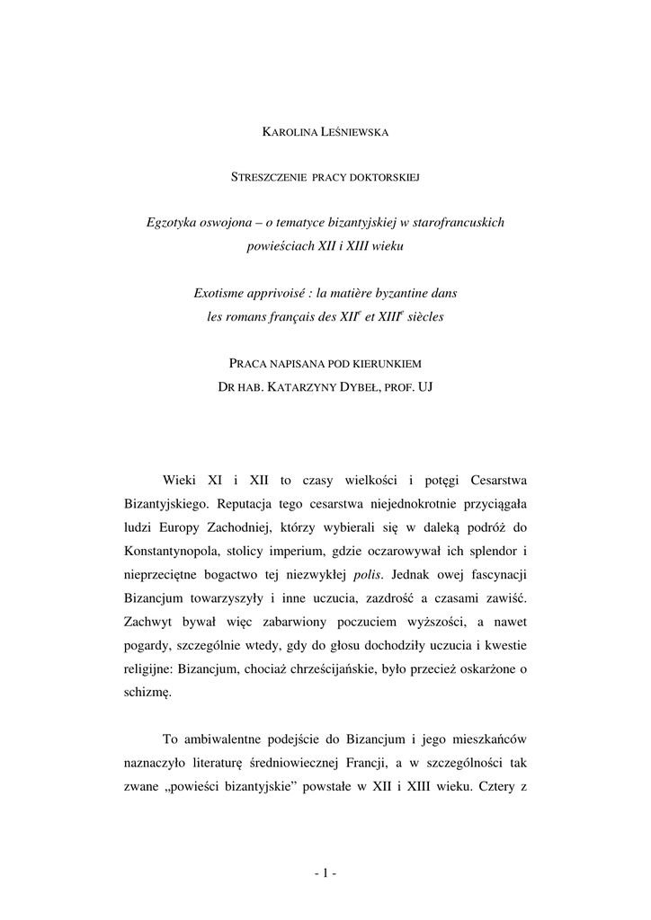 KAROLINA LEŚNIEWSKA STRESZCZENIE PRACY DOKTORSKIEJ Egzotyka oswojona – o tematyce bizantyjskiej w starofrancuskich powieściach XII i XIII wieku Exotisme apprivoisé : la matière byzantine dans les romans français des XIIe et XIIIe siècles PRACA NAPISANA POD KIERUNKIEM DR HAB. KATARZYNY DYBEŁ, PROF. UJ Wieki XI i XII to czasy wielkości i potęgi Cesarstwa Bizantyjskiego. Reputacja tego cesarstwa niejednokrotnie przyciągała ludzi Europy Zachodniej, którzy wybierali się w daleką podróż do Konstantynopola, stolicy imperium, gdzie oczarowywał ich splendor i nieprzeciętne bogactwo tej niezwykłej polis. Jednak owej fascynacji Bizancjum towarzyszyły i inne uczucia, zazdrość a czasami zawiść. Zachwyt bywał więc zabarwiony poczuciem wyższości, a nawet pogardy, szczególnie wtedy, gdy do głosu dochodziły uczucia i kwestie religijne: Bizancjum, chociaż chrześcijańskie, było przecież oskarżone o schizmę. To ambiwalentne podejście do Bizancjum i jego mieszkańców naznaczyło literaturę średniowiecznej Francji, a w szczególności tak zwane „powieści bizantyjskie” powstałe w XII i XIII wieku. Cztery z -1- nich wydają się pod tym względem szczególnie ciekawe: dwunastowieczne powieści Partonopeu z Blois (Partonopeu de Blois) anonimowego autorstwa, Klidżes (Cligès) napisany przez Chrétiena de Troyes, Powieść o Herakliuszu (Eracle) autorstwa Gautiera z Arras oraz trzynastowieczna powieść Floriant i Florete (Floriant et Florete), również nieznanego autorstwa. Akcja tych powieści toczy się zarówno na Zachodzie Europy jak i na bizantyjskim Wschodzie, reprezentowanym najczęściej przez Konstantynopol. W każdej z powieści dochodzi do zetknięcia się postaci pochodzących z tych dwóch odległych cywilizacji. Można więc uznać te teksty za przestrzeń spotkania i wymiany. Tajemnicze regiony Orientu postrzegane były w czasach średniowiecza jako świat egzotyczny i zaskakujący dla ludzi Zachodu. Jednak inność Bizancjum w analizowanych tekstach literackich wydaje się mniej onieśmielająca niż mogłoby się to wydawać, a autorzy interesujących nas tutaj powieści wskazują na drogi prowadzące do oswojenia wizerunku Bizancjum i Konstantynopola. W epoce średniowiecza dystans geograficzny pomiędzy Zachodem a bizantyjskim Wschodem był głównym powodem kulturowej przepaści dzielącej te dwie cywilizacje. Pomimo trudów podróżowania i długości wypraw na Wschód autorzy analizowanych powieści dostarczają bardzo mało konkretnych i szczegółowych informacji na temat samych podróży. Mamy tu raczej do czynienia z nakreśleniem poczucia odległości i oddalenia poprzez rozwinięcie całej serii toponimów. Mogą się one odnosić zarówno do Zachodu (Londyn, Blois), do Wschodu (Konstantynopol, Jerozolima), jak i do legendarnych, -2- antycznych czy nawet wyimaginowanych miejsc (Teby, Chef d’Oire). Chociaż większość toponimów pojawia się w tekstach w kontekście pochodzenia poszczególnych, często drugoplanowych postaci, pozwalają one na stworzenie wizji rozległego, szerokiego świata, w którym Konstantynopol odgrywa wyjątkową rolę. Stolica ta jest obecna we wszystkich analizowanych powieściach, a jej literackie przedstawienia świadczą o dużej oryginalności autorów. Czasami opisują oni Konstantynopol udając, że odnoszą się do innego miasta, o większej chwale, jak w przypadku powieści Powieści o Herakliuszu, gdzie bizantyjska stolica ukrywa się pod nazwą Rzymu. Zdarza się też, że Konstantynopolowi nadawana jest wymyślona nazwa – jak w powieści Partonopeu z Blois, tam Konstantynopol odnajdujemy pod nazwą Chef d’Oire. Ten dwuznaczny status miasta jeszcze lepiej oddaje problem dystansu międzykulturowego. Istnieje jednak pewien element świata przedstawionego, który pozwoli ten dystans pokonać i zbliżyć się do orientalnej przestrzeni. Tym elementem jest morze, które staje się miejscem spotkania i możliwego zjednoczenia dwóch światów. Bogactwo tego motywu jest szczególnie widoczne w powieści Partonopeu z Blois gdzie morze pojawia się zawsze wtedy, gdy rycerz z Blois i Melior, dziedziczka Cesarstwa Bizantyjskiego, mają się spotkać lub rozstać. Morskie przestrzenie są zarezerwowane dla ich miłości. Warto też zauważyć, że samo słowo „morze” nie pojawi się nigdy w kontekście podróży innych postaci. Ciągle na nowo podejmowane przez Partonopeu trudy podróży zamorskich przybliżają stopniowo Zachód i Wschód, aż bohaterowie pobiorą się i zagwarantują polityczną unię między Blois i Bizancjum. -3- Bizancjum jednak ciężko dosięgnąć nie tylko ze względu na jego oddalenie w przestrzeni. Przyczyną dodatkowych trudności okazuje się niedostępność architektury i bogactw. Co ciekawe analizowane powieści zawierają tylko nieliczne elementy typowego opisu miasta. Najbardziej rozpoznawalną budowlą orientalnego krajobrazu jest tutaj wieża. Pojawia się ona we wszystkich tekstach nadając w ten sposób Konstantynopolowi wertykalny charakter oraz sprawiając wrażenie, że miasto jest nieosiągalne. Motyw ten pozwala jednak również na interpretację świata Bizancjum, postrzeganego jako dumny, a jednocześnie skłonny do ukrywania rzeczywistości, nacechowany słabością i erotyzmem. Te elementy mogą być uznane za literacką transpozycję sposobu w jaki ludzie Zachodu patrzyli na mieszkańców Bizancjum. Chociaż opisy kościołów, murów obronnych, czy pałaców bazujące na spojrzeniu z zewnątrz są raczej skąpe, to autorom analizowanych powieści udaje się pokazać dostatek miasta poprzez skupienie się na opisach luksusu jego pomniejszych elementów. Koncentrują się oni szczególnie na kamieniach szlachetnych, które stanowiły istotny atrybut Orientu, nie tylko w bizantyjskim wydaniu. W tekstach literackich kamienie szlachetne przede wszystkim umacniają wrażenie bogactwa i piękna stolicy cesarstwa. Jednocześnie są też wyrazem oceny, czy wr