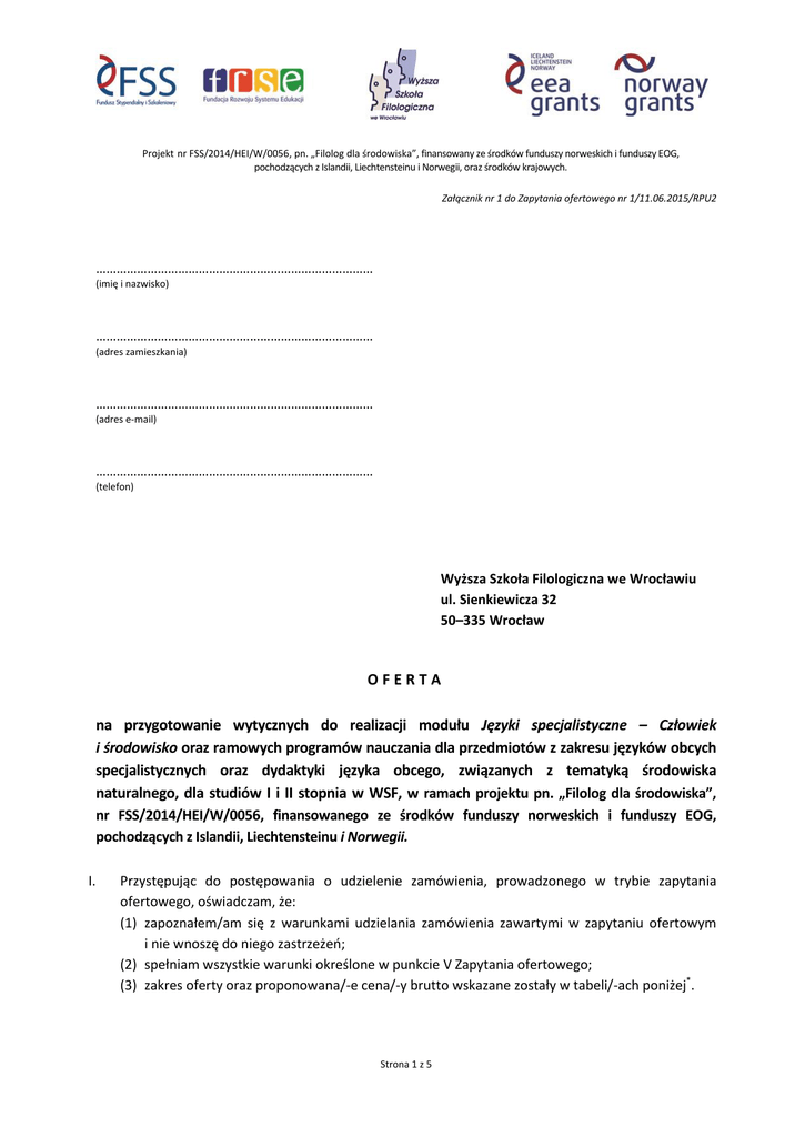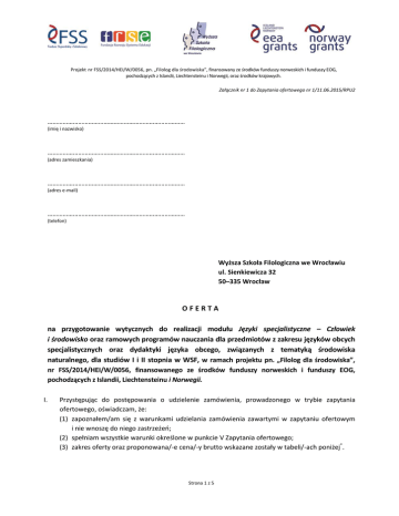 Projekt nr FSS/2014/HEI/W/0056, pn. „Filolog dla środowiska”, finansowany ze środków funduszy norweskich i funduszy EOG, pochodzących z Islandii, Liechtensteinu i Norwegii, oraz środków krajowych. Załącznik nr 1 do Zapytania ofertowego nr 1/11.06.2015/RPU2 ……………………………………………………………………… (imię i nazwisko) ……………………………………………………………………… (adres zamieszkania) ……………………………………………………………………… (adres e-mail) ……………………………………………………………………… (telefon) Wyższa Szkoła Filologiczna we Wrocławiu ul. Sienkiewicza 32 50–335 Wrocław OFERTA na przygotowanie wytycznych do realizacji modułu Języki specjalistyczne – Człowiek i środowisko oraz ramowych programów nauczania dla przedmiotów z zakresu języków obcych specjalistycznych oraz dydaktyki języka obcego, związanych z tematyką środowiska naturalnego, dla studiów I i II stopnia w WSF, w ramach projektu pn. „Filolog dla środowiska”, nr FSS/2014/HEI/W/0056, finansowanego ze środków funduszy norweskich i funduszy EOG, pochodzących z Islandii, Liechtensteinu i Norwegii. I. Przystępując do postępowania o udzielenie zamówienia, prowadzonego w trybie zapytania ofertowego, oświadczam, że: (1) zapoznałem/am się z warunkami udzielania zamówienia zawartymi w zapytaniu ofertowym i nie wnoszę do niego zastrzeżeń; (2) spełniam wszystkie warunki określone w punkcie V Zapytania ofertowego; (3) zakres oferty oraz proponowana/-e cena/-y brutto wskazane zostały w tabeli/-ach poniżej*. Strona 1 z 5 Projekt nr FSS/2014/HEI/W/0056, pn. „Filolog dla środowiska”, finansowany ze środków funduszy norweskich i funduszy EOG, pochodzących z Islandii, Liechtensteinu i Norwegii, oraz środków krajowych. Tabela I.1. Cena brutto przygotowania wytycznych do realizacji modułu Języki specjalistyczne – Człowiek i środowisko Zakres prac Proponowana cena brutto Wytyczne do realizacji modułu Człowiek i środowisko, dokument w języku polskim Wytyczne do realizacji modułu Człowiek i środowisko, dokument w języku angielskim Tabela I.2. Cena brutto przygotowania ramowych programów dla przedmiotów z modułu Języki specjalistyczne – Człowiek i środowisko oraz Interdyscyplinarne treści w nauczaniu języka obcego dla filologii angielskiej Zakres prac/Program ramowy dla przedmiotu Proponowana cena brutto Specjalistyczny język angielski – Ziemia i jej zasoby Specjalistyczny język angielski – Ekoturystyka Specjalistyczny język angielski – Ekokomunikacja Specjalistyczny język angielski – Zdrowie i profilaktyka Specjalistyczny język angielski – Green Energy Specjalistyczny język angielski – Prawo i ekopolityka Dydaktyka przedmiotowa – Interdyscyplinarne treści w nauczaniu języka angielskiego, program ramowy dla studiów I stopnia Dydaktyka przedmiotowa – Interdyscyplinarne treści w nauczaniu języka angielskiego, program ramowy dla studiów II stopnia Strona 2 z 5 Projekt nr FSS/2014/HEI/W/0056, pn. „Filolog dla środowiska”, finansowany ze środków funduszy norweskich i funduszy EOG, pochodzących z Islandii, Liechtensteinu i Norwegii, oraz środków krajowych. Tabela I.3. Cena brutto przygotowania ramowych programów dla przedmiotów z modułu Języki specjalistyczne – Człowiek i środowisko oraz Interdyscyplinarne treści w nauczaniu języka obcego dla filologii germańskiej Zakres prac/Program ramowy dla przedmiotu Proponowana cena brutto Specjalistyczny język niemiecki – Ziemia i jej zasoby Specjalistyczny język niemiecki – Ekoturystyka Specjalistyczny język niemiecki – Ekokomunikacja Specjalistyczny język niemiecki – Zdrowie i profilaktyka Specjalistyczny język niemiecki – Green Energy Specjalistyczny język niemiecki – Prawo i ekopolityka Dydaktyka przedmiotowa – Interdyscyplinarne treści w nauczaniu języka niemieckiego, program ramowy dla studiów I stopnia Dydaktyka przedmiotowa – Interdyscyplinarne treści w nauczaniu języka niemieckiego, program ramowy dla studiów II stopnia Strona 3 z 5 Projekt nr FSS/2014/HEI/W/0056, pn. „Filolog dla środowiska”, finansowany ze środków funduszy norweskich i funduszy EOG, pochodzących z Islandii, Liechtensteinu i Norwegii, oraz środków krajowych. Tabela I.4. Cena brutto przygotowania ramowych programów dla przedmiotów z modułu Języki specjalistyczne – Człowiek i środowisko oraz Interdyscyplinarne treści w nauczaniu języka obcego dla filologii hiszpańskiej Zakres prac/Program ramowy dla przedmiotu Proponowana cena brutto Specjalistyczny język hiszpański – Ziemia i jej zasoby Specjalistyczny język hiszpański – Ekoturystyka Specjalistyczny język hiszpański – Ekokomunikacja Specjalistyczny język hiszpański – Zdrowie i profilaktyka Specjalistyczny język hiszpański – Green Energy Specjalistyczny język hiszpański – Prawo i ekopolityka Dydaktyka przedmiotowa – Interdyscyplinarne treści w nauczaniu języka hiszpańskiego, program ramowy dla studiów I stopnia Dydaktyka przedmiotowa – Interdyscyplinarne treści w nauczaniu języka hiszpańskiego, program ramowy dla studiów II stopnia Strona 4 z 5 Projekt nr FSS/2014/HEI/W/0056, pn. „Filolog dla środowiska”, finansowany ze środków funduszy norweskich i funduszy EOG, pochodzących z Islandii, Liechtensteinu i Norwegii, oraz środków krajowych. Tabela I.5. Cena brutto przygotowania ramowych programów dla przedmiotów z modułu Języki specjalistyczne – Człowiek i środowisko oraz Interdyscyplinarne treści w nauczaniu języka obcego dla filologii włoskiej Zakres prac/Program ramowy dla przedmiotu Proponowana cena brutto Specjalistyczny język włoski– Ziemia i jej zasoby Specjalistyczny język włoski – Ekoturystyka Specjalistyczny język włoski– Ekokomunikacja Specjalistyczny język włoski – Zdrowie i profilakt