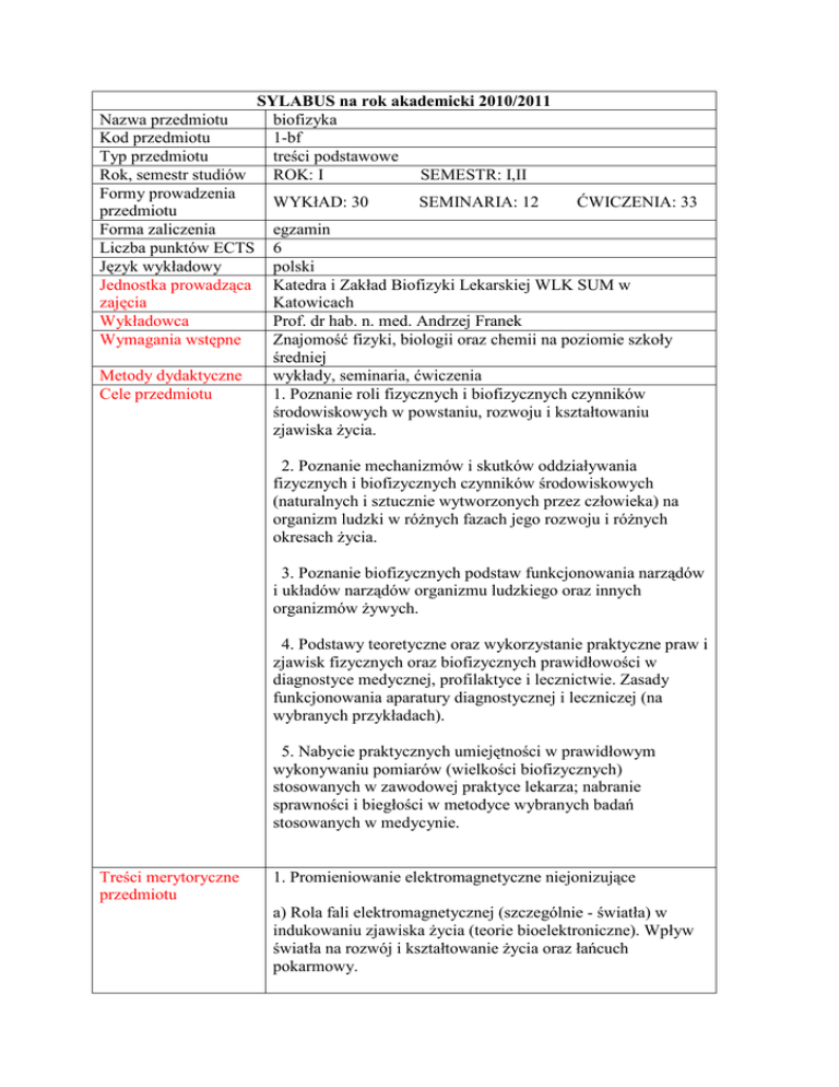 SYLABUS biofizyka 2011 - Katedra i Zakład Biofizyki Lekarskiej