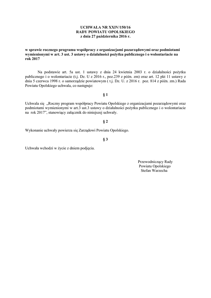 UCHWAŁA NR XXIV/150/16 RADY POWIATU OPOLSKIEGO z dnia 27 października 2016 r. w sprawie rocznego programu współpracy z organizacjami pozarządowymi oraz podmiotami wymienionymi w art. 3 ust. 3 ustawy o działalności pożytku publicznego i o wolontariacie na rok 2017 Na podstawie art. 5a ust. 1 ustawy z dnia 24 kwietnia 2003 r. o działalności pożytku publicznego i o wolontariacie (t.j. Dz. U z 2016 r., poz.239 z późn. zm) oraz art. 12 pkt 11 ustawy z dnia 5 czerwca 1998 r. o samorządzie powiatowym ( t.j. Dz. U. z 2016 r. poz. 814 z późn. zm.) Rada Powiatu Opolskiego uchwala, co następuje: §1 Uchwala się „Roczny program współpracy Powiatu Opolskiego z organizacjami pozarządowymi oraz podmiotami wymienionymi w art.3 ust.3 ustawy o działalności pożytku publicznego i o wolontariacie na rok 2017”, stanowiący załącznik do niniejszej uchwały. §2 Wykonanie uchwały powierza się Zarządowi Powiatu Opolskiego. §3 Uchwała wchodzi w życie z dniem podjęcia. Przewodniczący Rady Powiatu Opolskiego Stefan Warzecha