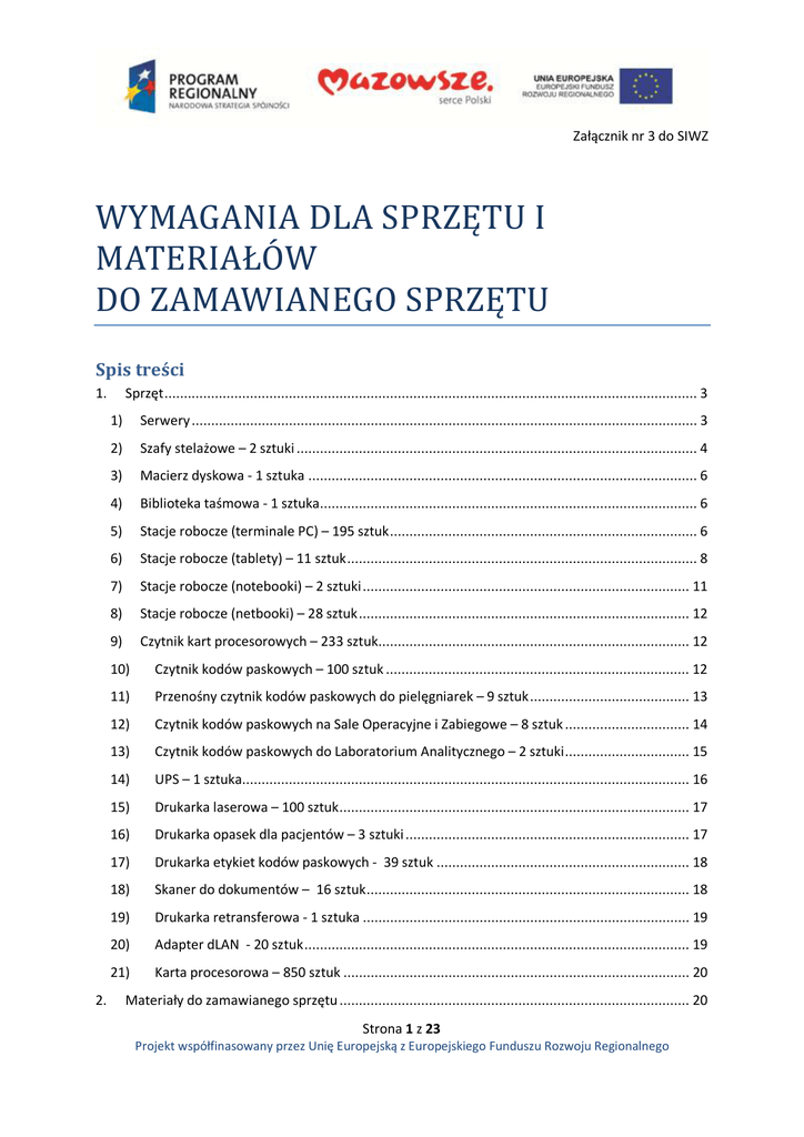 Załącznik nr 3 do SIWZ WYMAGANIA DLA SPRZĘTU I MATERIAŁOW DO ZAMAWIANEGO SPRZĘTU Spis treści 1. 2. Sprzęt ......................................................................................................................................... 3 1) Serwery .................................................................................................................................. 3 2) Szafy stelażowe – 2 sztuki ....................................................................................................... 4 3) Macierz dyskowa - 1 sztuka .................................................................................................... 6 4) Biblioteka taśmowa - 1 sztuka................................................................................................. 6 5) Stacje robocze (terminale PC) – 195 sztuk ............................................................................... 6 6) Stacje robocze (tablety) – 11 sztuk .......................................................................................... 8 7) Stacje robocze (notebooki) – 2 sztuki .................................................................................... 11 8) Stacje robocze (netbooki) – 28 sztuk ..................................................................................... 12 9) Czytnik kart procesorowych – 233 sztuk................................................................................ 12 10) Czytnik kodów paskowych – 100 sztuk .............................................................................. 12 11) Przenośny czytnik kodów paskowych do pielęgniarek – 9 sztuk ......................................... 13 12) Czytnik kodów paskowych na Sale Operacyjne i Zabiegowe – 8 sztuk ................................ 14 13) Czytnik kodów paskowych do Laboratorium Analitycznego – 2 sztuki ................................ 15 14) UPS – 1 sztuka................................................................................................................... 16 15) Drukarka laserowa – 100 sztuk .......................................................................................... 17 16) Drukarka opasek dla pacjentów – 3 sztuki ......................................................................... 17 17) Drukarka etykiet kodów paskowych - 39 sztuk ................................................................. 18 18) Skaner do dokumentów – 16 sztuk ................................................................................... 18 19) Drukarka retransferowa - 1 sztuka .................................................................................... 19 20) Adapter dLAN - 20 sztuk ................................................................................................... 19 21) Karta procesorowa – 850 sztuk ......................................................................................... 20 Materiały do zamawianego sprzętu .......................................................................................... 20 Strona 1 z 23 Projekt współfinasowany przez Unię Europejską z Europejskiego Funduszu Rozwoju Regionalnego 1) Opaski dla dorosłych – 50 opakowań .................................................................................... 20 2) Opaski dla dzieci – 10 opakowań .......................................................................................... 20 3) Opaski dla noworodków – 10 opakowań ............................................................................... 21 4) Folia winylowa do etykiet termotransferowych do zastosowań do inwentaryzacji środków trwałych – 10 opakowań .............................................................................................................. 21 5) Kalka do etykiet termotransferowych do zastosowań do inwentaryzacji środków trwałych – 10 opakowań .................................................................................................................................... 21 6) Folia poliestrowya do etykiet termotransferowych do zastosowania do badań laboratoryjnych – 10 opakowań ............................................................................................................................. 22 7) Folia poliestrowa do etykiet termotransferowych do zastosowania do badań laboratoryjnych – 10 opakowań ............................................................................................................................. 22 8) Folia poliestrowa do etykiet termotransferowych do zastosowania w Aptece Szpitalnej i do oznaczania dokumentacji – 10 opakowań ..................................................................................... 22 9) Taśmy do etykiet termotransferowych do zastosowania w Aptece Szpitalnej i do oznaczania dokumentacji – 10 opakowań ....................................................................................................... 23 Strona 2 z 23 Projekt współfinasowany przez Unię Europejską z Europejskiego Funduszu Rozwoju Regionalnego 1. Sprzęt 1) Serwery LP. OPIS PARAMETRU 1. Obudowa 2. Macierz dyskowa 3. Moduły obliczeniowe 4. Dyski twarde 5. Zasilanie, chłodzenie, zarządzanie, sieć: WYMAGANY MINIMALNY PARAMETR TECHNICZNY Obudowa do systemów blade z możliwością montowania w szafie RACK 19”. Obudowa musi posiadać miejsce na zamontowanie przynajmniej 6 modułów serwerowych, czterech modułów zasilających, dwóch modułów przełączników Ethernet, dwóch kontrolerów macierzy, jednego modułu zarządzającego, dwóch modułów chłodzenia, zintegrowana macierz dyskowa. Zintegrowana z obudową blade macierz dyskowa umożliwiająca montaż co najmniej 14 dysków twardych 2,5", macierz musi posiadać możliwość pracy z dyskami typu SAS, SATA, SSD. Powinna obsługiwać poziomy RAID 0, 1, 5, 6, 10, 50, 60. Wymagana jest aktywna obsługa współdzielenia wolumenów macierzy pomiędzy serwerami. Minimum 6 dwuprocesorowych moduł