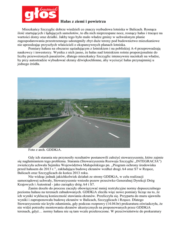 Hałas z ziemi i powietrza Mieszkańcy Szczyglic dobrze wiedzieli co znaczy rozbudowa lotniska w Balicach. Rosnąca ilość startujących i lądujących samolotów, to dla nich nieprzespane noce, rosnący hałas i tracące na wartości domy oraz działki. Jakby tego było mało władze gminy w uchwalonym planie zagospodarowania przestrzennego udostępniły zbyt duże tereny pod budownictwo mieszkaniowe nie uprzedzając przyszłych właścicieli o ekspansywnych planach lotniska. Pomiary hałasu na obszarze sąsiadującym z lotniskiem i na pobliskiej A-4 przeprowadzają naukowcy i inwestorzy. Wynika z nich jasno, że hałas nad lotniskiem rośnie proporcjonalnie do liczby przewożonych pasażerów, dlatego mieszkańcy Szczyglic intensywnie naciskali na władze, by przy autostradzie wybudować ekrany dźwiękochłonne, aby wyciszyć hałas przynajmniej u jednego źródła. Foto z arch. GDDKiA. Gdy ich starania nie przynosiły rezultatów postanowili założyć stowarzyszenie, które zajmie się nagłaśnianiem tego problemu. Starania (Stowarzyszenia Rozwoju Szczyglic „INTEGRACJA”) zwieńczyła uchwała Sejmiku Województwa Małopolskiego pn. „Program ochrony środowiska przed hałasem do 2013 r.”, zakładająca budowę ekranów wzdłuż drogi A4 oraz S7 w Rząsce, Balicach oraz Szczyglicach do końca 2013 roku. Nie widząc jednak jakichkolwiek działań ze strony GDDKiA, w celu realizacji samorządowej uchwały, Stowarzyszenie wniosło pozew przeciwko Generalnej Dyrekcji Dróg Krajowych i Autostrad - jako zarządcy dróg A4 i S7. Zanim doszło do procesu zaczęły obowiązywać mniej restrykcyjne normy dopuszczalnego poziomu hałasu na terenach zabudowanych. GDDKiA zleciła więc nowe pomiary licząc na to, że ich wyniki wykluczą konieczność stawiania ekranów. Przeliczyła się. Przyparta do muru ujawniła wyniki i zaproponowała budowę ekranów w Balicach, Szczyglicach i Rząsce. Dlatego Stowarzyszenie nie kryło zdumienia, gdy podczas rozprawy (14.04.br) prokuratura oświadczyła, że nie widzi potrzeby montowania ekranów akustycznych na proponowanych przez GDDKiA terenach, gdyż… normy hałasu nie są tam wcale przekroczone. W przeciwieństwie do prokuratury Stowarzyszenie posiadało wiedzę na temat ostatnich pomiarów i świadka - kierownika Departamentu Ochrony Środowiska z krakowskiego Oddziału GDDKiA, który nie tylko tę informację potwierdził, ale i scharakteryzował miejsca pomiarów oraz uwarunkowania środowiskowe. Po zaproponowaniu (przez Stowarzyszenie) polubownego zakończenia sporu, sąd wyznaczył trzymiesięczny termin na wypracowanie rozwiązań, które zadowolą obie strony. Stowarzyszenie obawia się jednak usztywnionego stanowiska Generalnej Dyrekcji Dróg Krajowych i Autostrad, która w Balicach i Szczyglicach chce mocno ograniczyć montaż ekranów, pozostawiając bez ochrony szczyglickie osiedle Młynka i duże fragmenty Balic. Jeżeli GDDKiA nie ustąpi, to do ugody nie dojdzie. Ale co dalej? P.S. Liczba pasażerów obsługiwanych przez Port Lotniczy Kraków-Balice stale rośnie. W 2005 roku było ich 1 000 000, w 2007 już 3 100 000. W 2008 roku lotnisko odnotowało 30% spadek liczby pasażerów gdy wycofały się takie linie lotnicze, jak: Sky Europe, Germanwings i Ryanair. Kondycji przewozowej „pomógł” też światowy kryzys finansowy i wywindowane ceny pobytu w Krakowie. W 2012 roku Port Lotniczy Kraków-Balice obsłużył 3,5 mln. pasażerów. Strach pomyśleć jak mieszkańcy przyjmą dodatkowe 4,5 mln. pasażerów gdy rozbudowa lotniska dobiegnie końca - bom docelowo ma obsługiwać 8 mln. pasażerów rocznie!