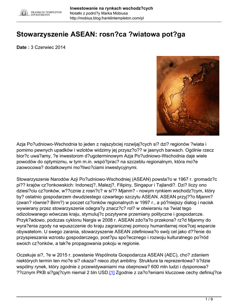Inwestowanie na rynkach wschodz?cych Notatki z podró?y Marka Mobiusa http://mobius.blog.franklintempleton.com/pl Stowarzyszenie ASEAN: rosn?ca ?wiatowa pot?ga Date : 3 Czerwiec 2014 Azja Po?udniowo-Wschodnia to jeden z najszybciej rozwijaj?cych si? dzi? regionów ?wiata i pomimo pewnych upadków i wzlotów widzimy jej przysz?o?? w jasnych barwach. Ogólnie rzecz bior?c uwa?amy, ?e inwestorom d?ugoterminowym Azja Po?udniowo-Wschodnia daje wiele powodów do optymizmu, w tym m.in. wspó?prac? na szczeblu regionalnym, która mo?e zaowocowa? dodatkowymi mo?liwo?ciami inwestycyjnymi. Stowarzyszenie Narodów Azji Po?udniowo-Wschodniej (ASEAN) powsta?o w 1967 r. gromadz?c pi?? krajów cz?onkowskich: Indonezj?, Malezj?, Filipiny, Singapur i Tajlandi?. Dzi? liczy ono dziesi?ciu cz?onków, w??cznie z rosn?c? w si?? Mjanm? - nowym rynkiem wschodz?cym, który by? ostatnio gospodarzem dwudziestego czwartego szczytu ASEAN. ASEAN przyj??o Mjanm? (zwan? równie? Birm?) w poczet cz?onków regionalnych w 1997 r., a pó?niejszy dialog i nacisk wywierany przez stowarzyszenie odegra?y znacz?c? rol? w otwieraniu na ?wiat tego odizolowanego wówczas kraju, stymuluj?c pozytywne przemiany polityczne i gospodarcze. Przyk?adowo, podczas cyklonu Nargis w 2008 r. ASEAN zdo?a?o przekona? rz?d Mjanmy do wyra?enia zgody na wpuszczenie do kraju zagranicznej pomocy humanitarnej nios?cej wsparcie obywatelom. U swego zarania, stowarzyszenie ASEAN zdefiniowa?o swój cel jako d??enie do przyspieszania wzrostu gospodarczego, post?pu spo?ecznego i rozwoju kulturalnego po?ród swoich cz?onków, a tak?e propagowania pokoju w regionie. Oczekuje si?, ?e w 2015 r. powstanie Wspólnota Gospodarcza ASEAN (AEC), cho? zdaniem niektórych termin ten mo?e si? okaza? nieco zbyt ambitny. Struktura ta reprezentowa? b?dzie wspólny rynek, który zgodnie z przewidywaniami ma obejmowa? 600 mln ludzi i dysponowa? ??cznym PKB si?gaj?cym niemal 2 bln USD.[1] Zgodnie z za?o?eniami kluczowe cechy definiuj?ce 1/9 Inwestowanie na rynkach wschodz?cych Notatki z podró?y Marka Mobiusa http://mobius.blog.franklintempleton.com/pl AEC to: (a) jeden rynek i baza produkcyjna, (b) wysoce konkurencyjny region gospodarczy, (c) region sprawiedliwego rozwoju gospodarczego, oraz (d) region w pe?ni zintegrowany z gospodark? ?wiatow?.[2] Harmonizacja integracji finansowej i ekonomicznej oraz przeprowadzenie koniecznych reform, z uwzgl?dnieniem ró?nic kulturowych i politycznych, wi??e si? oczywi?cie z wielkimi wyzwaniami; s?dz? jednak, ?e wyzwaniom tym mo?na stawi? czo?a. W naszej opinii proces formowania si? tej wspólnoty gospodarczej, stanowi?cej blok regionalny przypominaj?cy stref? euro, to ekscytuj?ce zjawisko. Powinno ono umo?liwi? firmom tworzenie zak?adów w dowolnym kraju ASEAN i zapewni? ?atwy dost?p do tych rynków. Transport cz??ci produkowanych w ró?nych krajach ma si? odbywa? bez nadmiernych restrykcji i obci??e? podatkowych, co umo?liwi podniesienie wydajno?ci produkcji. Pomy?lne ukszta?towanie si? Unii Europejskiej stanowi wzór post?powania dla stowarzyszenia i pozwala spo?ecze?stwom krajów ASEAN na wyci?gni?cie nauki z niektórych z problemów, przed którymi stan?li Europejczycy. S?dz?, ?e funkcjonowanie strefy wolnego handlu ASEAN mo?e w d?ugim horyzoncie czasowym doprowadzi? do powstania rynku, którego znaczenie b?dzie pod pewnymi wzgl?dami porównywalne z rynkiem chi?skim, a rozszerzenie regionalnej wymiany handlowej umo?liwi zmniejszenie uzale?nienia zarówno od Stanów Zjednoczonych, jak i od Chin. W porównaniu do rynków takich jak Stany Zjednoczone czy Chiny, rynki poszczególnych krajów cz?onkowskich ASEAN zdaj? si? niewielkie i ma?o p?ynne, natomiast dzi?ki po??czeniu si?, region mo?e przekszta?ci? si? w znacznie wi?ksz? si?? rynkow?, a tak?e pot?g? globaln?, z czego doskonale zdaj? sobie spraw? Chiny, szczególnie w obliczu ostatnich sporów terytorialnych na Morzu Po?udniowochi?skim. Jestem zdania, ?e ASEAN mo?e sta? si? przeciwwag? dla Chin i zyska? wspólny g?os docieraj?cy w inne zak?tki ?wiata. Powstanie AEC mo?e równie? przyci?gn?? w przysz?o?ci do regionu wi?kszy strumie? kapita?u inwestorów, który uzupe?ni p?ynno?? zapewnian? przez ambitny japo?ski program zwany „Abenomik?”. 2/9 Inwestowanie na rynkach wschodz?cych Notatki z podró?y Marka Mobiusa http://mobius.blog.franklintempleton.com/pl Jako inwestorzy koncentruj?cy si? na indywidualnych analizach poszczególnych papierów, niezmiennie przygl?damy si? przede wszystkim konkretnym mo?liwo?ciom inwestycyjnym w poszczególnych krajach. Poni?ej przedstawiam rozwa?ania w?asne i mojego zespo?u dotycz?ce perspektyw i rozwoju sytuacji na Filipinach, w Tajlandii, Indonezji, Malezji i Wietnamie, a tak?e potencjalne mo?liwo?ci inwestycyjne, które dostrzegamy w tych krajach. Filipiny Przysz?o?? Filipin, gospodarza majowego ?wiatowego Forum Gospodarczego Azji Wschodniej, który nadal podnosi si? po spustoszeniach wywo?anych w listopadzie 2013 r. przez tajfun Haiyan, zdaje si? rysowa? w ja?niejszych barwach. Wszystko wskazuje na to, ?e w bie??cym i przysz?ym roku Filipiny zachowaj? kluczow? rol? w generowaniu wzrostu w regionie (prognozy na 2014 r. i 3/9 Inwestowanie na rynkach wschodz?cych Notatki z podró?y Marka Mobiusa http://mobius.blog.franklintempleton.com/pl 2015[3] r. przewiduj? wzrost PKB rz?du 6,5%), a filipi?ska gie?da jak na razie odzwierciedla optymizm inwestorów. Oczywi?cie przed krajem nadal stoj? wyzwania zwi?zane z odbudow?, jednak wydaje si?, ?e Filipiny wychodz? z trudno?ci. W ostatnim okresie dane gospodarcze kraju prezentowa?y si? korzystnie, a agencja ratingowa Standard & Poor's[4] niedawno podnios?a ocen? wiarygodno?ci kredytowej Filipin do poziomu BBB (czyli dwa punkty powy?ej poziomu inwestycyjnego), uzasadniaj?c t? decyzj? popraw? w obszarze reform strukturalnych, administracyjnych, instytucjonalnych i nadzorczych. Tajlandia Inwestujemy w Tajlandii od dawna i prze?yli?my ju? wiele wzlotów i upadków na tym rynku. W ostatnim czasie po raz kolejny d