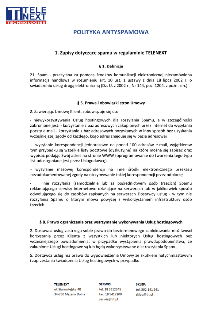 POLITYKA ANTYSPAMOWA 1. Zapisy dotyczące spamu w regulaminie TELENEXT § 1. Definicje 21. Spam - przesyłana za pomocą środków komunikacji elektronicznej niezamówiona informacja handlowa w rozumieniu art. 10 ust. 1 ustawy z dnia 18 lipca 2002 r. o świadczeniu usług drogą elektroniczną (Dz. U. z 2002 r., Nr 144, poz. 1204, z późn. zm.). § 5. Prawa i obowiązki stron Umowy 2. Zawierając Umowę Klient, zobowiązuje się do: - niewykorzystywania Usług hostingowych dla rozsyłania Spamu, a w szczególności zabronione jest: - korzystanie z baz adresowych zakupionych przez Internet do wysyłania poczty e-mail - korzystanie z baz adresowych pozyskanych w inny sposób bez uzyskania wcześniejszej zgody od każdego, kogo adres znajduje się w bazie adresowej - wysyłanie korespondencji jednorazowo na ponad 100 adresów e-mail, wyjątkiemw tym przypadku są wszelkie listy pocztowe (dyskusyjne) na które można się zapisać oraz wypisać podając Swój adres na stronie WWW (oprogramowanie do tworzenia tego typu list udostępniane jest przez Usługodawcę). - wysyłanie masowej korespondencji na inne środki elektronicznego przekazu bezudokumentowanej zgody na otrzymywanie takiej korespondencji przez odbiorcę nie rozsyłania (samodzielnie lub za pośrednictwem osób trzecich) Spamu reklamującego serwisy internetowe działające na serwerach lub w jakikolwiek sposób odwołującego się do zasobów zapisanych na serwerach Dostawcy usług - w tym nie rozsyłania Spamu o którym mowa powyżej z wykorzystaniem infrastruktury osób trzecich. § 8. Prawo ograniczenia oraz wstrzymanie wykonywania Usług hostingowych 2. Dostawca usług zastrzega sobie prawo do bezterminowego zablokowania możliwości korzystania przez Klienta z wszystkich lub niektórych Usług hostingowych bez wcześniejszego powiadomienia, w przypadku wystąpienia prawdopodobieństwa, że zakupione Usługi hostingowe są lub będą wykorzystywane dla: rozsyłania Spamu, 5. Dostawca usług ma prawo do wypowiedzenia Umowy ze skutkiem natychmiastowym i zaprzestania świadczenia Usług hostingowych w przypadku: podjęcia przez Klienta lub Użytkownika działań, które będą skutkowały niewykonaniem któregokolwiek z obowiązków wskazanych w &5.2 w pkt. od h) do l) Regulaminu " 2. Spam a polskie prawo Ustawa z dnia 29 sierpnia 1997 r. o ochronie danych osobowych. http://isap.sejm.gov.pl/DetailsServlet?id=WDU19971330883 Ustawa z dnia 18 lipca 2002 r. o świadczeniu usług drogą elektroniczną. http://isap.sejm.gov.pl/DetailsServlet?id=WDU20021441204 "Art. 2. Określenia użyte w ustawie oznaczają: (...) 2) informacja handlowa - każdą informację przeznaczoną bezpośrednio lub pośrednio do promowania towarów, usług lub wizerunku przedsiębiorcy lub osoby wykonującej zawód, której prawo do wykonywania zawodu jest uzależnione od spełnienia wymagań określonych w odrębnych ustawach, z wyłączeniem informacji umożliwiającej porozumiewanie się za pomocą środków komunikacji elektronicznej z określoną osobą oraz informacji o towarach i usługach niesłużącej osiągnięciu efektu handlowego pożądanego przez podmiot, który zleca jej rozpowszechnianie, w szczególności bez wynagrodzenia lub innych korzyści od producentów, sprzedawców i świadczących usługi. Art. 10. 1. Zakazane jest przesyłanie niezamówionej informacji handlowej skierowanej dooznaczonego odbiorcy za pomocą środków komunikacji elektronicznej, w szczególności poczty elektronicznej. 2. Informację handlową uważa się za zamówioną, jeżeli odbiorca wyraził zgodę naotrzymywanie takiej informacji, w szczególności udostępnił w tym celu identyfikujący go adres elektroniczny. Art. 4. 1. Jeżeli ustawa wymaga uzyskania zgody usługobiorcy to zgoda ta: a) nie może być domniemana lub dorozumiana z oświadczenia woli o innej treści, b) może być odwołana w każdym czasie. 2. Usługodawca wykazuje uzyskanie zgody, o której mowa w ust. 1, dla celów dowodowych. Art. 24. 1. Kto przesyła za pomocą środków komunikacji niezamówioneinformacje handlowe, podlega karze grzywny. 2. ściganie wykroczenia, wniosekpokrzywdzonego. " o którym mowa w ust. 1, elektronicznej następuje na 3. Procedury obowiązujące w TELENEXT dotyczące użytkownikówrozsyłających Spam (procedura ma wyłącznie charakter informacyjny i w żaden sposób nie wpływa na zapisy regulaminu) 1. Poszkodowany zgłasza spam, który otrzymał na swoją skrzynkę e-mail. 2. TELENEXT przesyła informację o spamie wysłanym przez użytkownika serwera w telenext.pl do bezpośredniego Klienta z tzw. pierwszym ostrzeżeniem. Jest to informacja która mówi o tym iż dany użytkownik wysłał spam i prosimy o pouczenie go. Wiadomość ta również zawiera informację iż jeśli otrzymamy kolejne zgłoszenie spamu wysyłanego przez tego użytkownika to jego domena zostanie usunięta z dns bez możliwości jej przywrócenia. 3. Jeśli nie otrzymamy zgłoszenie o kolejnej wysyłce w ciągu 12 miesięcyzgłoszenie jest zamykane. 4. Jeśli użytkownik wysyła spam ponownie jego domen lub konto email (jeśli niekorzystał z własnej domeny) jest usuwana. 5. O fakcie usunięcia domeny z DNS powiadamiany jest bezpośredni Klient TELENEXT. 4. Konsekwencje prawne W Polsce dotychczas rozpatrzono kilkanaście spraw dotyczących rozsyłania niezamówionej informacji handlowej przez firmy. Wysokość grzywny wynosiła kilka tysięcy złotych. Firmy rozsyłające tego typu reklamy były zmuszone do zapłacenia również kosztów sądowych oraz odszkodowania na rzecz poszkodowanego z tytułu poniesionych strat. 5. Zalecenia UOKIK Wybrane: Jak uzyskać zgodę adresata? Przedsiębiorcy chcący skorzystać z reklamy za pomocą poczty elektronicznej muszą uzyskać zgodę danego konsumenta na jej otrzymanie. Brak takiej zgody przed przesłaniem wiadomości stanowiącej ofertę lub reklamę stanowi naruszenie prawa i może być ścigane na drodze indywidualnej (jako wykroczenie lub na