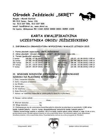 Ośrodek Jeździecki „SKRĘT” Magda i Marek Garlicki 89-512 Iwiec, Iwiec 126 tel. 513 037 596, 513 037 595 email: [email protected], www.skret.eu Nr konta: Millennium 50 1160 2202 0000 0001 0059 1329 KARTA KWALIFIKACYJNA UCZESTNIKA OBOZU JEŹDZIECKIEGO I. INFORMACJA ORGANIZATORA WYPOCZYNKU WAKACJI LETNICH 2015 1. Forma placówki wypoczynku: OBÓZ JEŹDZIECKI 2. Adres placówki: Ośrodek Jeździecki „SKRĘT”, 89-512 Iwiec, Iwiec 126. 3. Termin (podkreślić właściwe): I turnus II turnus III turnus IV turnus V turnus (20.06.-27.06.2015) (27.06.-04.07.2015) (04.07.-11.07.2015) (11.07.-18.07.2015) (18.07.-25.07.2015) 1190 1190 1190 1190 1190 zł zł zł zł zł VI turnus VII turnus VIII turnus IX turnus X turnus (25.07.-01.08.2015) (01.08.-08.08.2015) (08.08.-15.08.2015) (15.08.-22.08.2015) (22.08.-29.08.2015) 1190 1190 1190 1190 1190 zł zł zł zł zł II. WNIOSEK RODZICÓW (OPIEKUNÓW) O SKIEROWANIE DZIECKA NA PLACÓWKĘ WYPOCZYNKU 1. Imię i nazwisko dziecka:…………………………………………..……………………….. 2. Data i miejsce urodzenia:……………………………………….………………………… 3. Nr PESEL:……………………………………… 4. Adres zam.:……….………….……………….…………………………………………………………………………………...... 5. Nr telefonu:……………………………... 6. Kasa Chorych:……………..……………… 7. Adres i nr telefonu rodziców w czasie pobytu dziecka w placówce: ………………………………………………………………………………………………………………………………………………………. 8. Nazwa i adres szkoły:………… ………………………………………………………. ……………………………………………………………………….klasa:………………… 9. Wzrost dziecka:…………………… cm. 10. Waga dziecka:……………………… kg. 11. Zobowiązuję się do uiszczenia kosztów pobytu dziecka na placówce w wysokości 1190 zł/za każdy tydzień pobytu. – słownie: tysiąc dziewięćdziesiąt złotych/za każdy tydzień pobytu.* *(Wpłaty bezzwrotnego zadatku w wysokości 190 zł za każdy tydzień pobytu należy dokonać w ciągu 14 dni od daty potwierdzenia przez Ośrodek wpisania dziecka na listę uczestników obozu. Nie dokonanie wpłaty może spowodować skreślenie dziecka z listy uczestników obozu. Pozostałą kwotę rozlicza się w dniu przyjazdu do Ośrodka.) …………………………............................. ……………………………….…………………………… (miejscowość, data) (podpis rodzica lub opiekuna) 1 III. INFORMACJA RODZICÓW (OPIEKUNÓW) O STANIE ZDROWIA DZIECKA (np. na co dziecko jest uczulone, jak znosi jazdę samochodem, czy przyjmuje stale leki i w jakich dawkach, czy nosi aparat ortodontyczny, okulary itd.) ………………………………………………………………………………………………………………………………………………………………………………… ………………………………………………………………………………………………………………………………………………………………………………… ………………………………………………………………………………………………………………………………………………………………………………… ………………………………………………………………………………………………………………………………………………………………………………… Stwierdzam, że podałem(łam) wszystkie znane mi informacje o dziecku, które mogą pomóc w zapewnieniu właściwej opieki w czasie pobytu dziecka na placówce wypoczynku. …………………………............................. ……………………………….…………………………… (miejscowość, data) (podpis rodzica lub opiekuna) IV. INFORMACJA PIELĘGNIARKI O SZCZEPIENIACH LUB PRZEDSTAWIENIE KSIĄŻECZKI ZDROWIA Z AKTUALNYM WPISEM SZCZEPIEŃ Szczepienia ochronne (podać rok): tężec:…………, błonnica:…………, dur:………… Inne:……………………………………………………………………………………………. …………………………............................. ……………………………….…………………………… (miejscowość, data) (podpis pielęgniarki) V. INFORMACJA O DZIECKU WYCHOWAWCY KLASY (w przypadku braku możliwości uzyskania opinii wychowawcy klasy – wypełnia rodzic lub opiekun) ………………………………………………………………………………………………………………………………………………………………………………… ………………………………………………………………………………………………………………………………………………………………………………… ………………………………………………………………………………………………………………………………………………………………………………… ………………………………………………………………………………………………………………………………………………………………………………… …………………………............................. ……………………………….…………………………… (miejscowość, data) (podpis wychowawcy lub rodzica-opiekuna) VI. DECYZJA O KWALIFIKACJI UCZESTNIKA Postanawia się: 1. Zakwalifikować i skierować dziecko do udziału w obozie za odpłatnością …………… zł Słownie:………………………………