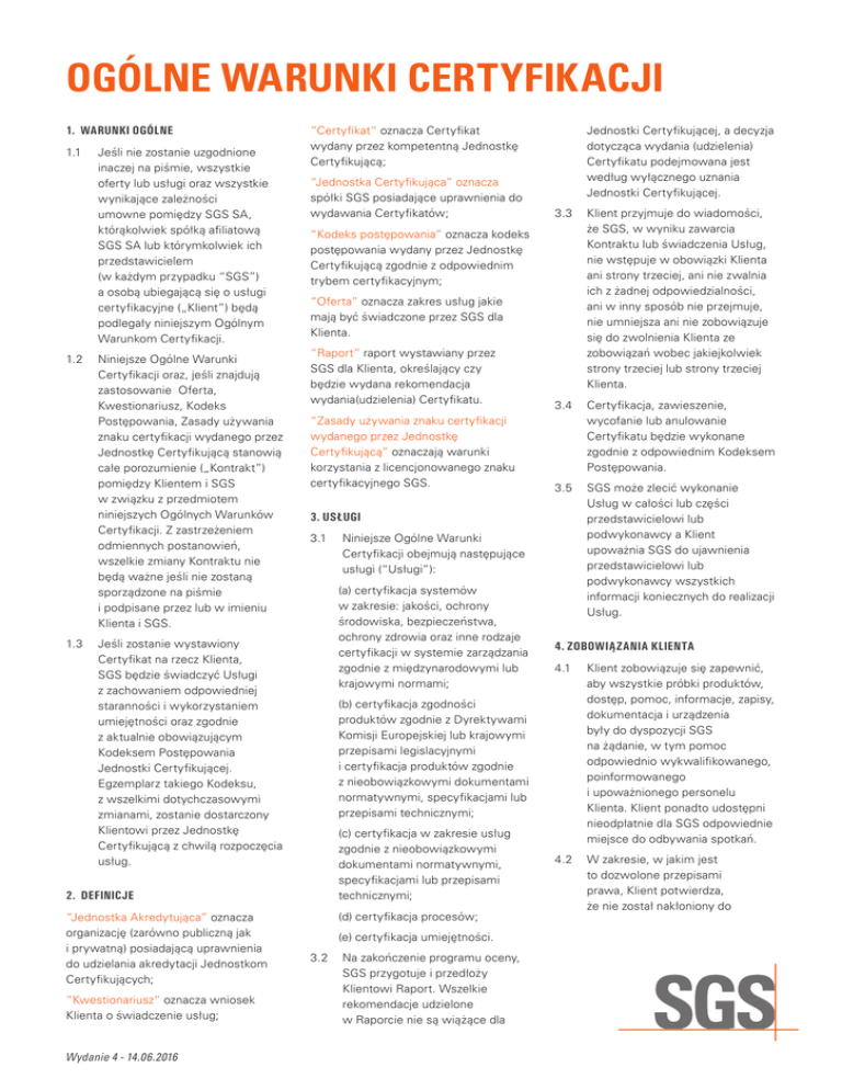 OGÓLNE WARUNKI CERTYFIKACJI 1. WARUNKI OGÓLNE 1.1 Jeśli nie zostanie uzgodnione inaczej na piśmie, wszystkie oferty lub usługi oraz wszystkie wynikające zależności umowne pomiędzy SGS SA, którąkolwiek spółką afiliatową SGS SA lub którymkolwiek ich przedstawicielem (w każdym przypadku “SGS”) a osobą ubiegającą się o usługi certyfikacyjne („Klient”) będą podlegały niniejszym Ogólnym Warunkom Certyfikacji. 1.2 Niniejsze Ogólne Warunki Certyfikacji oraz, jeśli znajdują zastosowanie Oferta, Kwestionariusz, Kodeks Postępowania, Zasady używania znaku certyfikacji wydanego przez Jednostkę Certyfikującą stanowią całe porozumienie („Kontrakt”) pomiędzy Klientem i SGS w związku z przedmiotem niniejszych Ogólnych Warunków Certyfikacji. Z zastrzeżeniem odmiennych postanowień, wszelkie zmiany Kontraktu nie będą ważne jeśli nie zostaną sporządzone na piśmie i podpisane przez lub w imieniu Klienta i SGS. 1.3 Jeśli zostanie wystawiony Certyfikat na rzecz Klienta, SGS będzie świadczyć Usługi z zachowaniem odpowiedniej staranności i wykorzystaniem umiejętności oraz zgodnie z aktualnie obowiązującym Kodeksem Postępowania Jednostki Certyfikującej. Egzemplarz takiego Kodeksu, z wszelkimi dotychczasowymi zmianami, zostanie dostarczony Klientowi przez Jednostkę Certyfikującą z chwilą rozpoczęcia usług. 2. DEFINICJE “Jednostka Akredytująca” oznacza organizację (zarówno publiczną jak i prywatną) posiadającą uprawnienia do udzielania akredytacji Jednostkom Certyfikujących; “Kwestionariusz“ oznacza wniosek Klienta o świadczenie usług; Wydanie 4 - 14.06.2016 “Certyfikat“ oznacza Certyfikat wydany przez kompetentną Jednostkę Certyfikującą; “Jednostka Certyfikująca” oznacza spółki SGS posiadające uprawnienia do wydawania Certyfikatów; “Kodeks postępowania” oznacza kodeks postępowania wydany przez Jednostkę Certyfikującą zgodnie z odpowiednim trybem certyfikacyjnym; “Oferta” oznacza zakres usług jakie mają być świadczone przez SGS dla Klienta. “Raport” raport wystawiany przez SGS dla Klienta, określający czy będzie wydana rekomendacja wydania(udzielenia) Certyfikatu. “Zasady używania znaku certyfikacji wydanego przez Jednostkę Certyfikującą” oznaczają warunki korzystania z licencjonowanego znaku certyfikacyjnego SGS. 3. USŁUGI 3.1 Niniejsze Ogólne Warunki Certyfikacji obejmują następujące usługi (“Usługi”): (a) certyfikacja systemów w zakresie: jakości, ochrony środowiska, bezpieczeństwa, ochrony zdrowia oraz inne rodzaje certyfikacji w systemie zarządzania zgodnie z międzynarodowymi lub krajowymi normami; (b) certyfikacja zgodności produktów zgodnie z Dyrektywami Komisji Europejskiej lub krajowymi przepisami legislacyjnymi i certyfikacja produktów zgodnie z nieobowiązkowymi dokumentami normatywnymi, specyfikacjami lub przepisami technicznymi; (c) certyfikacja w zakresie usług zgodnie z nieobowiązkowymi dokumentami normatywnymi, specyfikacjami lub przepisami technicznymi; (d) certyfikacja procesów; (e) certyfikacja umiejętności. 3.2 Na zakończenie programu oceny, SGS przygotuje i przedłoży Klientowi Raport. Wszelkie rekomendacje udzielone w Raporcie nie są wiążące dla Jednostki Certyfikującej, a decyzja dotycząca wydania (udzielenia) Certyfikatu podejmowana jest według wyłącznego uznania Jednostki Certyfikującej. 3.3 Klient przyjmuje do wiadomości, że SGS, w wyniku zawarcia Kontraktu lub świadczenia Usług, nie wstępuje w obowiązki Klienta ani strony trzeciej, ani nie zwalnia ich z żadnej odpowiedzialności, ani w inny sposób nie przejmuje, nie umniejsza ani nie zobowiązuje się do zwolnienia Klienta ze zobowiązań wobec jakiejkolwiek strony trzeciej lub strony trzeciej Klienta. 3.4 Certyfikacja, zawieszenie, wycofanie lub anulowanie Certyfikatu będzie wykonane zgodnie z odpowiednim Kodeksem Postępowania. 3.5 SGS może zlecić wykonanie Usług w całości lub części przedstawicielowi lub podwykonawcy a Klient upoważnia SGS do ujawnienia przedstawicielowi lub podwykonawcy wszystkich informacji koniecznych do realizacji Usług. 4. ZOBOWIĄZANIA KLIENTA 4.1 Klient zobowiązuje się zapewnić, aby wszystkie próbki produktów, dostęp, pomoc, informacje, zapisy, dokumentacja i urządzenia były do dyspozycji SGS na żądanie, w tym pomoc odpowiednio wykwalifikowanego, poinformowanego i upoważnionego personelu Klienta. Klient ponadto udostępni nieodpłatnie dla SGS odpowiednie miejsce do odbywania spotkań. 4.2 W zakresie, w jakim jest to dozwolone przepisami prawa, Klient potwierdza, że nie został nakłoniony do zawarcia Kontraktu w oparciu o jakąkolwiek gwarancję, oświadczenie, deklarację, zapewnienie, postanowienie, porozumienie, przyrzeczenie, odszkodowanie czy zobowiązanie oraz w związku z tym nie została udzielona mu żadna gwarancja, oświadczenie, deklaracja, zapewnienie, postanowienie, umowa, odszkodowanie czy zobowiązanie z jakiegokolwiek tytułu z wyjątkiem tego co określają niniejsze Ogólne Warunki Certyfikacji. Ponadto, w zakresie w jakim został nakłoniony, zrzeka się bezwarunkowo i nieodwołalnie wszelkich roszczeń, praw lub środków zadośćuczynienia, do których miałby prawo w przeciwnym razie z tego tytułu. Wszelkie warunki lub postanowienia zawarte w dokumentach Klienta w standardowej formie, które są niezgodne lub które mogą oznaczać zmianę lub uzupełnienie niniejszych Ogólnych Warunków Certyfikacji będą całkowicie bezskuteczne, chyba że zostaną one wyraźnie zaakceptowane na piśmie przez SGS. 4.3 Klient podejmie wszystkie niezbędne kroki, aby usunąć lub naprawić wszelkie przeszkody lub przerwy w realizacji Usług. 4.4 Aby umożliwić SGS zachowanie zgodności z obowiązującymi przepisami bezpieczeństwa i higieny pracy, Klient udostępni SGS wszystkie informacje dotyczące istniejących lub potencjalnych zagrożeń, na jakie może być narażony personel SGS w czas