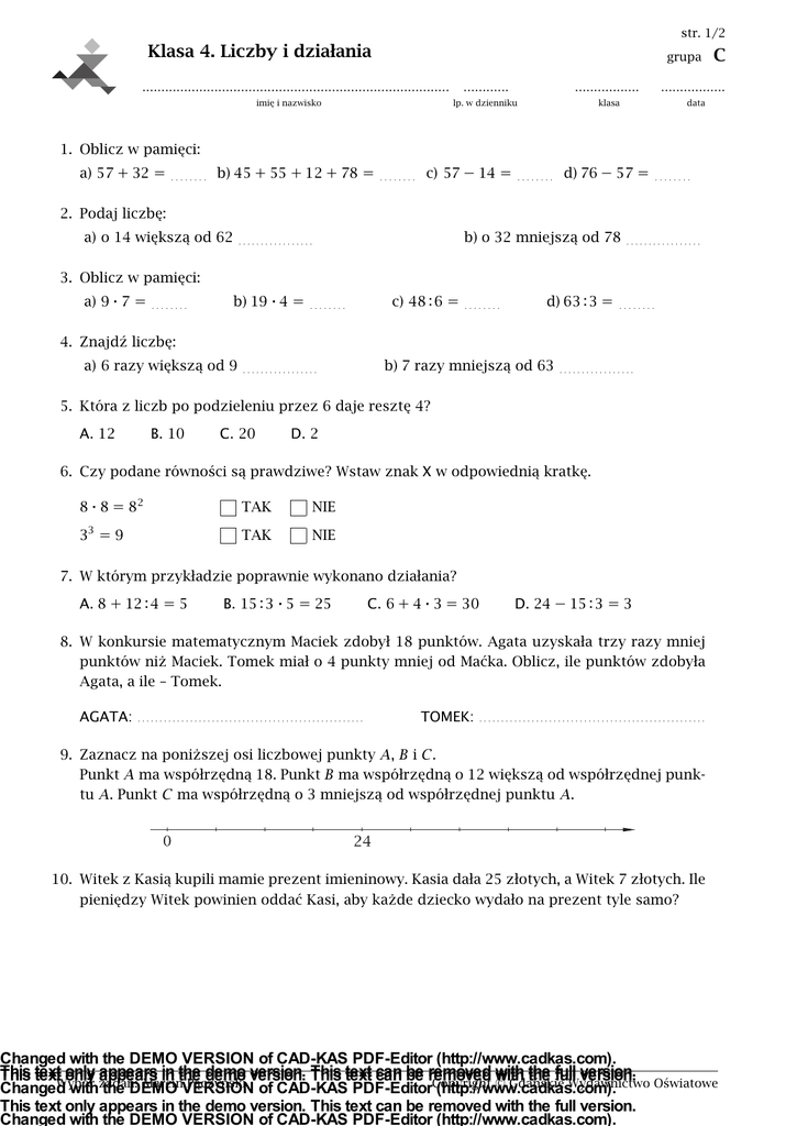 str. 1/2 Klasa 4. Liczby i działania grupa ............ ................. lp. w dzienniku klasa ................................................................................. imię i nazwisko C ................. data 1. Oblicz w pamięci: a) 57 + 32 = . . . . . . . . b) 45 + 55 + 12 + 78 = . . . . . . . . c) 57 − 14 = . . . . . . . . d) 76 − 57 = . . . . . . . . 2. Podaj liczbę: a) o 14 większą od 62 b) o 32 mniejszą od 78 . . . . . . . . . . . . . . . . . . . . . . . . . . . . . . . . . . 3. Oblicz w pamięci: a) 9 ⋅ 7 = . . . . . . . . b) 19 ⋅ 4 = . . . . . . . . c) 48 : 6 = . . . . . . . . d) 63 : 3 = . . . . . . . . 4. Znajdź liczbę: a) 6 razy większą od 9 . . . . . . . . . . . . . . . . . b) 7 razy mniejszą od 63 . . . . . . . . . . . . . . . . . 5. Która z liczb po podzieleniu przez 6 daje resztę 4? A. 12 B. 10 C. 20 D. 2 6. Czy podane równości są prawdziwe? Wstaw znak X w odpowiednią kratkę. 8 ⋅ 8 = 82 TAK NIE 33 = 9 TAK NIE 7. W którym przykładzie poprawnie wykonano działania? A. 8 + 12 : 4 = 5 B. 15 : 3 ⋅ 5 = 25 C. 6 + 4 ⋅ 3 = 30 D. 24 − 15 : 3 = 3 8. W konkursie matematycznym Maciek zdobył 18 punktów. Agata uzyskała trzy razy mniej punktów niż Maciek. Tomek miał o 4 punkty mniej od Maćka. Oblicz, ile punktów zdobyła Agata, a ile – Tomek. AGATA: . . . . . . . . . . . . . . . . . . . . . . . . . . . . . . . . . . . . . . . . . . . . . . . . . . . . TOMEK: . . . . . . . . . . . . . . . . . . . . . . . . . . . . . . . . . . . . . . . . . . . . . . . . . . . . 9. Zaznacz na poniższej osi liczbowej punkty 𝐴, 𝐵 i 𝐶. Punkt 𝐴 ma współrzędną 18. Punkt 𝐵 ma współrzędną o 12 większą od współrzędnej punktu 𝐴. Punkt 𝐶 ma współrzędną o 3 mniejszą od współrzędnej punktu 𝐴. 10. Witek z Kasią kupili mamie prezent imieninowy. Kasia dała 25 złotych, a Witek 7 złotych. Ile pieniędzy Witek powinien oddać Kasi, aby każde dziecko wydało na prezent tyle samo? Changed with the DEMO VERSION of CAD-KAS PDF-Editor (http://www.cadkas.com). This only appears in with the This text textWybór only zadań: appears in the the demo demo version. version. This This text text can can be be removed removed © with the full full version. version. Marcin Pączyński Gdańskie Wydawnictwo Oświatowe Changed with the DEMO VERSION of CAD-KAS PDF-EditorCopyright (http://www.cadkas.com). This text only appears in the demo version. This text can be removed with the full version. Changed with the DEMO VERSION of CAD-KAS PDF-Editor (http://www.cadkas.com). grupa C str. 2/2 *11. Wstaw nawiasy tak, aby równość była prawdziwa. 90 − 18 : 6 + 3 ⋅ 5 = 40 Changed with the DEMO VERSION of CAD-KAS PDF-Editor (http://www.cadkas.com). This only appears in with the This text textWybór only zadań: appears in the the demo demo version. version. This This text text can can be be removed removed © with the full full version. version. Marcin Pączyński Gdańskie Wydawnictwo Oświatowe Changed with the DEMO VERSION of CAD-KAS PDF-EditorCopyright (http://www.cadkas.com). This text only appears in the demo version. This text can be removed with the full version. Changed with the DEMO VERSION of CAD-KAS PDF-Editor (http://www.cadkas.com). str. 1/2 Klasa 4. Liczby i działania grupa ............ ................. lp. w dzienniku klasa ................................................................................. imię i nazwisko D ................. data 1. Oblicz w pamięci: a) 42 + 36 = . . . . . . . . b) 26 + 74 + 32 + 58 = . . . . . . . . c) 67 − 25 = . . . . . . . . d) 72 − 25 = . . . . . . . . 2. Podaj liczbę: a) o 14 większą od 55 b) o 24 mniejszą od 67 . . . . . . . . . . . . . . . . . . . . . . . . . . . . . . . . . . 3. Oblicz w pamięci: a) 9 ⋅ 6 = . . . . . . . . b) 18 ⋅ 3 = . . . . . . . . c) 42 : 7 = . . . . . . . . d) 64 : 4 = . . . . . . . . 4. Znajdź liczbę: a) 7 razy większą od 6 . . . . . . . . . . . . . . . . . b) 6 razy mniejszą od 54 . . . . . . . . . . . . . . . . . 5. Która z liczb po podzieleniu przez 6 daje resztę 2? A. 14 B. 18 C. 4 D. 16 6. Czy podane równości są prawdziwe? Wstaw znak X w odpowiednią kratkę. 5 ⋅ 3 = 53 TAK NIE 62 = 12 TAK NIE 7. W którym przykładzie poprawnie wykonano działania? A. 4 + 14 : 2 = 9 B. 16 : 2 ⋅ 4 = 2 C. 6 + 4 ⋅ 3 = 18 D. 28 − 12 : 4 = 4 8. W konkursie matematycznym zwyciężył Oskar, zdobywając 18 punktów. Ala uzyskała o 3 punkty mniej niż Oskar. Szymon miał dwa razy mniej punktów od Oskara. Oblicz, ile punktów zdobyła Ala, a ile – Szymon. ALA: . . . . . . . . . . . . . . . . . . . . . . . . . . . . . . . . . . . . . . . . . . . . . . . . . . . . . . SZYMON: . . . . . . . . . . . . . . . . . . . . . . . . . . . . . . . . . . . . . . . . . . . . . . . . . . . . . . 9. Zaznacz na poniższej osi liczbowej punkty 𝐴, 𝐵 i 𝐶. Punkt 𝐴 ma współrzędną 8. Punkt 𝐵 ma współrzędną o 8 większą od współrzędnej punktu 𝐴. Punkt 𝐶 ma współrzędną o 2 większą od współrzędnej punktu 𝐴. 10. Wojtek z Marią kupili mamie prezent imieninowy. Maria dała 34 złote, a Wojtek 8 złotych. Ile pieniędzy Wojtek powinien oddać Marii, aby każde dziecko wydało na prezent tyle samo? Changed with the DEMO VERSION of CAD-KAS PDF-Editor (http://www.cadkas.com). This only appears in with the This text textWybór only zadań: appears in the the demo demo version. version. This This text text can can be be removed removed © with the full full version. version. Marcin Pączyński Gdańskie Wydawnictwo Oświatowe Changed with the DEMO VERSION of CAD-KAS PDF-EditorCopyright (http://www.cadkas.com). This text only appears in the demo version. This text can be removed with the full version. Changed with the DEMO VERSION of CAD-KAS PDF-Editor (http://www.cadkas.com). grupa D str. 2/2 *11. Wstaw nawiasy tak, aby równość była prawdziwa. 90 − 18 : 6 + 3 ⋅ 5 = 80 Changed with the DEMO VERSION of CAD-KAS PDF-Editor (http:/