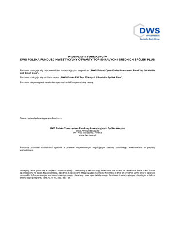PROSPEKT INFORMACYJNY DWS POLSKA FUNDUSZ INWESTYCYJNY OTWARTY TOP 50 MAŁYCH I ŚREDNICH SPÓŁEK PLUS Fundusz posługuje się odpowiednikiem nazwy w języku angielskim: „DWS Poland Open-Ended Investment Fund Top 50 Middle and Small Caps”. Fundusz posługuje się skrótem nazwy: „DWS Polska FIO Top 50 Małych i Średnich Spółek Plus”. Fundusz nie posługiwał się do dnia sporządzenia Prospektu inną nazwą. Towarzystwo będące organem Funduszu: DWS Polska Towarzystwo Funduszy Inwestycyjnych Spółka Akcyjna aleja Armii Ludowej 26 00 – 609 Warszawa, Polska www.dws.com.pl Fundusz prowadzi działalność zgodnie z prawem wspólnotowym regulującym zasady zbiorowego inwestowania w papiery wartościowe. Niniejszy tekst jednolity Prospektu Informacyjnego, obejmujący aktualizację dokonaną na dzień 17 września 2009 roku został sporządzony na dzień tej aktualizacji, zgodnie z przepisami Rozporządzenia Rady Ministrów z dnia 20 stycznia 2009 roku w sprawie prospektu informacyjnego funduszu inwestycyjnego otwartego oraz specjalistycznego funduszu inwestycyjnego otwartego, a także skrótu tego prospektu (Dz. U. nr 17, poz. 88) i ob. ROZDZIAŁ I. OSOBY ODPOWIEDZIALNE ZA INFORMACJE ZAWARTE W PROSPEKCIE I.1. Imiona i nazwiska oraz funkcje osób odpowiedzialnych za informacje zawarte w Prospekcie Piotr Linke, Prezes Zarządu Zbigniew Wójtowicz, Wiceprezes Zarządu I.2. Nazwa i siedziba podmiotu w imieniu którego działają osoby odpowiedzialne za informacje zawarte w Prospekcie DWS Polska Towarzystwo Funduszy Inwestycyjnych Spółka Akcyjna z siedzibą w Warszawie, aleja Armii Ludowej 26, 00 – 609 Warszawa, Polska I.3. Odpowiedzialność za poszczególne części Prospektu Osoby odpowiedzialne za informacje zawarte w Prospekcie są odpowiedzialne za sporządzenie wszystkich części Prospektu. I.4. Oświadczenia osób odpowiedzialnych za informacje zawarte w Prospekcie Oświadczamy, że informacje zawarte w Prospekcie są prawdziwe i rzetelne oraz nie pomijają żadnych faktów ani okoliczności, których ujawnienie w Prospekcie jest wymagane przepisami ustawy i rozporządzenia, a także wedle naszej najlepszej wiedzy nie istnieją, poza ujawnionymi w Prospekcie okoliczności, które mogłyby wywrzeć znaczący wpływ na sytuację prawną, majątkową i finansową Funduszu. Zbigniew Wójtowicz Wiceprezes Zarządu Piotr Linke Prezes Zarządu 2/74 ROZDZIAŁ II. DANE O TOWARZYSTWIE FUNDUSZY INWESTYCYJNYCH II.1. Firma (nazwa), kraj siedziby, siedziba i adres Towarzystwa wraz z numerami telekomunikacyjnymi, adresem głównej strony internetowej i adresem poczty elektronicznej DWS Polska Towarzystwo Funduszy Inwestycyjnych Spółka Akcyjna z siedzibą w Warszawie, Polska Adres: aleja Armii Ludowej 26, 00 – 609 Warszawa, Polska Tel.: +48 22 579 97 00 Faks: +48 22 579 97 01 Adres głównej strony internetowej: Adres poczty elektronicznej: www.dws.com.pl [email protected] II.2. Data i numer zezwolenia Komisji Nadzoru Finansowego na wykonywanie działalności przez Towarzystwo Decyzja Komisji Papierów Wartościowych (obecnie: Komisja Nadzoru Finansowego) z dnia 9 października 1997 roku, nr KPW - 4084 - 16/97 – 8887. II.3. Oznaczenie sądu rejestrowego i numer, pod którym Towarzystwo jest zarejestrowane Sąd Rejonowy dla m. st. Warszawy w Warszawie, XII Wydział Gospodarczy Krajowego Rejestru Sądowego (KRS). Numer KRS: 0000065346. II.4. Wysokość kapitału własnego Towarzystwa, w tym wysokość składników kapitału własnego na ostatni dzień bilansowy Kapitał własny Towarzystwa na dzień 31 grudnia 2008 roku wynosi 49.027.970,14 PLN i składa się z: - kapitału zakładowego w wysokości: - kapitału zapasowego w wysokości: - kapitału z aktualizacji wyceny w wysokości : - zysku/straty z lat ubiegłych: - zysku netto w roku 2008: 25.000.000,00 PLN 15.683.808,91 PLN 199.508,06 PLN -14.993,94 PLN 8.159.647,11 PLN Dane przedstawiono w oparciu o zbadane i zatwierdzone przez biegłego rewidenta sprawozdanie finansowe, sporządzone zgodnie z Międzynarodowymi Standardami Sprawozdawczości Finansowej (MSSF). II.5. Informacja o opłaceniu kapitału zakładowego Towarzystwa Kapitał zakładowy Towarzystwa został opłacony w całości wkładem pieniężnym. II.6. Firma (nazwa) i siedziba podmiotu dominującego wobec Towarzystwa, ze wskazaniem cech tej dominacji oraz firma (nazwa) i siedziba akcjonariuszy Towarzystwa, wraz z podaniem liczby głosów na walnym zgromadzeniu akcjonariuszy, jeżeli akcjonariusz posiada co najmniej 5% ogólnej liczby głosów na walnym zgromadzeniu akcjonariuszy Podmiotem dominującym wobec Towarzystwa oraz jego jedynym akcjonariuszem jest DWS Holding&Service GmbH z siedzibą we Frankfurcie nad Menem, Niemcy. Podmiot posiada 2.500.000 głosów na walnym zgromadzeniu akcjonariuszy Towarzystwa, co stanowi 100% ogólnej liczby głosów. II.7. Imiona i nazwiska członków zarządu Towarzystwa, ze wskazaniem pełnionych funkcji w zarządzie, członków rady nadzorczej Towarzystwa, ze wskazaniem przewodniczącego, osób fizycznych zarządzających Funduszem II.7.1. Imiona i nazwiska członków zarządu Towarzystwa 1) Piotr Linke, Prezes Zarządu 2) Zbigniew Wójtowicz, Wiceprezes Zarządu II.7.2. Imiona i nazwiska członków rady nadzorczej Towarzystwa, ze wskazaniem przewodniczącego 1) Thomas Gerhardt, Przewodniczący 2) Sven-Erik Knoop 3) Markus Kohlenbach II.7.3. Imiona i nazwiska osób fizycznych zarządzających Funduszem 3/74 Łukasz Hejak II.8. Informacje o pełnionych przez osoby, o których mowa w pkt 7 funkcjach poza Towarzystwem, jeżeli ta okoliczność może mieć znaczenie dla sytuacji Uczestników Funduszu Osoby, o których mowa w pkt 7 nie pełnią poza Towarzystwem funkcji mających znaczenie dla sytuacji Uczestników Funduszu. II.9. Nazwy innych funduszy inwestycyjnych zarządzanych przez Towarzystwo, nieobjętych Prospektem 1) DWS Polska Fundusz Inwestycyjny Otwarty Zrównoważony 2) DWS Polska Fundusz Inwestycyjny Otwarty Akcji 3) DWS 