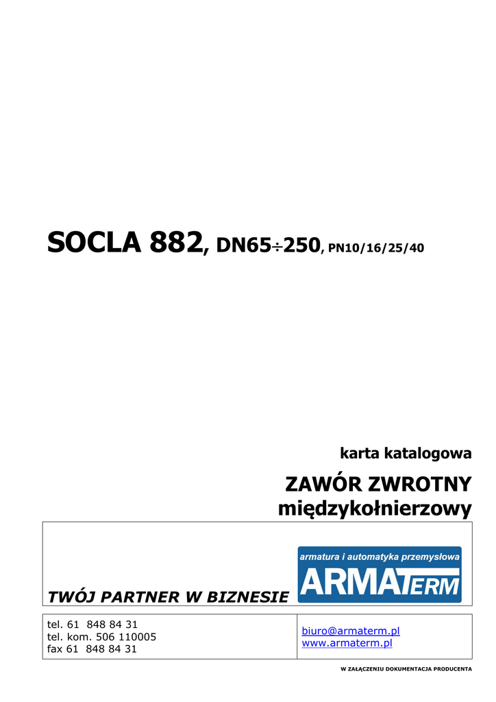 SOCLA 882, DN65250, PN10/16/25/40 karta katalogowa ZAWÓR ZWROTNY międzykołnierzowy TWÓJ PARTNER W BIZNESIE tel. 61 848 84 31 tel. kom. 506 110005 fax 61 848 84 31 [email protected] www.armaterm.pl W ZAŁĄCZENIU DOKUMENTACJA PRODUCENTA Karta katalogowa Typ 882 Zawór zwrotny System 02 • Zawór szczególnie zalecany do pracy za pompą (na odcinku tłocznym rurociągu) • Zespół zamykania: grzybkowy o krótkim przemieszczeniu, wspomagany sprężyną • Korpus epoksydowany • Doskonała szczelność dzięki płaskiej uszczelce • Praca w dowolnym położeniu • Małe straty ciśnienia, cicha praca, zwarta budowa • Nie generuje uderzeń hydraulicznych � •C O AT IN G •� Opis ogólny te rn al Dokumentacja zawierająca instrukcję montażu i eksploatacji jest dostępna na stronie internetowej www.socla.pl lub za pośrednictwem naszego działu technicznego. Ex te UWAGA: Ciśnienia podane dla różnych kategorii płynów (L1/L2/G1/G2) nie mogą być jedynym kryterium doboru urządzenia i gwarantem poprawności działania. W trakcie doboru konkretnego rozwiązania należy wziąć pod uwagę jego zastosowanie oraz wszystkie parametry robocze medium. rn al In Dane techniczne i zamawianie DN PS bar PFA Kat. Cale mm bar L1 L2 G1 G2 2 1/2 65 40 30 40 15 40 I Nr katalogowy 149B3040 3 80 40 25 40 12 40 I 149B3041 4 100 40 20 40 10 35 I 149B3042 5 125 40 16 40 0,5 28 I 149B3043 6 150 40 13 40 0,5 23 I 149B3044 8 200 16 16 16 16 16 II 149B3045* 8 200 25 25 25 17 25 II 149B007936** 8 200 40 40 40 17 25 II 149B007937*** 10 250 40 40 40 14 20 II 149B3046**** 10 250 25 25 25 14 20 II 149B007938** • Przyłącza: międzykołnierzowe, owiert PN patrz tabela • Max. ciśnienie robocze PFA dla wody (sieci przesyłowe, zaopatrzenie w wodę, itp.): patrz tabela • Dopuszczalne ciśnienie robocze PS dla innych mediów: patrz tabela • Temperatura pracy: - min. -10°C - max. +100°C • Pozycja montażu: praca w dowolnym położeniu • Media: czyste ciecze i gazy • Zgodność z normami: - PED 97/23/CE: Dyrektywa ciśnieniowa - PN-EN1092-2: Owiert kołnierzy * PN 10/16 ASA 150 ** PN 25 *** PN 40 ****PN 10/16/40 ASA 150 SOC_882/KK/03.2011 DN mm 65 80 100 125 150 200 200 200 250 250 B mm 75 85 105 90 106 140 140 140 200 200 C PN10/16 PN25 126 126 142 142 162 170 194 194 218 222 273 285 339 328 - PN40 126 142 170 194 222 289 352 ASA150 121 170 194 222 273 328 Masa kg 2,7 4 6 7 11 22 22 22 47 47 ØC B Wymiary ØA Karta katalogowa Materiały i budowa Typ 882 - Zawór zwrotny Nr OPIS 1 KORPUS 2 TULEJA 3 PROWADNICA 4 SPRĘŻYNA 5 USZCZELKA ZAWIERADŁO DN65 (jeden element) 6 INNE DN 7 TRZPIEŃ Charakterystyka pracy MATERIAŁ EURO ANSI Żeliwo sferoidalne epoksydowane Brąz Żeliwo szare epoksydowane Stal nierdzewna EN-GJS-400.15 ASTM A 536 60-40-18 CuSn12 EN-GJL-250 ASTM A 48 35 B X10CrNi18-8 AISI 302 Brąz CuSn5Zn5Pb5-C ASTM B 505 Żeliwo szare epoksydowane Brąz EN-GJL-250 ASTM A 48 35 B CuSn5Zn5Pb5-C ASTM B 505 EPDM Ciśnienie otwarcia [mm/H2O] DN Bez sprężyny Kv m3/h ζ Cale mm 2 1/2 65 400 250 50 136,00 1,50 3 80 350 200 50 200,00 1,60 4 100 300 190 50 265,00 2,30 5 125 250 20 100 265,00 5,70 6 150 200 15 100 347,00 6,80 8 200 200 15 100 550,00 8,30 10 250 916,00 7,30 mH2O PSI Wykres strat ciśnienia: • Linia ciągła - zawór całkowicie otwarty • Linia przerywana - zawór w trakcie otwierania Montaż Przepływ [m3/h] Przepływ [galon/min.] Watts Industries nie ponosi odpowiedzialności za możliwe błędy w katalogach, broszurach i innych materiałach drukowanych. Watts Industries zastrzega sobie prawo do wprowadzania zmian w produktach bez uprzedzenia. Dotyczy to również produktów już zamówionych. Zamienniki mogą być dostarczane bez dokonywania jakichkolwiek zmian w specyfikacjach już uzgodnionych. Wszystkie znaki towarowe w tym materiale są własnością odpowiednich spółek. Wszystkie prawa zastrzeżone. Watts Industries Polska Sp. z o.o. ul. Puławska 40A PL05-500 Piaseczno Telefon: (48 22) 702 68 60, Faks: (48 22) 702 68 61 http://www.socla.pl e-mail: [email protected] SOC_882/KK/03.2011