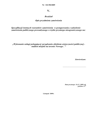 Nr 341/58/2009 V. Rozdział Opis przedmiotu zamówienia Specyfikacji istotnych warunków zamówienia w postępowaniu o udzielenie zamówienia publicznego prowadzonego w trybie przetargu nieograniczonego na: „Wykonanie usługi polegającej zarządzaniu obiektem uŜyteczności publicznej stadion miejski na terenie Nowego . ” Zatwierdzam: _____________________________ Data przetargu: 16.12. 2009 rok godzina 1100 Listopad 2009r. Przedmiot przetargu. I. Administrator zobowiązany jest do prowadzenia spraw i zapewnienia usług w zakresie zwykłego zarządu nieruchomościami opisanymi w § 1 projektu umowy, utrzymania nieruchomości w stanie niepogorszonym ponad granice normalnego zuŜycia, a w szczególności do: 1) zapewnienia dla nieruchomości dostaw energii elektrycznej, cieplnej, wody, oleju opałowego oraz odprowadzania ścieków i wywozu śmieci oraz innych usług niezbędnych dla prawidłowego funkcjonowania urządzeń technicznych nieruchomości oraz zawieranie umów w tym zakresie, 2) zawierania i rozwiązywania w imieniu własnym umów o korzystanie z nieruchomości z innymi podmiotami, 3) pobierania opłat za korzystanie z nieruchomości, w tym za bilety wstępu na imprezy masowe, 4) wykonywanie wobec osób korzystających z nieruchomości uprawnień właściciela, 5) informowania Gminy na piśmie o kaŜdym przypadku powstania szkody w zarządzanych nieruchomościach, 6) zapewnienie dochodzenia i ściągania odszkodowań od osób wyrządzających szkody w zarządzanych nieruchomościach oraz naleŜności od osób zobowiązanych do uiszczania opłat za korzystanie z nieruchomości, w tym naleŜytej obsługi prawnej, 7) utrzymanie budynków, budowli i innych urządzeń w naleŜytym stanie technicznym przez prowadzenie prac konserwacyjnych i drobnych prac remontowych, 8) wykonywanie obowiązków w zakresie utrzymania porządku i czystości na terenie zarządzanej nieruchomości, w tym usuwanie skutków opadów śniegu i gołoledzi, 9) prowadzenie prac w zakresie pielęgnacji zieleni na terenie zarządzanej nieruchomości, 10) pielęgnacja i konserwacja płyty boiska głównego i treningowego od chwili powiadomienia przez Gminę na piśmie o oddaniu do uŜytkowania tych budowli; pielęgnacja i konserwacja zgodnie z instrukcją dostarczoną przez wykonawcę tych budowli; instrukcja zostanie dostarczona po oddaniu do uŜytkowania budowli przez wykonawcę i będzie stanowiła załącznik nr 3 do niniejszej umowy, 11) dozorowanie nieruchomości przez 24 godziny na dobę poprzez system monitoringu od dnia jego zamontowania przez Gminę oraz przez 8 godzin na dobę za pomocą dozorcy; o zamontowaniu i oddaniu monitoringu do uŜytkowania Administrator zostanie powiadomiony przez Gminę na piśmie, 12) zorganizowanie usuwania awarii i skutków awarii na nieruchomości, 13) prowadzenie ewidencji uzyskiwanych dochodów z zarządzanej nieruchomości i ponoszonych na nią kosztów oraz przekazywanie kwartalnie informacji Gminie na ten temat, 14) eksponowania, dbania o stan techniczny i czytelność tablicy informacyjnej przedstawionej w załączniku nr 4 ze szczególną starannością do dnia 31 grudnia 2011r, 15) prowadzenia ewidencji umoŜliwiającej dokonywanie pomiaru wskaźnika rezultatu stanowiącej załącznik nr 5 do niniejszej umowy (jeden egzemplarz przekazany Administratorowi). II. Administrator zobowiązany jest do prowadzenia ksiąg budynków i obiektów budowlanych zgodnie z przepisami prawa budowlanego i przeprowadzania okresowych przeglądów budynków, budowli i innych urządzeń oraz znajdujących się w nich instalacji. III. Administrator w terminie do 1 grudnia kaŜdego roku. przedstawi Gminie wykaz niezbędnych do przeprowadzenia w następnym roku kalendarzowym remontów bieŜących i kapitalnych oparty o techniczne przeglądy budynków, budowli i urządzeń wraz ze wstępnymi kosztorysami. Gmina po przeanalizowaniu uzasadnienia dla poszczególnych remontów i moŜliwości budŜetowych ustali do 1 dnia stycznia następnego roku zakres remontów do wykonania. Wyłonienie wykonawcy remontów nastąpi w oparciu o przepisy prawa zamówień publicznych. IV. Administrator zobowiązany jest do dnia 15 marca 2007 r do opracowania i przedstawienia Gminie projektu regulaminu korzystania z oddanych do zarządzania obiektów. Projekt po uzyskaniu pozytywnej opinii Gminy będzie stanowił załącznik nr 6 do niniejszej umowy. Regulamin korzystania z oddanych do zarządzania obiektów zostanie umieszczony przez Administratora w widocznych miejscach przy wejściach na teren stadionu miejskiego, na budynkach oraz w szatniach. VI. Administrator zobowiązany jest do umoŜliwienia przeprowadzenia czynności kontrolnych przez Gminę w kaŜdym czasie. VII. Administrator zobowiązany jest do stosowania zaleceń Gminy udzielonych na piśmie co do sposobu zarządzania nieruchomościami oraz świadczenia usług pielęgnacyjnych, konserwacyjnych, remontowych i nadzorczych. VIII. Wymagania szczegółowe do tyczące boisk Wykaz czynności do wykonania na nawierzchniach trawiastych boisk i obiektach stadionu miejskiego „Wisła” Nowe w okresie jednego roku. 1. Nawadnianie w okresie od marca do końca października. Wielkość zaleŜy od ilości i rozkładu opadów atmosferycznych w okresie wegetacji. Na boiskach trawiastych dzienne zapotrzebowanie na wodę wynosi średnio 3 l/m3 powierzchni 2. NawoŜenie 2.1. Fosfor w ilości 35 kg P2O5ha-1 Potas w ilości 70 kg K2Oha-1 Stosować na początku października 2,2. Azot w ilości 40 kg Nha-1 Stosować wczesną wiosną w chwili trwania wegetacji oraz co 2 - 3 koszenia w ciągu całego okresu wegetacji w ilości 20-30 N.kg.ha-1 2.3. Co 2 lata przeprowadzać badania gleby. 3. Koszenie: 3.1. W okresie maj — czerwiec lipiec koszenie wykonywać co 4 do 5 dni, tj. 22 razy 3.2. W okresie sierpień wrzesień co 7 do 10 dni, tj. 8 razy. 3.3. W okresie październik według potrzeb. 3.4. Optymalna wysokość koszenia na trawniku sportowym wynosi 2,5 : 3 m. Przyj