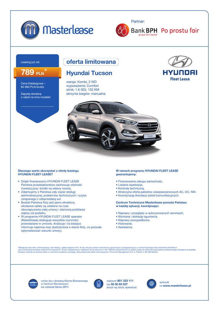 Partner: Leasing już od: oferta limitowana 789 PLN Hyundai Tucson Cena Katalogowa – 94 990 PLN brutto Zapytaj doradcę o rabat na inne modele! wersja: Kombi, 2 WD wyposażenie: Comfort silnik: 1.6 GDi, 132 KM skrzynia biegów: manualna Dlaczego warto skorzystać z oferty leasingu HYUNDAI FLEET LEASE? W ramach programu HYUNDAI FLEET LEASE gwarantujemy: • Dzięki finansowaniu HYUNDAI FLEET LEASE Państwa przedsiębiorstwo zachowuje zdolność inwestycyjną i środki na własny rozwój. • Zdejmujemy z Państwa cały ciężar obsługi administracyjnej, problemów technicznych i ryzyka związanego z odsprzedażą aut. • Budżet Państwa floty jest jasno określony, okresowe opłaty są ustalone na czas obowiązywania całej umowy i stanowią podstawę odpisu od podatku. • W programie HYUNDAI FLEET LEASE operator (Masterlease) obsługuje wszystkie czynności przewidziane w umowie. Analizuje i na bieżąco informuje najemcę oraz dystrybutora o stanie floty, co pozwala optymalizować warunki umowy. • Finansowanie zakupu samochodu, • Lokalne rejestracje, • Kontrolę techniczną, • Atrakcyjna oferta pakietów ubezpieczeniowych AC, OC, NW, • Koordynację likwidacji szkód komunikacyjnych. Centrum Techniczne Masterlease pomoże Państwu w każdej sytuacji, koordynując: • Naprawy i przeglądy w autoryzowanych serwisach, • Wymianę i alokację ogumienia, • Naprawy powypadkowe, • Holowanie, • Assistance. *Miesięczna rata netto. Okres leasingu: 36 miesięcy, opłata wstępna 15%. W raty wliczony serwis mechaniczny gwarancyjny i pozagwarancyjny w ramach łącznego limitu kilometrów 60 000 km oraz koordynacja likwidacji szkód komunikacyjnych. Koszty ubezpieczenia i rejestracji nie są wliczone w raty. Niektóre prezentowane na zdjęciu opcje nie stanowią wyposażenia podstawowego (dostępne za dopłatą). Niniejszy materiał nie stanowi oferty w rozumieniu Kodeksu cywilnego. Służy jedynie do celów informacyjnych. Prime Car Management S.A. ul. Polanki 4, 80-308 Gdańsk. umów się z doradcą Klienta Biznesowego w Centrum Biznesowym lub oddziale Banku BPH zadzwoń 801 333 111 lub 58 30 85 037 (koszt wg taryfy operatora) sprawdź na www.masterlease.pl