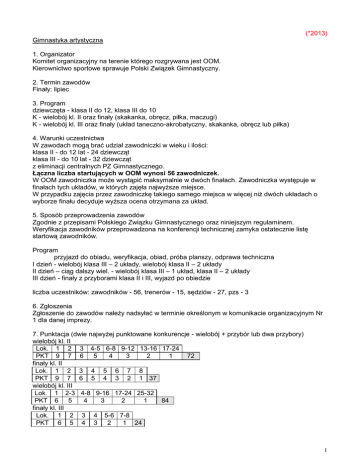 (*2013) Gimnastyka artystyczna 1. Organizator Komitet organizacyjny na terenie którego rozgrywana jest OOM. Kierownictwo sportowe sprawuje Polski Związek Gimnastyczny. 2. Termin zawodów Finały: lipiec 3. Program dziewczęta - klasa II do 12, klasa III do 10 K - wielobój kl. II oraz finały (skakanka, obręcz, piłka, maczugi) K - wielobój kl. III oraz finały (układ taneczno-akrobatyczny, skakanka, obręcz lub piłka) 4. Warunki uczestnictwa W zawodach mogą brać udział zawodniczki w wieku i ilości: klasa II - do 12 lat - 24 dziewcząt klasa III - do 10 lat - 32 dziewcząt z eliminacji centralnych PZ Gimnastycznego. Łączna liczba startujących w OOM wynosi 56 zawodniczek. W OOM zawodniczka może wystąpić maksymalnie w dwóch finałach. Zawodniczka występuje w finałach tych układów, w których zajęła najwyższe miejsce. W przypadku zajęcia przez zawodniczkę takiego samego miejsca w więcej niż dwóch układach o wyborze finału decyduje wyższa ocena otrzymana za układ. 5. Sposób przeprowadzenia zawodów Zgodnie z przepisami Polskiego Związku Gimnastycznego oraz niniejszym regulaminem. Weryfikacja zawodników przeprowadzona na konferencji technicznej zamyka ostatecznie listę startową zawodników. Program przyjazd do obiadu, weryfikacja, obiad, próba planszy, odprawa techniczna I dzień - wielobój klasa III – 2 układy, wielobój klasa II – 2 układy II dzień – ciąg dalszy wiel. - wielobój klasa III – 1 układ, klasa II – 2 układy III dzień - finały z przyborami klasa II i III, wyjazd po obiedzie liczba uczestników: zawodników - 56, trenerów - 15, sędziów - 27, pzs - 3 6. Zgłoszenia Zgłoszenie do zawodów należy nadsyłać w terminie określonym w komunikacie organizacyjnym Nr 1 dla danej imprezy. 7. Punktacja (dwie najwyżej punktowane konkurencje - wielobój + przybór lub dwa przybory) wielobój kl. II Lok. 1 2 3 4-5 6-8 9-12 13-16 17-24 PKT 9 7 6 5 4 3 2 1 72 finały kl. II Lok. 1 2 3 4 5 6 7 8 PKT 9 7 6 5 4 3 2 1 37 wielobój kl. III Lok. 1 2-3 4-8 9-16 17-24 25-32 PKT 6 5 4 3 2 1 84 finały kl. III Lok. 1 2 3 4 5-6 7-8 PKT 6 5 4 3 2 1 24 1 D. System ocen Gimnastyka artystyczna I. Młodzieżowe Mistrzostwa Polski K - do 18 lat 1. Program K - wielobój kl. mistrzowska 2. Punktacja Lok. 1 2 3 4 5 6 7 8 9-12 PKT 25 21 18 16 14 12 11 10 8 159 II. Mistrzostwa Polski Juniorów K - do 15 lat 1. Program K - wielobój kl. I oraz finały (skakanka, obręcz, piłka, wstążka), układy zbiorowe 2. Punktacja (trzy najwyżej punktowane konkurencje - wielobój + dwa przybory lub trzy przybory) wielobój Lok. 1 2 3 4 5 6 7 8 9 10-11 12-13 14-16 PKT 15 12 10 9 8 7 6 5 4 3 2 1 89 finały, układy zbiorowe Lok. 1 2 3 4 5 6 7 8 PKT 15 12 10 8 6 4 3 2 60 III. Olimpiada Młodzieży - Mistrzostwa Polski Juniorów młodszych Klasa II - K – do 12 lat, Klasa III K – do 10 lat 1. Program K - wielobój kl. II oraz finały (skakanka, obręcz, piłka, maczugi) K - wielobój kl. III oraz finały (układ taneczno-akrobatyczny, skakanka, obręcz lub piłka) 2. Punktacja (dwie najwyżej punktowane konkurencje - wielobój + przybór lub dwa przybory) wielobój kl. II Lok. 1 2 3 4-5 6-8 9-12 13-16 17-24 PKT 9 7 6 5 4 3 2 1 72 finały kl. II Lok. 1 2 3 4 5 6 7 8 PKT 9 7 6 5 4 3 2 1 37 wielobój kl. III Lok. 1 2-3 4-8 9-16 17-24 25-32 PKT 6 5 4 3 2 1 84 finały kl. III Lok. 1 2 3 4 5-6 7-8 PKT 6 5 4 3 2 1 24 Eliminacje do OOM – eliminacje centralne III. Mistrzostwa Polski Juniorów młodszych Klasa II - K – do 12 lat Klasa III K – do 10 lat 1. Program K – układy zbiorowe klasa II, III 2. Punktacja układy zbiorowe klasa II Lok. 1 2 3 4 5 6 7 8 PKT 9 7 6 5 4 3 2 1 37 układy zbiorowe kl. III Lok. 1 2 3 4 PKT 6 5 4 3 5-6 2 7-8 1 24 2 IV. Międzywojewódzkie Mistrzostwa Młodzików klasa młodzieżowa K - do 9 lat 1. Program K - wielobój kl. Młodzieżowa oraz finały (układ taneczno-akrobatyczny, skakanka, obręcz) 2. Punktacja - (dwie najwyżej punktowane konkurencje - wielobój + przybór lub dwa przybory) wielobój Lok. 1 2-3 4-12 PKT 3 2 1 16 finały Lok. 1 2 3-4 PKT 3 2 1 7 Strefy A – POM, KPM, WM, ZPM B – DŚL, LBU, WLP, OPO C – LUB, ŁDZ, MAZ, PDL D – MŁP, PKR, ŚL, ŚWI 2012 ZPM DŚL ŁDZ ŚL 2013 POM OPO MAZ MŁP 2014 2015 E. Roczniki młodzieżowcy juniorzy juniorzy młodsi młodzicy do 18 lat (w 2013 roku urodzeni 01.01.1995 i młodsi) klasa M do 15 lat (w 2013 roku urodzeni 01.01.1998 i młodsi) klasa I do 12 lat (w 2013 roku urodzeni 01.01.2001 i młodsi) klasa II do 10 lat (w 2013 roku urodzeni 01.01.2003 i młodsi) klasa III do 9 lat (w 2013 roku urodzeni 01.01.2004 i młodsi) klasa młodzieżowa Przypominamy: - w zawodach uczestniczą kluby posiadające licencję wydaną przez właściwy polski związek, - zawodnicy muszą posiadać licencję wydaną przez właściwy związek, - w przypadku braku licencji klubowej – punkty naliczane będą dla gminy, - komunikat z zawodów powinien zawierać rok urodzenia zawodnika, numer licencji zawodnika oraz pełną nazwę klubu, wykaz członków komisji sędziowskiej wraz z ich nr licencji i być podpisany przez sędziego głównego z podaniem jego nr licencji - komunikat z zawodów należy przesłać na adres Polskiej Federacji Sportu Młodzieżowego w ciągu 14 dni po zawodach, - wnioski o przyznanie premii punktowej, wnioski o podział punktów powinny wpłynąć od pzs do Komisji Sportu PFSM najpóźniej w terminie do dnia 31 października danego roku (decyduje data stempla pocztowego), - uwagi dotyczące wprowadzonych danych, w szczególności nazw klubów i przyznanych punktów powinny wpływać na bieżąco do PFSM a najpóźniej w terminie do dnia 10 listopada danego roku, - prosimy o zapoznanie się z częścią ogólną regulaminu współzawodnictwa, gdzie podane są zasady uczestnictwa i oceny wyników we wszystkich dyscyplinach systemu, - na stronie internetowej PFSM (www.sportmlodziezowy.pl) umieszczane są średnio co dwa tygodnie wyniki współzawodnictwa, - od 2010 roku w M