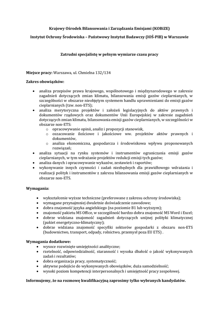 Krajowy Ośrodek Bilansowania i Zarządzania Emisjami (KOBiZE) Instytut Ochrony Środowiska – Państwowy Instytut Badawczy (IOŚ-PIB) w Warszawie Zatrudni specjalistę w pełnym wymiarze czasu pracy Miejsce pracy: Warszawa, ul. Chmielna 132/134 Zakres obowiązków: analiza przepisów prawa krajowego, wspólnotowego i międzynarodowego w zakresie zagadnień dotyczących zmian klimatu, bilansowania emisji gazów cieplarnianych, w szczególności w obszarze nieobjętym systemem handlu uprawnieniami do emisji gazów cieplarnianych (tzw. non-ETS); analiza merytoryczna projektów i założeń legislacyjnych do aktów prawnych i dokumentów rządowych oraz dokumentów Unii Europejskiej w zakresie zagadnień dotyczących zmian klimatu, bilansowania emisji gazów cieplarnianych, w szczególności w obszarze non-ETS: o opracowywanie opinii, analiz i propozycji stanowisk, o oszacowanie ilościowe i jakościowe ww. projektów aktów prawnych i dokumentów, o analiza ekonomiczna, gospodarcza i środowiskowa wpływu proponowanych rozwiązań; analiza sytuacji na rynku systemów i instrumentów ograniczania emisji gazów cieplarnianych, w tym wdrażanie projektów redukcji emisji tych gazów; analiza danych i opracowywanie wykazów, zestawień i raportów; wykonywanie innych czynności i zadań niezbędnych dla prawidłowego wdrażania i realizacji polityk i instrumentów z zakresu bilansowania emisji gazów cieplarnianych w obszarze non-ETS. Wymagania: wykształcenie wyższe techniczne (preferowane z zakresu ochrony środowiska); wymagane przynajmniej dwuletnie doświadczenie zawodowe; dobra znajomość języka angielskiego (na poziomie B1 lub wyższym); znajomość pakietu MS Office, w szczególność bardzo dobra znajomość MS Word i Excel; dobrze widziana znajomość zagadnień dotyczących unijnej polityki klimatycznej (pakiet energetyczno-klimatyczny); dobrze widziana znajomość specyfiki sektorów gospodarki z obszaru non-ETS (budownictwo, transport, odpady, rolnictwo, przemysł poza EU ETS) . Wymagania dodatkowe: wysoce rozwinięte umiejętności analityczne; rzetelność, odpowiedzialność, staranność i wysoka dbałość o jakość wykonywanych zadań i rezultatów; dobra organizacja pracy, systematyczność; aktywne podejście do wykonywanych obowiązków, duża samodzielność; wysoki poziom kompetencji interpersonalnych i umiejętność pracy zespołowej. Informujemy, że na rozmowę kwalifikacyjną zaprosimy tylko wybranych kandydatów. Oferujemy: atrakcyjne wynagrodzenie, praca w dobrej atmosferze, stabilne zatrudnienie. Osoby zainteresowane prosimy o przesłanie CV ze zdjęciem wraz z listem motywacyjnym w terminie do dnia 1 grudnia 2016 r. na adres poczty elektronicznej [email protected] z dopiskiem w temacie wiadomości „Rekrutacja”. Prosimy o zamieszczenie w życiorysie następującej klauzuli: Wyrażam zgodę na przetwarzanie moich danych osobowych dla potrzeb niezbędnych do realizacji procesu rekrutacji na stanowisko specjalisty /zgodnie z Ustawą z dnia 29 sierpnia1997 r. o ochronie danych osobowych, t.j. Dz. U. z 2016 r., poz. 922/. Aplikacje nie zawierające powyższej klauzuli nie będą rozpatrywane w procesie rekrutacyjnym. Nadesłanych dokumentów nie zwracamy. Po zakończeniu rekrutacji wszystkie aplikacje zostaną komisyjnie zniszczone.