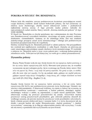 POKORA W REGULE ŚW. BENEDYKTA Pokora była dla mnichów zawsze podstawowym kryterium pozwalającym ocenić czyjąś duchową wielkość. Jeżeli komuś brakowało pokory, nie był uznawany za mistrza życia duchowego, choćby nawet dokonywał cudów i praktykował najbardziej surową ascezę. Z tego powodu nauka pokory należała do najważniejszych zadań mnicha. Starcy mówili: „Koroną mnicha jest pokora” (2 Apo XXIII 12[1098]). W Regule św. Benedykta co chwilę spotykamy się z odniesieniem do niej. Powinna ona charakteryzować wszystkich mnichów, zaczynając od opata, przeora, szafarza, dziekanów, rzemieślników, furtiana, aż do ostatniego brata. Jest ona znakiem autentycznego przyjęcia zasad życia monastycznego i dlatego jest podstawowym kryterium przyjmowania braci do wspólnoty. Siódmy rozdział Reguły św. Benedykt poświęcił w całości pokorze. Nie przypadkiem ten rozdział jest najdłuższym rozdziałem w całej Regule. Zamyka on pierwszą jej część omawiającą najważniejsze zasady duchowe życia monastycznego. W rozdziale o pokorze św. Benedykt mówi o tym, czym pokora jest, i wskazuje jednocześnie jej zasadnicze cechy. Tekst jest na tyle klasyczny, że warto go w całości przeanalizować. Dynamika pokory Bracia, Pismo Święte woła do nas: Każdy bowiem kto się wywyższa, będzie poniżony, a kto się uniża, będzie wywyższony (Łk 14,11). Słowami tymi poucza nas, że wszelkie wynoszenie się jest rodzajem pychy. Jej to wystrzega się Prorok, który mówi: Moje serce nie pyszni się, Panie, i oczy moje nie patrzą wyniośle. Nie gonię za tym, co wielkie, albo dla mnie zbyt jest wysokie. Co by się jednak stało, gdybym nie myślał pokornie, gdybym wynosił moją duszę? Postąpiłbyś z moją duszą, jak z małym dzieckiem na łonie jego matki (Ps 130,2 Wlg – RegBen 7,1–4). Zasada: Każdy bowiem kto się wywyższa, będzie poniżony, a kto się uniża, będzie wywyższony (Łk 14,11), jest podstawowym prawem życia duchowego. Niestety nie zawsze o niej pamiętamy. Z obserwacji widzimy, że często ci, którzy się wynoszą, są w społeczeństwie uznawani i szanowani, a ludzie pokorni, niemający tupetu, nieumiejący walczyć o siebie, są zapomniani, a często nawet upokarzani. Takie obserwacje wydają się przeczyć prawdziwości tej zasady. Oczywiście można przytoczyć szereg pozytywnych przykładów, gdy człowiek pokorny doszedł do wielkiego uznania, ale pewnie można by przytoczyć wiele przykładów odwrotnych, kiedy właśnie pyszni zdobywali laury i uznanie ludzi. I w życiu doczesnym tak się działo i pewnie będzie tak nadal. Sformułowania: „będzie poniżony” i „będzie wywyższony” oznaczają, że to Bóg go odpowiednio poniży lub wywyższy. I wcale nie ma mowy o poniżeniu lub wywyższeniu na tym świecie. Przytoczona zasada najwyraźniej ukazuje swoją prawdziwość na przykładzie postaci Najświętszej Maryi Panny. W Magnificat śpiewała: Wielbi dusza moja Pana i raduje się duch mój w Bogu, moim Zbawcy. Bo wejrzał na uniżenie Służebnicy swojej. Oto bowiem odtąd błogosławić mnie będą wszystkie pokolenia, gdyż wielkie rzeczy uczynił mi Wszechmocny; a Święte jest Jego imię (Łk 1,46–49). Bóg spojrzał na „uniżenie” i uczynił „wielkie rzeczy”! W Jej życiu objawiło się to w sposób doskonały, ale zauważmy, nie w życiu doczesnym! Na ziemi nie znalazła wielkiego uznania. Uznanie takie pojawiło się dopiero po wiekach. Dzisiaj Kościół widzi w Niej Królową nieba! „Wywyższenie” i „uniżenie” można oczywiście zamienić miejscami, ustawiając odwrotnie hierarchię wartości, i wówczas można się tak „uniżać”, by być w tym uniżeniu „największym”. Niezależnie od wstępnego założenia co do tego, na czym polega wielkość, a na czym małość, u podstaw wywyższania się jest porównywanie się z innymi według ustalonej miary. W prawdziwej pokorze natomiast, jak już mówiliśmy, nie ma żadnego porównywania się. Droga każdego z nas jest zupełnie inna. Każdy powinien odnaleźć swoje miejsce i powołanie w życiu. Każde powołanie z kolei jest służbą dla innych i z tej służby czerpie swoją godność. Z kolei naszym życiem rządzą takie same prawa duchowe. I jeżeli uważamy się za mądrych we własnych sprawach, grzeszymy wyniosłością. Zazwyczaj staramy się wówczas uzyskać potwierdzenie naszej wspaniałości przez uznanie w oczach innych. Zamiast skoncentrować się na dobru naszej posługi, przejmujemy się opinią innych. Warunkiem prawdziwego wzrostu jest pokora, świadomość skromności własnych dokonań przy jednoczesnej świadomości, że to Bóg w nas dokonuje prawdziwego dobra. Dlatego pokora przejawia się skromnością i spokojną ufnością w Boże miłosierdzie na wzór „dziecka na łonie jego matki”. Tak więc, bracia, jeżeli chcemy osiągnąć szczyt wielkiej pokory i jeśli chcemy szybko dojść do tego wywyższenia w niebie, do którego dochodzi się przez uniżenie w życiu ziemskim, musimy, wstępując do góry po stopniach naszych czynów, wznieść ową drabinę, która ukazała się we śnie Jakubowi. Na niej to widział on zstępujących i wstępujących aniołów (por. Rdz 28,12). Nie ulega wątpliwości, że to zstępowanie i wstępowanie oznacza po prostu, iż wynosząc się, schodzimy w dół, wstępujemy natomiast ku górze przez pokorę. Ustawiona drabina to nasze życie na świecie, które Pan podnosi ku niebu, gdy serce stanie się pokorne. Dwoma bocznymi żerdziami tej drabiny są, jak sądzimy, nasze ciało i dusza, a wzywająca nas łaska Boża umieściła w nich różne szczeble pokory i karności zakonnej, po których do góry wstępujemy (RegBen 7,5–9). Starając się omówić pokorę w języku dążenia do doskonałości, dochodzimy do paradoksów. Są one zawarte już w przytoczonej wypowiedzi Pana Jezusa: kto się wywyższa, będzie poniżony, a kto się uniża, będzie wywyższony (