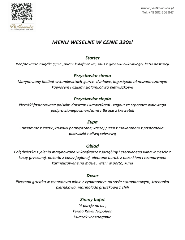 www.pestkownica.pl Tel. +48 502 606 847 MENU WESELNE W CENIE 320zl Starter Konfitowane żołądki gęsie ,puree kalafiorowe, mus z groszku cukrowego, listki nasturcji Przystawka zimna Marynowany halibut w kumkwatach ,puree dyniowe, lagustynka okraszona czarnym kawiorem i dzikimi ziołami,oliwa pietruszkowa Przystawka ciepła Pierożki faszerowane polskim dorszem i krewetkami , ragout ze szpondra wołowego podprawionego smardzami z Bisque z krewetek Zupa Consomme z kaczki,kawałki podwędzonej kaczej piersi z makaronem z pasternaka i pietruszki z oliwą selerową Obiad Polędwiczka z jelenia marynowana w konfiturze z jarzębiny i czerwonego wina w cieście z kaszy gryczanej, polenta z kaszy jaglanej, pieczone buraki z czosnkiem i rozmarynem karmelizowane na maśle , wiśni w porto, kurki Deser Pieczona gruszka w czerwonym winie z cynamonem na sosie szampanowym, kruszonka piernikowa, marmolada gruszkowa z chili Zimny bufet (4 porcje na os ) Terina Royal Napoleon Kurczak w estragonie www.pestkownica.pl Tel. +48 502 606 847 Terina z peklowanej giczy wieprzowej z czosnkiem i musztardą dijon Schab faszerowany musem kaparowym Wędzona pierś kacza z dresingiem malinowym Galantyna z kurczaka z oliwkami Pasztet z dzika z sosem jeżynowo-kurkowym Cielęcina szpikowana jabłkami i goździkami Mięsa i wędliny z naszej Wędzarni Wędzone ryby Pstrąg marynowany w szampanie i limonkach Łosoś gravlax Pieczywo smakowe Sosy, dresingi Sałatki (3 porcje na os ) Sałatka Nicejska Sałatka z marynowaną wołowiną Sałatka Alberta Sałatka Cezar Sałatka Horiatiki Marynowane warzywa Desery (3 porcje na os ) Mus z leśnych owoców Rolada orzechowa w czekoladzie Mini ptysie z kremem waniliowym Sernik Bacardi Szarlotka z morelami Ciepły bufet (2 porcje na os ) www.pestkownica.pl Tel. +48 502 606 847 Barszcz z paluszkiem kminkowym Beef Strogonoff Pieczona peklowana karkówka z trawa żubrową Kluseczki ziemniaczane z borowikiem Potrawka z soczewicy Pieczone ziemniaki z czosnkiem i tymiankiem Kapusta z grzybami Karmelizowane warzywa na maśle