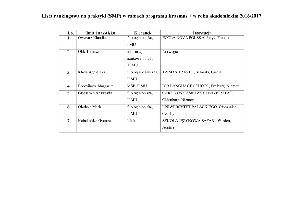 Lista rankingowa na praktyki (SMP) w ramach programu Erasmus + w roku akademickim 2016/2017 Lp. Imię i nazwisko Owczarz Klaudia 1. Kierunek filologia polska, Instytucja ECOLA NOVA POLSKA, Paryż, Francja I MU 2. Olik Tomasz informacja Norwegia naukowa i bibl., II MU 3. Kloza Agnieszka filologia klasyczna, TZIMAS TRAVEL, Saloniki, Grecja II MU 4. Borovikova Margarita MSP, II MU IOR LANGUAGE SCHOOL, Freiburg, Niemcy 5. Grytsenko Anastasiia filologia polska, CARL VON OSSIETZKY UNIVERSITAT, II MU Oldenburg, Niemcy filologia polska, UNIWERSYTET PALACKIEGO, Ołomuniec, II MU Czechy I dokt. SZKOŁA JĘZYKOWA SAFARI, Wiedeń, 6. 7. Olędzka Maria Kobakhidze Gvantsa Austria