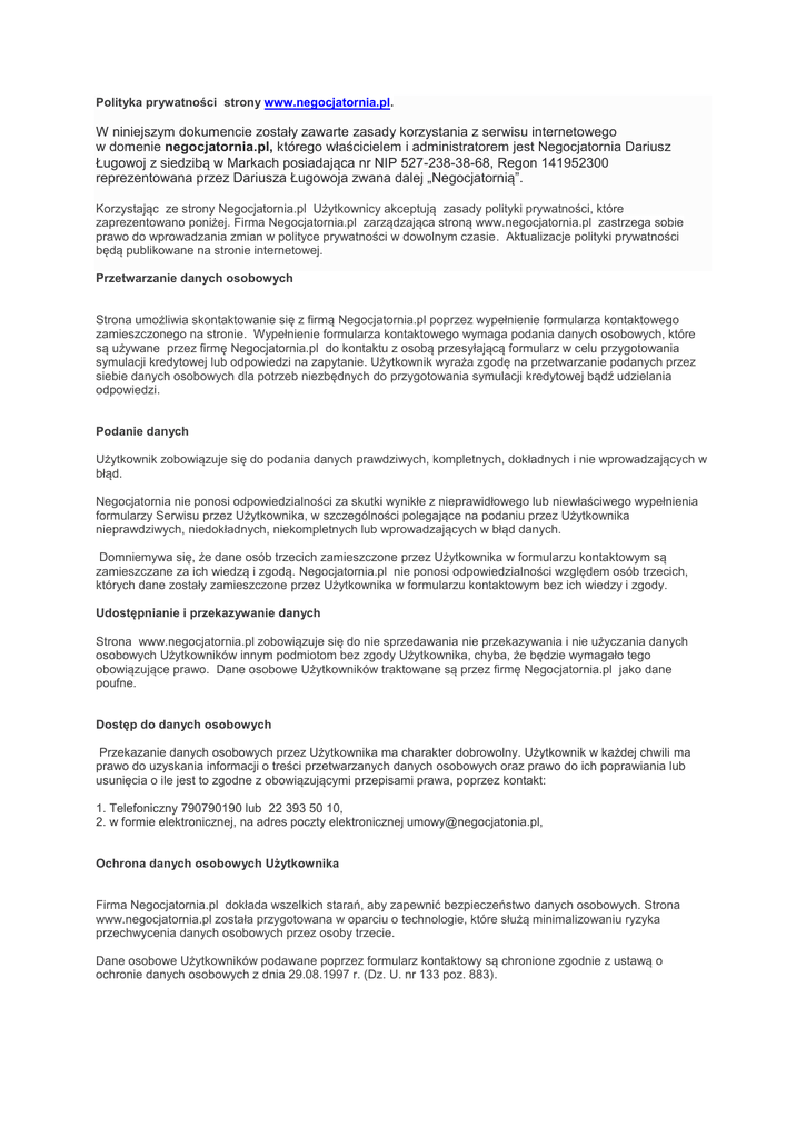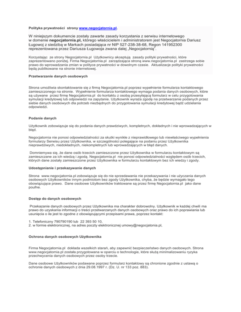 Polityka prywatności strony www.negocjatornia.pl. W niniejszym dokumencie zostały zawarte zasady korzystania z serwisu internetowego w domenie negocjatornia.pl, którego właścicielem i administratorem jest Negocjatornia Dariusz Ługowoj z siedzibą w Markach posiadająca nr NIP 527-238-38-68, Regon 141952300 reprezentowana przez Dariusza Ługowoja zwana dalej „Negocjatornią”. Korzystając ze strony Negocjatornia.pl Użytkownicy akceptują zasady polityki prywatności, które zaprezentowano poniżej. Firma Negocjatornia.pl zarządzająca stroną www.negocjatornia.pl zastrzega sobie prawo do wprowadzania zmian w polityce prywatności w dowolnym czasie. Aktualizacje polityki prywatności będą publikowane na stronie internetowej. Przetwarzanie danych osobowych Strona umożliwia skontaktowanie się z firmą Negocjatornia.pl poprzez wypełnienie formularza kontaktowego zamieszczonego na stronie. Wypełnienie formularza kontaktowego wymaga podania danych osobowych, które są używane przez firmę Negocjatornia.pl do kontaktu z osobą przesyłającą formularz w celu przygotowania symulacji kredytowej lub odpowiedzi na zapytanie. Użytkownik wyraża zgodę na przetwarzanie podanych przez siebie danych osobowych dla potrzeb niezbędnych do przygotowania symulacji kredytowej bądź udzielania odpowiedzi. Podanie danych Użytkownik zobowiązuje się do podania danych prawdziwych, kompletnych, dokładnych i nie wprowadzających w błąd. Negocjatornia nie ponosi odpowiedzialności za skutki wynikłe z nieprawidłowego lub niewłaściwego wypełnienia formularzy Serwisu przez Użytkownika, w szczególności polegające na podaniu przez Użytkownika nieprawdziwych, niedokładnych, niekompletnych lub wprowadzających w błąd danych. Domniemywa się, że dane osób trzecich zamieszczone przez Użytkownika w formularzu kontaktowym są zamieszczane za ich wiedzą i zgodą. Negocjatornia.pl nie ponosi odpowiedzialności względem osób trzecich, których dane zostały zamieszczone przez Użytkownika w formularzu kontaktowym bez ich wiedzy i zgody. Udostępnianie i przekazywanie danych Strona www.negocjatornia.pl zobowiązuje się do nie sprzedawania nie przekazywania i nie użyczania danych osobowych Użytkowników innym podmiotom bez zgody Użytkownika, chyba, że będzie wymagało tego obowiązujące prawo. Dane osobowe Użytkowników traktowane są przez firmę Negocjatornia.pl jako dane poufne. Dostęp do danych osobowych Przekazanie danych osobowych przez Użytkownika ma charakter dobrowolny. Użytkownik w każdej chwili ma prawo do uzyskania informacji o treści przetwarzanych danych osobowych oraz prawo do ich poprawiania lub usunięcia o ile jest to zgodne z obowiązującymi przepisami prawa, poprzez kontakt: 1. Telefoniczny 790790190 lub 22 393 50 10, 2. w formie elektronicznej, na adres poczty elektronicznej [email protected], Ochrona danych osobowych Użytkownika Firma Negocjatornia.pl dokłada wszelkich starań, aby zapewnić bezpieczeństwo danych osobowych. Strona www.negocjatornia.pl została przygotowana w oparciu o technologie, które służą minimalizowaniu ryzyka przechwycenia danych osobowych przez osoby trzecie. Dane osobowe Użytkowników podawane poprzez formularz kontaktowy są chronione zgodnie z ustawą o ochronie danych osobowych z dnia 29.08.1997 r. (Dz. U. nr 133 poz. 883). Cookies Strona internetowa firmy Negocjatornia.pl wykorzystuje technologie plików cookie. Cookies są to niewielkie pliki danych, które podczas przeglądania strony przez Użytkownika pobierają dane nie- personalne Użytkownika. Przetwarzane dane są kompletnie nie związane z danymi przesyłanymi przez formularz kontaktowy. Pliki te pozwalają na przechowywaniu informacji o sesji Użytkownika oraz tworzenia statystyk dotyczących sposobu korzystania z naszej strony. Domyślne ustawienia oprogramowania do przeglądania storn internetowych (przeglądarka internetowa) dopuszczają do przechowywania plików cookies w urządzeniu końcowym Użytkownika. W każdym czasie Użytkownik może zmienić preferencje dotyczące plików Cookies wprowadzając zmiany w ustawienia przeglądarki internetowej. Zmiany te mogą skutkować spowolnieniem działania strony internetowej bądź brakiem dostępu do poszczególnych jej części.