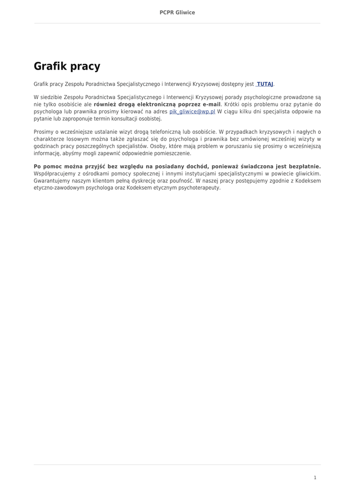 PCPR Gliwice Grafik pracy Grafik pracy Zespołu Poradnictwa Specjalistycznego i Interwencji Kryzysowej dostępny jest TUTAJ. W siedzibie Zespołu Poradnictwa Specjalistycznego i Interwencji Kryzysowej porady psychologiczne prowadzone są nie tylko osobiście ale również drogą elektroniczną poprzez e-mail. Krótki opis problemu oraz pytanie do psychologa lub prawnika prosimy kierować na adres [email protected] W ciągu kilku dni specjalista odpowie na pytanie lub zaproponuje termin konsultacji osobistej. Prosimy o wcześniejsze ustalanie wizyt drogą telefoniczną lub osobiście. W przypadkach kryzysowych i nagłych o charakterze losowym można także zgłaszać się do psychologa i prawnika bez umówionej wcześniej wizyty w godzinach pracy poszczególnych specjalistów. Osoby, które mają problem w poruszaniu się prosimy o wcześniejszą informację, abyśmy mogli zapewnić odpowiednie pomieszczenie. Po pomoc można przyjść bez względu na posiadany dochód, ponieważ świadczona jest bezpłatnie. Współpracujemy z ośrodkami pomocy społecznej i innymi instytucjami specjalistycznymi w powiecie gliwickim. Gwarantujemy naszym klientom pełną dyskrecję oraz poufność. W naszej pracy postępujemy zgodnie z Kodeksem etyczno-zawodowym psychologa oraz Kodeksem etycznym psychoterapeuty. 1