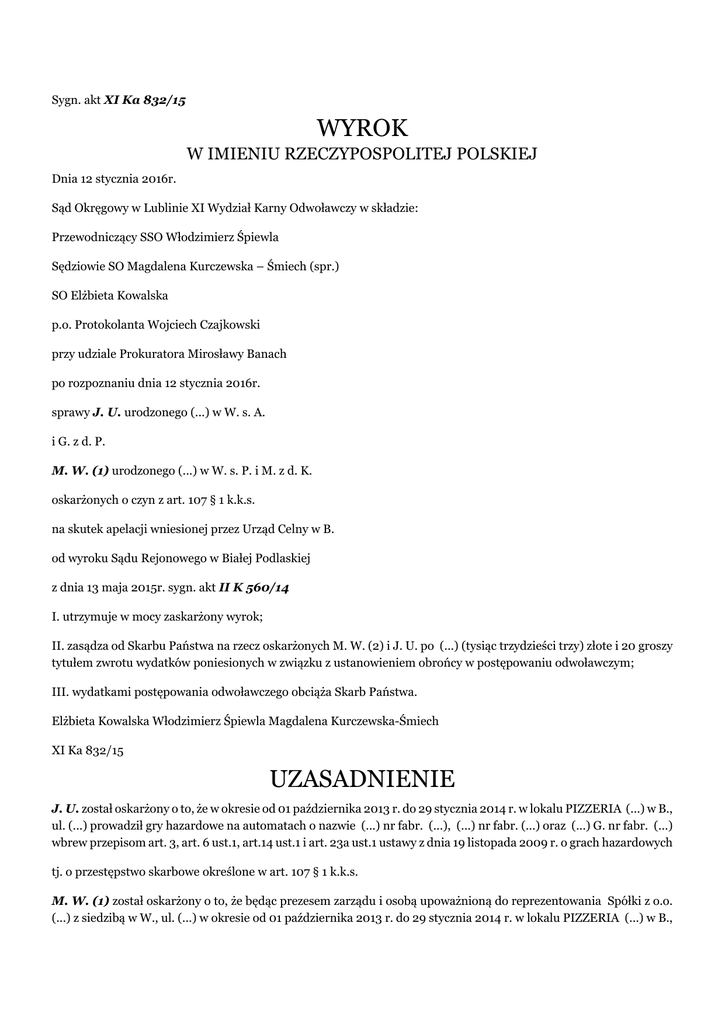 Sygn. akt XI Ka 832/15 WYROK W IMIENIU RZECZYPOSPOLITEJ POLSKIEJ Dnia 12 stycznia 2016r. Sąd Okręgowy w Lublinie XI Wydział Karny Odwoławczy w składzie: Przewodniczący SSO Włodzimierz Śpiewla Sędziowie SO Magdalena Kurczewska – Śmiech (spr.) SO Elżbieta Kowalska p.o. Protokolanta Wojciech Czajkowski przy udziale Prokuratora Mirosławy Banach po rozpoznaniu dnia 12 stycznia 2016r. sprawy J. U. urodzonego (...) w W. s. A. i G. z d. P. M. W. (1) urodzonego (...) w W. s. P. i M. z d. K. oskarżonych o czyn z art. 107 § 1 k.k.s. na skutek apelacji wniesionej przez Urząd Celny w B. od wyroku Sądu Rejonowego w Białej Podlaskiej z dnia 13 maja 2015r. sygn. akt II K 560/14 I. utrzymuje w mocy zaskarżony wyrok; II. zasądza od Skarbu Państwa na rzecz oskarżonych M. W. (2) i J. U. po (...) (tysiąc trzydzieści trzy) złote i 20 groszy tytułem zwrotu wydatków poniesionych w związku z ustanowieniem obrońcy w postępowaniu odwoławczym; III. wydatkami postępowania odwoławczego obciąża Skarb Państwa. Elżbieta Kowalska Włodzimierz Śpiewla Magdalena Kurczewska-Śmiech XI Ka 832/15 UZASADNIENIE J. U. został oskarżony o to, że w okresie od 01 października 2013 r. do 29 stycznia 2014 r. w lokalu PIZZERIA (...) w B., ul. (...) prowadził gry hazardowe na automatach o nazwie (...) nr fabr. (...), (...) nr fabr. (...) oraz (...) G. nr fabr. (...) wbrew przepisom art. 3, art. 6 ust.1, art.14 ust.1 i art. 23a ust.1 ustawy z dnia 19 listopada 2009 r. o grach hazardowych tj. o przestępstwo skarbowe określone w art. 107 § 1 k.k.s. M. W. (1) został oskarżony o to, że będąc prezesem zarządu i osobą upoważnioną do reprezentowania Spółki z o.o. (...) z siedzibą w W., ul. (...) w okresie od 01 października 2013 r. do 29 stycznia 2014 r. w lokalu PIZZERIA (...) w B., ul. (...) urządzał gry hazardowe na automatach o nazwie (...) nr fabr. (...), (...) nr fabr. (...) oraz (...) G. nr fabr. (...) wbrew przepisom art. 3, art. 6 ust.1, art.14 ust.1 i art. 23a ust.1 ustawy z dnia 19 listopada 2009 r. o grach hazardowych tj. o przestępstwo skarbowe określone w art. 107 § 1 k.k.s. Wyrokiem z dnia 13 maja 2015 r. Sąd Rejonowy w Białej Podlaskiej: 1. J. U. uniewinnił od zarzucanego mu czynu. 2. M. W. (1) uniewinnił od zarzucanego mu czynu. 3. Zasądził od Skarbu Państwa na rzecz J. U. i M. W. (1) kwoty po 870,84 (osiemset siedemdziesiąt i 84/100) złotych tytułem poniesionych przez nich kosztów związanych z ustanowieniem obrońcy w sprawie. 4. Kosztami postępowania obciążył Skarb Państwa. Apelację od powyższego wyroku wniósł oskarżyciel publiczny – Urząd Celny w B.. Zaskarżył wyrok w całości na niekorzyść oskarżonych, a zarzucił mu obrazę przepisów prawa materialnego poprzez błędne przyjęcie przez Sąd pierwszej instancji, iż normy prawne Ustawy o grach hazardowych, w oparciu o które został skonstruowany akt oskarżenia, nie mogą być stosowane odnośnie art. 107 § 1 k.k.s. w związku z wyrokiem Trybunału Sprawiedliwości Unii Europejskiej (dalej (...)) z dnia 19 lipca 2012 r. orzekającym w połączonych sprawach C 213/11, C 214/11 oraz C 217/11. Stawiając powyższy zarzut wniósł o uchylenie zaskarżonego wyroku i przekazanie sprawy do ponownego rozpoznania Sądowi I instancji. Sąd Okręgowy zważył, co następuje: Apelacja nie zasługiwała na uwzględnienie. Sąd odwoławczy podziela stanowisko Sądu Rejonowego, iż w przedmiotowej sprawie nie można twierdzić o wyczerpaniu przez oskarżonych swoim działaniem znamion zarzucanych im czynów z art. 107 § 1 k.k.s. Stan faktyczny sprawy został prawidłowo ustalony przez Sąd I instancji i nie był w sprawie kwestionowany. Zarzut apelacji koncentruje się natomiast na ocenie prawnokarnej zarzuconych oskarżonym czynów, która to ocena, co podkreśla Sąd Okręgowy, musi być dokonywana z uwzględnieniem nie tylko przepisów krajowych ale także, z uwagi na przystąpienie Polski do Unii Europejskiej, z poszanowaniem przepisów unijnych oraz orzecznictwa Trybunału Sprawiedliwości UE. Za przestępstwo karnoskarbowe stypizowane w art. 107 § 1 k.k.s. odpowiada ten, kto wbrew przepisom ustawy lub warunkom koncesji lub zezwolenia urządza lub prowadzi grę losową, grę na automacie lub zakład wzajemny. Istotą tego przestępstwa jest urządzanie lub prowadzenie działalności w zakresie gier losowych, gier na automatach lub zakładów wzajemnych wbrew przepisom ustawy z dnia 19 listopada 2009 roku o grach hazardowych (Dz.U. z dnia 30 listopada 2009 r. Nr 201, poz. 1540). Redakcja przepisu art. 107 § 1 k.k.s. prowadzi do wniosku, że ma on charakter blankietowy, albowiem opis znamion czynu zabronionego znajduje się w przepisach w/w ustawy o grach hazardowych. Przepisami precyzującymi znamiona zarzucanych oskarżonym czynów są art. 3, art. 6 ust.1, art.14 ust.1 i art. 23a ust.1 ustawy, które określają warunki urządzania gier miedzy innymi na automatach w ten sposób, że ich urządzanie jest dozwolone wyłącznie w kasynach gry i tylko na podstawie udzielonej koncesji. Polska, przystępując do Unii Europejskiej z dniem 1 maja 2004 roku, na podstawie art. 2 Traktatu dotyczącego przystąpienia do UE została związana w szczególności dyrektywą 98/34/WE Parlamentu Europejskiego i Rady z dnia 22 czerwca 1998 r. ustanawiającą procedurę udzielania informacji w dziedzinie norm i przepisów technicznych oraz zasad dotyczących usług społeczeństwa informacyjnego (Dz. U. Nr 201, poz. 1540 ze zm.). Należy w tym miejscu zasygnalizować, iż w dniu 7 października 2015 r. weszła w życie dyrektywa (UE) (...) Parlamentu Europejskiego i Rady z dnia 9 września 2015 r. ustanawiająca procedurę udzielania informacji w dziedzinie przepisów technicznych oraz zasad dotyczących usług społeczeństwa informacyjnego (ujednolicenie Dz.U.UE.L.2015.241.1, opublikowany dnia 17 września 2015 r.) i z tą datą uchylona została Dyrektywa 98/34/WE Parlamentu Europejskiego i Rady z d