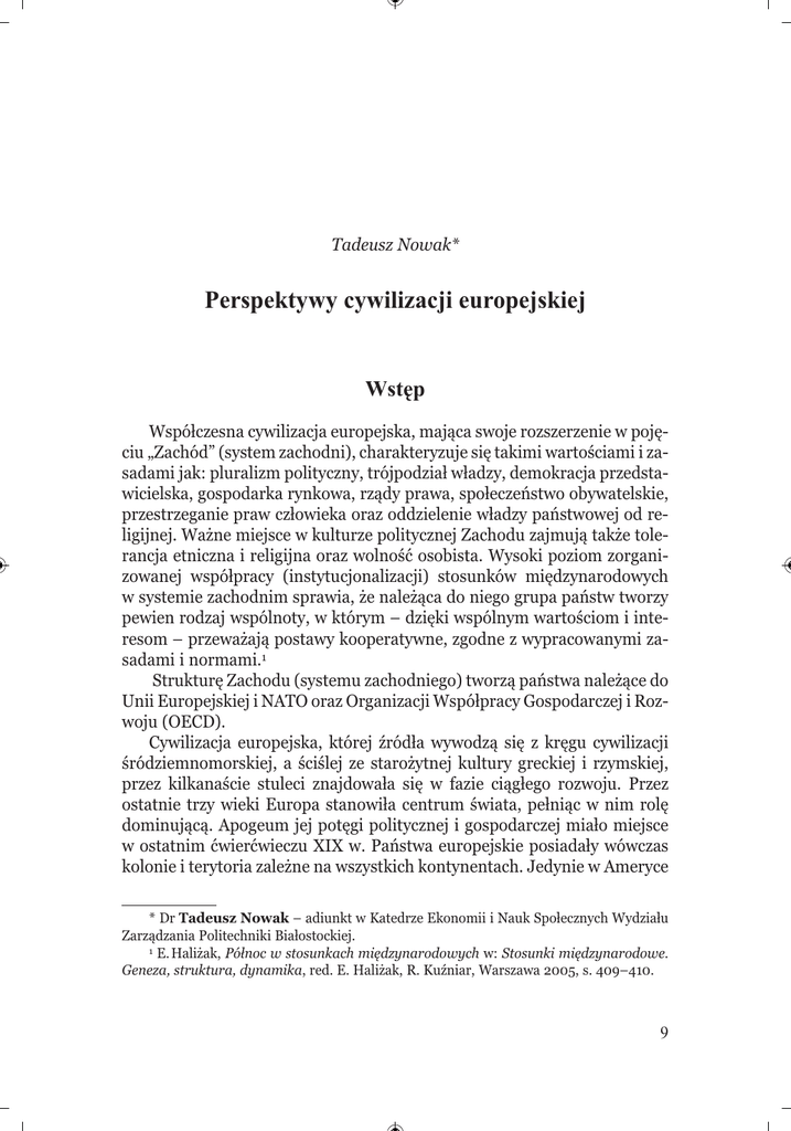 Tadeusz Nowak* Perspektywy cywilizacji europejskiej Wstęp Współczesna cywilizacja europejska, mająca swoje rozszerzenie w pojęciu „Zachód” (system zachodni), charakteryzuje się takimi wartościami i zasadami jak: pluralizm polityczny, trójpodział władzy, demokracja przedstawicielska, gospodarka rynkowa, rządy prawa, społeczeństwo obywatelskie, przestrzeganie praw człowieka oraz oddzielenie władzy państwowej od religijnej. Ważne miejsce w kulturze politycznej Zachodu zajmują także tolerancja etniczna i religijna oraz wolność osobista. Wysoki poziom zorganizowanej współpracy (instytucjonalizacji) stosunków międzynarodowych w systemie zachodnim sprawia, że należąca do niego grupa państw tworzy pewien rodzaj wspólnoty, w którym – dzięki wspólnym wartościom i interesom – przeważają postawy kooperatywne, zgodne z wypracowanymi zasadami i normami.1 Strukturę Zachodu (systemu zachodniego) tworzą państwa należące do Unii Europejskiej i NATO oraz Organizacji Współpracy Gospodarczej i Rozwoju (OECD). Cywilizacja europejska, której źródła wywodzą się z kręgu cywilizacji śródziemnomorskiej, a ściślej ze starożytnej kultury greckiej i rzymskiej, przez kilkanaście stuleci znajdowała się w fazie ciągłego rozwoju. Przez ostatnie trzy wieki Europa stanowiła centrum świata, pełniąc w nim rolę dominującą. Apogeum jej potęgi politycznej i gospodarczej miało miejsce w ostatnim ćwierćwieczu XIX w. Państwa europejskie posiadały wówczas kolonie i terytoria zależne na wszystkich kontynentach. Jedynie w Ameryce * Dr Tadeusz Nowak – adiunkt w Katedrze Ekonomii i Nauk Społecznych Wydziału Zarządzania Politechniki Białostockiej. 1 E. Haliżak, Północ w stosunkach międzynarodowych w: Stosunki międzynarodowe. Geneza, struktura, dynamika, red. E. Haliżak, R. Kuźniar, Warszawa 2005, s. 409–410. 9 Studia Europejskie, 3/2011 Północnej prym wiodły Stany Zjednoczone. Mimo tak ogromnego znaczenia Europy, wiele żyjących w niej narodów nie było wolnych, a poszczególne państwa dzieliła przepaść ekonomiczna. Nie była to zatem Europa marzeń. W XX w. nastąpił w Europie ogromny postęp techniczny i wzrost poziomu życia. Miały jednak miejsce dwie barbarzyńskie, ludobójcze wojny, które pochłonęły dziesiątki milionów ofiar. Pod względem politycznym i moralnym był to zatem wiek klęski, zwłaszcza jego pierwsza połowa. Okazało się, że społeczeństwami wiodącej cywilizacji świata mogą zawładnąć zbrodnicze, totalitarne idee faszyzmu czy komunizmu. Druga połowa XX w. przyniosła powstanie i realizację koncepcji integracyjnych o zasięgu europejskim i transatlantyckim w postaci Rady Europy, Wspólnot Europejskich/Unii Europejskiej, NATO i OBWE, które w ramach współpracy multilateralnej miały jednoczyć świat Zachodu i oddziaływać cywilizacyjnie na świat niezachodni. Przyspieszenie zmian politycznych i gospodarczych w Europie w latach 90. XX w. zdawało się wskazywać na ostateczny triumf liberalnej demokracji i niosło nadzieję na trwały pokój. Euforia towarzysząca transformacji ustrojowej byłych państw obozu socjalistycznego oraz ich wstępowaniu w struktury demokratycznego Zachodu nie trwała jednak długo. Późniejsze wydarzenia, wśród których można wymienić krwawe wojny lokalne związane z rozpadem Jugosławii, kryzys finansowo-gospodarczy, tendencje nacjonalistyczne w krajach europejskich, trudności w rozszerzaniu i pogłębianiu integracji w ramach Unii Europejskiej, zdecydowanie ostudziły atmosferę. Dzisiejsza Europa przestała stanowić centrum świata, jednak proces powojennej integracji stworzył szanse na rozwijanie cywilizacji humanizmu w duchu pokojowej współpracy państw narodowych. Można mieć nadzieję, że złe doświadczenia XX w. „były tylko przejściowym kryzysem, że cywilizacja europejska, która odbudowała się na całym kontynencie pod koniec stulecia, trwale przezwyciężyła swe załamanie”.2 Tymczasem cywilizacja europejska i szerzej rozumiany świat Zachodu ma poczucie kryzysu, z którego trudno znaleźć satysfakcjonujące wyjście. Brakuje pomysłu na przyszłość. Ludzi interesuje głównie utrzymanie stanu wysokiej konsumpcji. Przypomina to sytuację, w jakiej znalazło się Imperium Rzymskie u progu upadku. W wyniku piętrzących się trudności odgradzało się od świata zewnętrznego, wrogiego i nieprzewidywalnego.3 Dziś świat niezachodni również traktuje się jako źródło zagrożenia, według schematycznych J. Holzer, Europa wojen. 1914–1945, Warszawa 2008, s. 14. Dylematy rozwoju, z R. Kapuścińskim rozmawia J. Gaul, „Przegląd Powszechny” nr 6/1996. 2 3 10 T. Nowak, Perspektywy cywilizacji europejskiej skojarzeń: islam to fundamentalizm religijny i terroryści, Rosja to mafia i odradzające się imperium, Afryka i Azja to niechciani imigranci i obszar politycznie niestabilny. Powyższe konstatacje zachęcają do prześledzenia niektórych prawidłowości i uwarunkowań mogących mieć wpływ na cywilizacyjne losy Europy, a także do podjęcia próby określenia jej miejsca w wielkiej transformacji świata. Inspirację do zaprezentowanych w dalszej części tekstu rozważań stanowiły w znacznej mierze ciekawe spostrzeżenia w zakresie cywilizacyjnej perspektywy postrzegania świata, jakich dostarcza publicystyka Ryszarda Kapuścińskiego.4 Dialektyka zmian cywilizacyjnych w Europie i na świecie Istotą cywilizacji, czego dowodził Giambattista Vico,5 a także Arnold Joseph Toynbee,6 musi być dynamika. Cywilizacja istnieje tak długo, jak długo znajduje się w fazie ekspansji i radzi sobie z pojawiającymi się problemami. W pewnym momencie spotyka się z wyzwaniem, któremu nie potrafi stawić czoła. Wówczas następuje jej zmierzch. Tym przełomowym wyzwaniem – według Toynbee’ego – jest najczęściej konieczność politycznego zjednoczenia. Materialno-duchowy rozwój cywilizacji stawia obiektywny wymóg pos