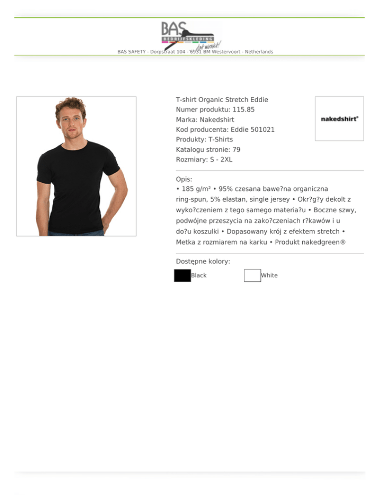 BAS SAFETY - Dorpstraat 104 - 6931 BM Westervoort - Netherlands T-shirt Organic Stretch Eddie Numer produktu: 115.85 Marka: Nakedshirt Kod producenta: Eddie 501021 Produkty: T-Shirts Katalogu stronie: 79 Rozmiary: S - 2XL Opis: • 185 g/m² • 95% czesana bawe?na organiczna ring-spun, 5% elastan, single jersey • Okr?g?y dekolt z wyko?czeniem z tego samego materia?u • Boczne szwy, podwójne przeszycia na zako?czeniach r?kawów i u do?u koszulki • Dopasowany krój z efektem stretch • Metka z rozmiarem na karku • Produkt nakedgreen® Dostępne kolory: Black White
