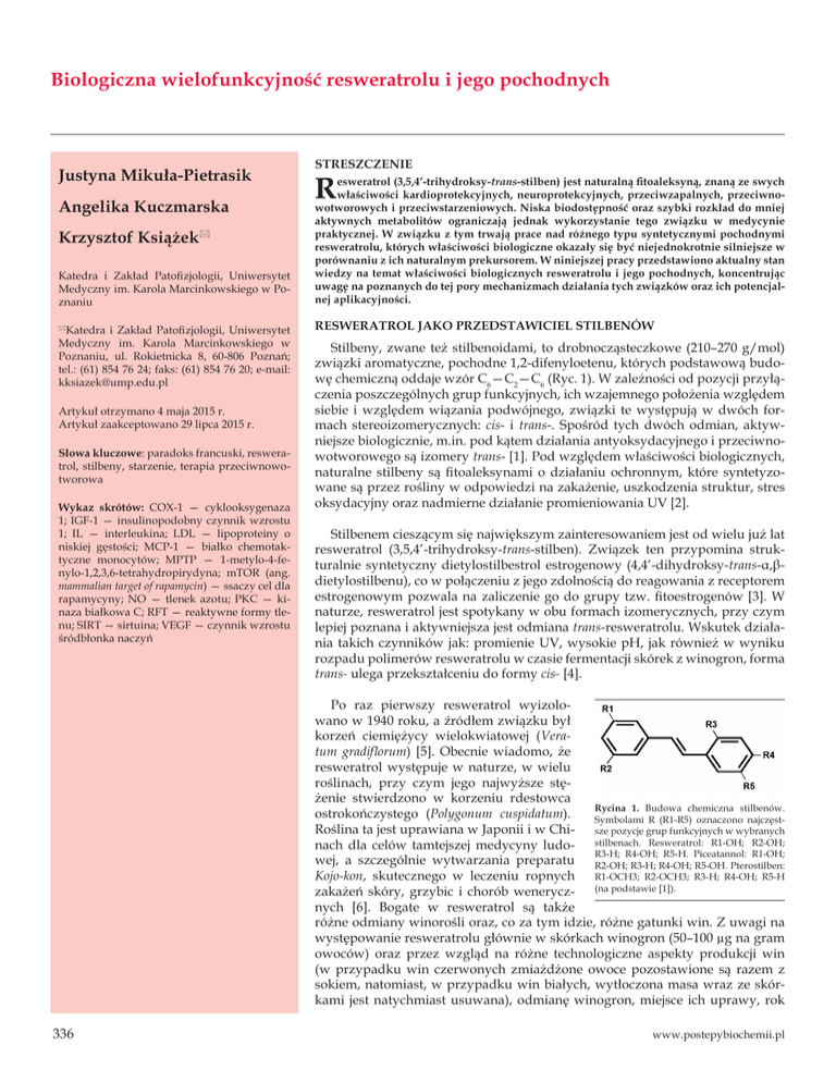 Biologiczna wielofunkcyjność resweratrolu i jego pochodnych Justyna Mikuła-Pietrasik Angelika Kuczmarska Krzysztof Książek* Katedra i Zakład Patofizjologii, Uniwersytet Medyczny im. Karola Marcinkowskiego w Poznaniu Katedra i Zakład Patofizjologii, Uniwersytet Medyczny im. Karola Marcinkowskiego w Poznaniu, ul. Rokietnicka 8, 60-806 Poznań; tel.: (61) 854 76 24; faks: (61) 854 76 20; e-mail: [email protected] * Artykuł otrzymano 4 maja 2015 r. Artykuł zaakceptowano 29 lipca 2015 r. Słowa kluczowe: paradoks francuski, resweratrol, stilbeny, starzenie, terapia przeciwnowotworowa Wykaz skrótów: COX-1 — cyklooksygenaza 1; IGF-1 — insulinopodobny czynnik wzrostu 1; IL — interleukina; LDL — lipoproteiny o niskiej gęstości; MCP-1 — białko chemotaktyczne monocytów; MPTP — 1-metylo-4-fenylo-1,2,3,6-tetrahydropirydyna; mTOR (ang. mammalian target of rapamycin) — ssaczy cel dla rapamycyny; NO — tlenek azotu; PKC — kinaza białkowa C; RFT — reaktywne formy tlenu; SIRT — sirtuina; VEGF — czynnik wzrostu śródbłonka naczyń STRESZCZENIE R esweratrol (3,5,4’-trihydroksy-trans-stilben) jest naturalną fitoaleksyną, znaną ze swych właściwości kardioprotekcyjnych, neuroprotekcyjnych, przeciwzapalnych, przeciwnowotworowych i przeciwstarzeniowych. Niska biodostępność oraz szybki rozkład do mniej aktywnych metabolitów ograniczają jednak wykorzystanie tego związku w medycynie praktycznej. W związku z tym trwają prace nad różnego typu syntetycznymi pochodnymi resweratrolu, których właściwości biologiczne okazały się być niejednokrotnie silniejsze w porównaniu z ich naturalnym prekursorem. W niniejszej pracy przedstawiono aktualny stan wiedzy na temat właściwości biologicznych resweratrolu i jego pochodnych, koncentrując uwagę na poznanych do tej pory mechanizmach działania tych związków oraz ich potencjalnej aplikacyjności. RESWERATROL JAKO PRZEDSTAWICIEL STILBENÓW Stilbeny, zwane też stilbenoidami, to drobnocząsteczkowe (210–270 g/mol) związki aromatyczne, pochodne 1,2-difenyloetenu, których podstawową budowę chemiczną oddaje wzór C6—C2—C6 (Ryc. 1). W zależności od pozycji przyłączenia poszczególnych grup funkcyjnych, ich wzajemnego położenia względem siebie i względem wiązania podwójnego, związki te występują w dwóch formach stereoizomerycznych: cis- i trans-. Spośród tych dwóch odmian, aktywniejsze biologicznie, m.in. pod kątem działania antyoksydacyjnego i przeciwnowotworowego są izomery trans- [1]. Pod względem właściwości biologicznych, naturalne stilbeny są fitoaleksynami o działaniu ochronnym, które syntetyzowane są przez rośliny w odpowiedzi na zakażenie, uszkodzenia struktur, stres oksydacyjny oraz nadmierne działanie promieniowania UV [2]. Stilbenem cieszącym się największym zainteresowaniem jest od wielu już lat resweratrol (3,5,4’-trihydroksy-trans-stilben). Związek ten przypomina strukturalnie syntetyczny dietylostilbestrol estrogenowy (4,4’-dihydroksy-trans-α,βdietylostilbenu), co w połączeniu z jego zdolnością do reagowania z receptorem estrogenowym pozwala na zaliczenie go do grupy tzw. fitoestrogenów [3]. W naturze, resweratrol jest spotykany w obu formach izomerycznych, przy czym lepiej poznana i aktywniejsza jest odmiana trans-resweratrolu. Wskutek działania takich czynników jak: promienie UV, wysokie pH, jak również w wyniku rozpadu polimerów resweratrolu w czasie fermentacji skórek z winogron, forma trans- ulega przekształceniu do formy cis- [4]. Po raz pierwszy resweratrol wyizolowano w 1940 roku, a źródłem związku był korzeń ciemiężycy wielokwiatowej (Veratum gradiflorum) [5]. Obecnie wiadomo, że resweratrol występuje w naturze, w wielu roślinach, przy czym jego najwyższe stężenie stwierdzono w korzeniu rdestowca Rycina 1. Budowa chemiczna stilbenów. ostrokończystego (Polygonum cuspidatum). Symbolami R (R1-R5) oznaczono najczęstRoślina ta jest uprawiana w Japonii i w Chi- sze pozycje grup funkcyjnych w wybranych nach dla celów tamtejszej medycyny ludo- stilbenach. Resweratrol: R1-OH; R2-OH; R3-H; R4-OH; R5-H. Piceatannol: R1-OH; wej, a szczególnie wytwarzania preparatu R2-OH; R3-H; R4-OH; R5-OH. Pterostilben: Kojo-kon, skutecznego w leczeniu ropnych R1-OCH3; R2-OCH3; R3-H; R4-OH; R5-H zakażeń skóry, grzybic i chorób wenerycz- (na podstawie [1]). nych [6]. Bogate w resweratrol są także różne odmiany winorośli oraz, co za tym idzie, różne gatunki win. Z uwagi na występowanie resweratrolu głównie w skórkach winogron (50–100 µg na gram owoców) oraz przez wzgląd na różne technologiczne aspekty produkcji win (w przypadku win czerwonych zmiażdżone owoce pozostawione są razem z sokiem, natomiast, w przypadku win białych, wytłoczona masa wraz ze skórkami jest natychmiast usuwana), odmianę winogron, miejsce ich uprawy, rok 336www.postepybiochemii.pl zbioru oraz warunki atmosferyczne, poszczególne gatunki win charakteryzują się odmienną zawartością resweratrolu (zakres od 0,1 do 15 mg/l). Największe jego stężenia stwierdza się winach czerwonych (średnie stężenie ~1,9 mg/l), następnie w winach różowych, natomiast najmniejsza zawartość resweratrolu jest w winach białych. Szczególnie bogate w ten związek są wina z owoców dojrzewających w chłodniejszym klimacie [7]. W niższych stężeniach związek ten występuje także w orzeszkach ziemnych, owocach jagodowych, żurawinie, truskawkach, ciemiężycy białej, sośnie zwyczajniej, rabarbarze, orchidei, pomidrach i kakao [8]. WŁAŚCIWOŚCI BIOLOGICZNE RESWERATROLU Wchłanianie resweratrolu w organizmie człowieka następuje w jelicie cienkim. Przekształcany jest on w wątrobie, przy udziale cytochromu P450, czego efektem jest wytworzenie piceatannolu (3,3’,4’,5-tetrahydroksy-stilbenu) i tetrahydroksystilbenu o symbolu M1. Okres połowicznego rozpadu resweratrolu jest niewielki i waha się od 8 do 14 minut [9]. Ostatecznymi jego m