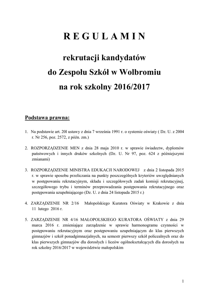 REGULAMIN rekrutacji kandydatów do Zespołu Szkół w Wolbromiu na rok szkolny 2016/2017 Podstawa prawna: 1. Na podstawie art. 20l ustawy z dnia 7 września 1991 r. o systemie oświaty ( Dz. U. z 2004 r. Nr 256, poz. 2572, z późn. zm.) 2. ROZPORZĄDZENIE MEN z dnia 28 maja 2010 r. w sprawie świadectw, dyplomów państwowych i innych druków szkolnych (Dz. U. Nr 97, poz. 624 z późniejszymi zmianami) 3. ROZPORZĄDZENIE MINISTRA EDUKACJI NARODOWEJ z dnia 2 listopada 2015 r. w sprawie sposobu przeliczania na punkty poszczególnych kryteriów uwzględnianych w postępowaniu rekrutacyjnym, składu i szczegółowych zadań komisji rekrutacyjnej, szczegółowego trybu i terminów przeprowadzania postępowania rekrutacyjnego oraz postępowania uzupełniającego (Dz. U. z dnia 24 listopada 2015 r.) 4. ZARZĄDZENIE NR 2/16 11 lutego 2016 r. Małopolskiego Kuratora Oświaty w Krakowie z dnia 5. ZARZĄDZENIE NR 4/16 MAŁOPOLSKIEGO KURATORA OŚWIATY z dnia 29 marca 2016 r. zmieniające zarządzenie w sprawie harmonogramu czynności w postępowaniu rekrutacyjnym oraz postępowaniu uzupełniającym do klas pierwszych gimnazjów i szkół ponadgimnazjalnych, na semestr pierwszy szkół policealnych oraz do klas pierwszych gimnazjów dla dorosłych i liceów ogólnokształcących dla dorosłych na rok szkolny 2016/2017 w województwie małopolskim 1 §1 1. Rekrutacji do klas pierwszych Liceum Ogólnokształcącego, Technikum oraz Zasadniczej Szkoły Zawodowej w Wolbromiu na rok szkolny 2016/2017 dokonuje Szkolna Komisja Rekrutacyjno - Kwalifikacyjna powołana przez Dyrektora Szkoły w porozumieniu z Radą Pedagogiczną. 2. Zadania oraz sposób dokonywania pracy Komisji Rekrutacyjno - Kwalifikacyjnej określa § 14 niniejszego regulaminu. §2 Procedura przyjmowania dokumentów kandydatów do Zespołu Szkół w Wolbromiu. 1. Kandydaci kończący gimnazjum, które objęte jest systemem rekrutacji elektronicznej, dokonują rejestracji w macierzystym gimnazjum. Jeżeli gimnazjum nie jest objęte systemem rekrutacji elektronicznej, kandydat składa podanie wyłącznie w szkole pierwszego wyboru. 2. Kandydatów do Zespołu Szkół obowiązuje dostarczenie ujednoliconego „podania o przyjęcie do szkoły” jako do szkoły pierwszego wyboru. 3. Podanie przyjmuje sekretariat szkoły od poniedziałku do piątku w godzinach urzędowania od 11 kwietnia 2016 r. do 28 czerwca 2016 r. do godziny 15.00. 4. Od 24 czerwca 2016 r. do 28 czerwca 2016 r. do godz. 15.00 – uzupełnienie wniosku o przyjęcie do szkoły ponadgimnazjalnej kopii świadectwa ukończenia gimnazjum, kopii zaświadczenia o wynikach egzaminu gimnazjalnego i innych osiągnięciach uwzględnianych w procesie naboru. 5. Weryfikacja przez komisję rekrutacyjną wniosków o przyjęcie do szkoły ponadgimnazjalnej do 30 czerwca 2016 r. 6. Do 28 czerwca 2016 r. można składać dokumenty do Liceum Ogólnokształcącego dla Dorosłych i do Szkoły Policealnej kształcącej w następujących zawodach : technik technologii chemicznej, technik informatyk, technik ochrony środowiska, technik agrobiznesu. 2 §3 1. O przyjęciu do LO i Technikum decyduje łączna liczba punktów uzyskanych za: a) wynik egzaminu gimnazjalnego przeprowadzonego w ostatnim roku nauki; b) suma punktów z przeliczenia ocen na świadectwie ukończenia gimnazjum z 4 przedmiotów wg zasad określanych w § 4 i § 5. 2. O przyjęciu do ZSZ decyduje łączna liczba punktów uzyskanych za: a) wynik egzaminu gimnazjalnego przeprowadzonego w ostatnim roku nauki; b) suma punktów z przeliczenia ocen otrzymanych na świadectwie ukończenia gimnazjum z 4 przedmiotów wg zasad określanych w § 8. §4 Zasady rekrutacji do Liceum Ogó1noksztalcąceo i Technikum w Zespole Szkół w Wolbromiu: 1. Ustala się następujący sposób przeliczania na punkty ocen z języka polskiego, matematyki i dwóch obowiązkowych zajęć edukacyjnych oraz wyników egzaminu przeprowadzonego w ostatnim roku nauki w gimnazjum: 1. 100 pkt. - liczba punktów możliwych do uzyskania za wyniki egzaminu gimnazjalnego; 2. 100 pkt. - liczba punktów możliwa do uzyskania za oceny na świadectwie ukończenia gimnazjum z języka polskiego, matematyki i dwóch obowiązkowych zajęć edukacyjnych wskazanych w statucie szkoły oraz szczególne osiągnięcia ucznia wymienione w świadectwie ukończenia gimnazjum. 2. Wyniki egzaminu gimnazjalnego wyrażone w skali procentowej dla zadań z zakresu: język polski, historia i wiedza o społeczeństwie, matematyka, przedmioty przyrodnicze, - mnoży się przez 0,2 3 język obcy nowożytny na poziomie podstawowym mnoży się przez 0,08, język obcy nowożytny na poziomie rozszerzonym mnoży się przez 0,12, 1. przelicza się na punkty według zasady, że z każdego zakresu można uzyskać maksymalnie 20 punktów - jeden procent w każdym z zakresów odpowiada 0,2 punktu. 2. za oceny z 4 przedmiotów, określonych w § 5, ze świadectwa ukończenia gimnazjum maksymalnie: 80 pkt. według ustalonej liczby punktów za oceny: 3. celujący 20 pkt. bardzo dobry 16 pkt. dobry 12 pkt. dostateczny 8 pkt. dopuszczający 2 pkt. razem 80 pkt. Za ukończenie gimnazjum z wyróżnieniem – 5 pkt. 4. Za szczególne osiągnięcia ucznia wymienione na świadectwie ukończenia gimnazjum - maksymalnie: 13 pkt. przy czym: uzyskanie w zawodach wiedzy będących konkursem o zasięgu ponadwojewódzkim organizowanym przez kuratorów oświaty na podstawie zawartych porozumień: a) tytułu finalisty konkursu przedmiotowego - przyznaje się 10 punktów, b) tytułu laureata konkursu tematycznego lub interdyscyplinarnego - przyznaje się 7 punktów, c) tytułu finalisty konkursu tematycznego lub interdyscyplinarnego - przyznaje się 5 punktów; uzyskanie w zawodach międzynarodowym lub wiedzy będących ogólnopolskim albo konkursem o zasięgu turniejem o zasięgu ogólnopolskim, przeprowadzanymi zgodnie z przepisami wydanymi na podstawie art. 32a ust. 4 i art. 22 ust. 2 pkt 8 ustawy: 4 a) tytułu finalisty konkur