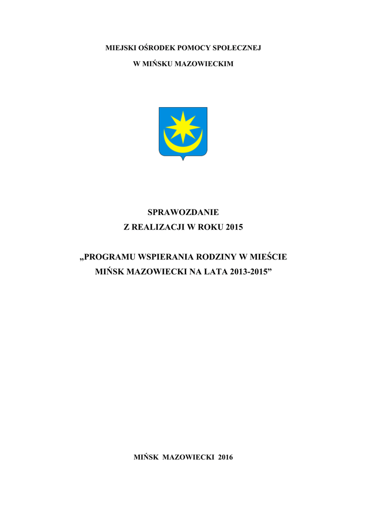 MIEJSKI OŚRODEK POMOCY SPOŁECZNEJ W MIŃSKU MAZOWIECKIM SPRAWOZDANIE Z REALIZACJI W ROKU 2015 „PROGRAMU WSPIERANIA RODZINY W MIEŚCIE MIŃSK MAZOWIECKI NA LATA 2013-2015” MIŃSK MAZOWIECKI 2016 Wstęp „Program Wspierania Rodziny w Mieście Mińsk Mazowiecki na lata 2013-2015” został ustanowiony uchwałą nr XXXI/308/13 Rady Miasta Mińsk Mazowiecki z dnia 24 czerwca 2013r. Jego koordynowaniem i monitorowaniem zajmuje się Miejski Ośrodek Pomocy Społecznej. Realizowane w ramach programu zadania koncentrowały się nie tylko na dziecku, ale na całej rodzinie również w sytuacjach, gdy dziecko zostało umieszczone poza rodziną biologiczną. Ma to na celu pomoc w odzyskaniu przez rodziców funkcji opiekuńczych i umożliwienie dziecku powrotu do środowiska rodzinnego. Wsparcie rodziny ma zatem charakter profilaktyczny i przyjmuje zasadę wczesnej interwencji. Priorytetem wspierania rodziny jest zapewnienie odpowiednich warunków rozwoju dzieci, młodzieży oraz kształtowanie wartości i norm związanych z ich wychowaniem. System wsparcia dzieci i rodzin przeżywających trudności w wypełnianiu funkcji opiekuńczowychowawczych, ma na celu przywrócenie im zdolności do wypełniania tych ról, poprzez pracę z rodziną oraz zapewnienie pomocy w opiece i wychowaniu dzieci. Natomiast praca z rodziną biologiczną w przypadku, gdy zaistniała konieczność umieszczenia dziecka w pieczy zastępczej, ma na celu jak najszybszy powrót dziecka do rodziny. Poniższe sprawozdanie zostało sporządzone na podstawie otrzymanych informacji z Urzędu Miasta, Miejskiej Komisji Rozwiązywania Problemów Alkoholowych, Powiatowego Centrum Pomocy Rodzinie, publicznych placówek przedszkolnych i oświatowych szczebla podstawowego i gimnazjalnego oraz na podstawie danych sprawozdawczych Miejskiego Ośrodka Pomocy Społecznej. REALIZACJA CELÓW „PROGRAMU WSPIERANIA RODZINY W MIEŚCIE MIŃSK MAZOWIECKI NA LATA 2013-2015” W ROKU 2015 1. Cel szczegółowy: WSPIERANIE RODZIN W WYCHOWANIU DZIECKA W RODZINIE BIOLOGICZNEJ 1.1. Udzielanie pomocy finansowej, materialnej i rzeczowej rodzinom żyjącym w trudnych warunkach materialnych. Przyznawanie i wypłacanie przewidzianych ustawą o pomocy społecznej świadczeń pieniężnych i w naturze jest jednym z głównych instrumentów wykorzystywanych w Miejskim Ośrodku Pomocy Społecznej na rzecz osób zagrożonych ubóstwem i marginalizacją społeczną. W roku 2015 pomocą społeczną objęto łącznie 871 rodzin z naszego miasta, w tym udzielono następujących form pomocy: 2 zasiłków stałych w 2015 r. otrzymało 137 osób w tym: 91 to osoby samotnie gospodarujące oraz 46 to osoby pozostające w rodzinie. Ogólna liczba udzielonych świadczeń tego typu wyniosła 1299, w tym 919 świadczeń wypłaconych zostało osobom samotnym i 380 wypłaconych osobom w rodzinie, zasiłków okresowych w 2015 roku wypłacono 64, z tej formy pomocy skorzystało 30 osób, z zasiłków celowych skorzystały 664 rodziny, stypendiów szkolnych wypłacono 226 uczniom mińskich szkół na łączną kwotę 155 685,69 zł, zakupiono 239 paczki świąteczne dla dzieci. W 2015 roku naliczono 4892 dodatki mieszkaniowe oraz 1212 dodatków energetycznych. Oprócz powyższych form pomocy rodziny otrzymują świadczenia rodzinne, które są przyznawane na podstawie ustawy z dnia 28 listopada 2003 r. o świadczeniach rodzinnych, są one przyznawane na okresy zasiłkowe, które trwają od 1 listopada do 31 października roku następnego. Świadczeniami rodzinnymi są: zasiłki rodzinny, których w 2015 roku naliczono 17 708, dodatki do zasiłku rodzinnego z tytułu: urodzenia dziecka - naliczono 100 dodatków, opieki nad dzieckiem w okresie korzystania z urlopu wychowawczego- naliczono 655 dodatków, samotnego wychowywania dziecka- naliczono 780 dodatków, kształcenia i rehabilitacji dziecka niepełnosprawnego – naliczono 887 dodatków, rozpoczęcia roku szkolnego- naliczono 1080 dodatków, podjęcia przez dziecko nauki poza miejscem zamieszkania - naliczono 141 dodatków, wychowywania dziecka w rodzinie wielodzietnej- naliczono 2517 dodatków, jednorazowa zapomoga z tytułu urodzenia dziecka- naliczono 368 zapomóg, świadczenie pielęgnacyjne - naliczono 1130 świadczeń, zasiłek dla opiekuna - naliczono 146 zasiłki, specjalny zasiłek opiekuńczy - naliczono 86 zasiłków, zasiłek pielęgnacyjny - naliczono 7448 zasiłków. 3 Ogółem w sprawach świadczeń rodzinnych wydano 1805 decyzji. Świadczenia z funduszu alimentacyjnego są przyznawane na okresy zasiłkowe, które rozpoczynają się 1 października i trwają do 30 września roku następnego. W 2015 roku naliczono 4324 świadczenia z funduszu alimentacyjnego na kwotę 1.686.984 zł., wydano 305 decyzji. 1.2. Organizacja i koordynacja dożywiania dzieci i młodzieży z terenu miasta. W roku 2015 liczba dożywianych dzieci wynosiła 488. Dzieci objęte tą formą pomocy zazwyczaj pochodziły z rodzin niepełnych bądź wielodzietnych, dotkniętych bezrobociem, długotrwałą chorobą lub niepełnosprawnością. Dożywianie dzieci odbywa się w ramach realizacji rządowego Programu „ Pomoc państwa w zakresie dożywiania” oraz Programu „Pomoc Miasta Mińsk Mazowiecki w zakresie dożywiania”. 1.3. Zapewnienie opieki asystenta rodzinom przeżywającym trudności w wypełnianiu funkcji opiekuńczo- wychowawczych. Miejski Ośrodek Pomocy Społecznej w Mińsku Mazowieckim w trosce o los rodzin z terenu miasta znajdujących się w najtrudniejszej sytuacji życiowej w roku 2015 realizował w ramach Resortowego (MPiPS) Programu Wspierania Rodziny i Systemu Pieczy Zastępczej program „Asystent Rodziny 2015”. Program w mieście realizowało dwóch asystentów pracujących łącznie z 26 rodzinami. W rodzinach, z którymi współpracowali asystenci rodziny pozostawało 67 dzieci. Głównymi zadaniami asystentów rodziny jest wspomaganie i towarzyszenie rodzinie przeżywającej trudności, co ma zapobiec odebraniu d