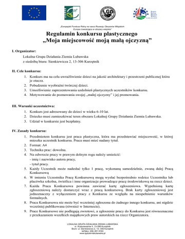 „Europejski Fundusz Rolny na rzecz Rozwoju Obszarów Wiejskich: Europa inwestująca w obszary wiejskie” Regulamin konkursu plastycznego „Moja miejscowość moją małą ojczyzną” I. Organizator: Lokalna Grupa Działania Ziemia Lubawska z siedzibą biura: Sienkiewicza 2, 13-306 Kurzętnik II. Cele konkursu: 1. Konkurs ma na celu uwrażliwienie dzieci na jakość architektury i przestrzeni publicznej która je otacza. 2. Pobudzenie wyobraźni twórczej dzieci. 3. Umożliwienie zaprezentowania uzdolnień plastycznych uczestników konkursu. 4. Motywowanie do poznawania swojej „małej ojczyzny” i jej promowania. III. Warunki uczestnictwa: 1. Konkurs jest adresowany do dzieci w wieku 6-10 lat. 2. Dziecko musi zamieszkiwać teren obszaru Lokalnej Grupy Działania Ziemia Lubawska. 3. Udział w konkursie jest bezpłatny. IV. Zasady konkursu: 1. Przedmiotem konkursu jest praca plastyczna, która ma przedstawiać miejscowość, w której mieszka uczestnik konkursu. Praca musi mieć nadany tytuł. 2. Format: A4 3. Technika prac: dowolna. 4. Na odwrocie pracy w prawym dolnym rogu należy umieścić: - imię i nazwisko autora pracy, - tytuł pracy. 5. Każdy Uczestnik może nadesłać tylko 1 pracę, wykonaną samodzielnie, zwaną dalej Pracą Konkursową 6. W imieniu Uczestnika Pracę Konkursową mogą wysłać bezpośrednio rodzice Uczestnika lub placówka szkolna, świetlica i inne organizacje prowadzące pracę środowiskową na rzecz dzieci. 7. Każda Praca Konkursowa powinna zawierać kartę zgłoszeniowa. Wypełnioną kartę zgłoszeniową należy dostarczyć wraz z pracą konkursową. Brak karty zgłoszeniowej jest jednoznaczny z wyłączeniem pracy z Konkursu ze względu na niespełnienie warunków formalnych. 8. Praca Konkursowa nie może być wcześniej zgłoszona do żadnego innego konkursu, ani nigdzie wcześniej publikowana (również w Internecie). 9. Prace Konkursowe nie podlegają zwrotowi, a zgłoszenie pracy do Konkursu jest równoznaczne z przekazaniem wszelkich majątkowych praw autorskich na rzecz Organizatora. LOKALNA GRUPA DZIAŁANIA ZIEMIA LUBAWSKA ul. Wybudowanie 4, 13-306 Kurzętnik Biuro: ul. Sienkiewicza 2, 13- 306 Kurzętnik tel/faks: (56) 491 8163 www.lgdziemialubawska.pl „Europejski Fundusz Rolny na rzecz Rozwoju Obszarów Wiejskich: Europa inwestująca w obszary wiejskie” 10. Nadesłane prace przechodzą na własność Organizatora. Organizator zastrzega sobie prawo do nieodpłatnego ich wykorzystania na następujących polach eksploatacji: druku w dowolnej liczbie publikacji i w dowolnym nakładzie, prezentowania prac w Internecie, w środkach masowego przekazu oraz w innych formach utrwaleń, nadających się do rozpowszechniania. 11. Pracę Konkursową należy dostarczyć osoboście, przesłać pocztą tradycyjną lub przesyłką kurierską (na koszt wysyłającego) w wyznaczonym terminie do 28 kwietnia 2017 r. (liczy się data stempla pocztowego) na adres biura: ul. Sienkiewicza 2, 13 -306 Kurzętnik 12. Oceny prac dokona Jury powołane przez organizatora. Decyzja jury jest ostateczna i nieodwołalna. 13. Dla zwycięzców przewidziane są nagrody, a dla wszystkich uczestników dyplomy. 14. Osoby biorące udział w konkursie wyrażają zgodę na przetwarzanie przez Organizatora Konkursu swoich danych osobowych (Ustawa o ochronie danych Osobowych z dnia 29 sierpnia 1997 roku, Dz. U. Nr 133, poz. 833, z późn. zm). LOKALNA GRUPA DZIAŁANIA ZIEMIA LUBAWSKA ul. Wybudowanie 4, 13-306 Kurzętnik Biuro: ul. Sienkiewicza 2, 13- 306 Kurzętnik tel/faks: (56) 491 8163 www.lgdziemialubawska.pl