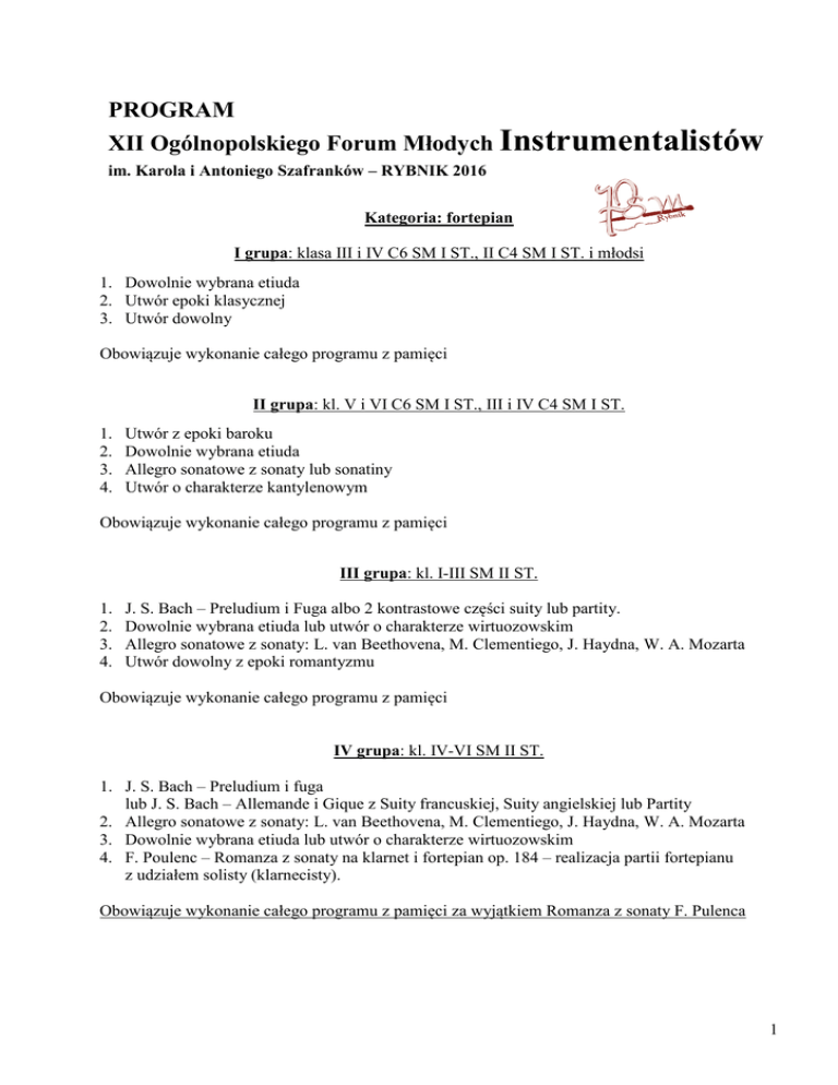 PROGRAM XII Ogólnopolskiego Forum Młodych Instrumentalistów im. Karola i Antoniego Szafranków – RYBNIK 2016 Kategoria: fortepian I grupa: klasa III i IV C6 SM I ST., II C4 SM I ST. i młodsi 1. Dowolnie wybrana etiuda 2. Utwór epoki klasycznej 3. Utwór dowolny Obowiązuje wykonanie całego programu z pamięci II grupa: kl. V i VI C6 SM I ST., III i IV C4 SM I ST. 1. 2. 3. 4. Utwór z epoki baroku Dowolnie wybrana etiuda Allegro sonatowe z sonaty lub sonatiny Utwór o charakterze kantylenowym Obowiązuje wykonanie całego programu z pamięci III grupa: kl. I-III SM II ST. 1. 2. 3. 4. J. S. Bach – Preludium i Fuga albo 2 kontrastowe części suity lub partity. Dowolnie wybrana etiuda lub utwór o charakterze wirtuozowskim Allegro sonatowe z sonaty: L. van Beethovena, M. Clementiego, J. Haydna, W. A. Mozarta Utwór dowolny z epoki romantyzmu Obowiązuje wykonanie całego programu z pamięci IV grupa: kl. IV-VI SM II ST. 1. J. S. Bach – Preludium i fuga lub J. S. Bach – Allemande i Gique z Suity francuskiej, Suity angielskiej lub Partity 2. Allegro sonatowe z sonaty: L. van Beethovena, M. Clementiego, J. Haydna, W. A. Mozarta 3. Dowolnie wybrana etiuda lub utwór o charakterze wirtuozowskim 4. F. Poulenc – Romanza z sonaty na klarnet i fortepian op. 184 – realizacja partii fortepianu z udziałem solisty (klarnecisty). Obowiązuje wykonanie całego programu z pamięci za wyjątkiem Romanza z sonaty F. Pulenca 1 PROGRAM XII Ogólnopolskiego Forum Młodych Instrumentalistów im. Karola i Antoniego Szafranków – RYBNIK 2016 Kategoria: skrzypce I grupa: klasa III i IV C6 SM I ST., II C4 SM I ST. i młodsi 1. Etiuda 2. Miniatura kompozytora polskiego 3. Koncert część I lub III lub utwór o charakterze wirtuozowskim Obowiązuje wykonanie całego programu z pamięci. II grupa: kl. V i VI C6 SM I ST., III i IV C4 SM I ST. 1. Etiuda 2. Miniatura kompozytora polskiego 3. Koncert część I lub III lub utwór o charakterze wirtuozowskim Obowiązuje wykonanie całego programu z pamięci. III grupa: kl. I-III SM II ST. 1. Etiuda lub kaprys 2. Dwie kontrastujące części ze zbioru 12 Fantazji na skrzypce solo G. Ph. Telemanna (zaleca się korzystanie z wydawnictwa Bärenreiter Kassel) 3. Miniatura kompozytora polskiego 4. Koncert część I lub III lub utwór o charakterze wirtuozowskim Obowiązuje wykonanie całego programu z pamięci. IV grupa: kl. IV-VI SM II ST. 1. 2. 3. 4. Etiuda lub kaprys Dwie kontrastujące części ze zbioru Sonaty i partity na skrzypce solo J. S. Bacha Miniatura kompozytora polskiego Koncert część I lub III lub utwór o charakterze wirtuozowskim Obowiązuje wykonanie całego programu z pamięci. 2 PROGRAM XII Ogólnopolskiego Forum Młodych Instrumentalistów im. Karola i Antoniego Szafranków – RYBNIK 2016 Kategoria: zespoły kameralne SZKOŁA MUZYCZNA I STOPNIA: 1. Program dowolny, zróżnicowany stylistycznie – utwory oryginalne lub transkrypcje (z podaniem autora opracowania) z wyłączeniem koncertów oraz utworów wykonywanych unisono. 2. Czas trwania programu: 7 – 15 minut. SZKOŁA MUZYCZNA II STOPNIA: 1. Program dowolny – utwory oryginalne lub transkrypcje (z podaniem autora opracowania) z wyłączeniem koncertów. 2. Czas trwania programu: 15 – 20 minut. 3