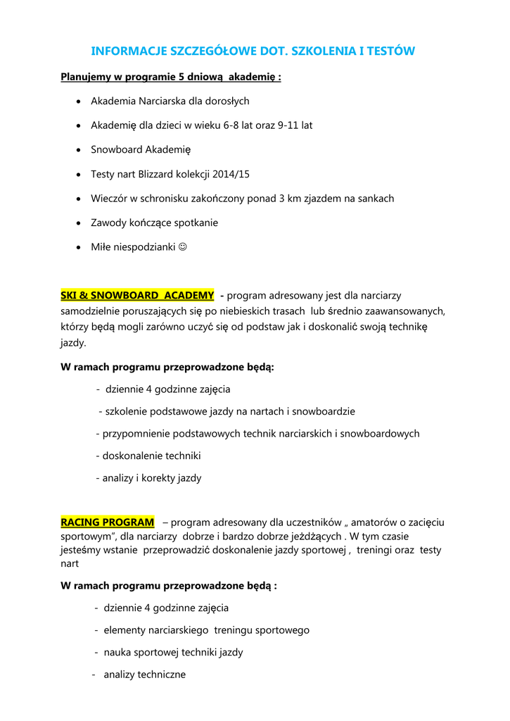 INFORMACJE SZCZEGÓŁOWE DOT. SZKOLENIA I TESTÓW Planujemy w programie 5 dniową akademię : Akademia Narciarska dla dorosłych Akademię dla dzieci w wieku 6-8 lat oraz 9-11 lat Snowboard Akademię Testy nart Blizzard kolekcji 2014/15 Wieczór w schronisku zakończony ponad 3 km zjazdem na sankach Zawody kończące spotkanie Miłe niespodzianki SKI & SNOWBOARD ACADEMY - program adresowany jest dla narciarzy samodzielnie poruszających się po niebieskich trasach lub średnio zaawansowanych, którzy będą mogli zarówno uczyć się od podstaw jak i doskonalić swoją technikę jazdy. W ramach programu przeprowadzone będą: - dziennie 4 godzinne zajęcia - szkolenie podstawowe jazdy na nartach i snowboardzie - przypomnienie podstawowych technik narciarskich i snowboardowych - doskonalenie techniki - analizy i korekty jazdy RACING PROGRAM – program adresowany dla uczestników „ amatorów o zacięciu sportowym”, dla narciarzy dobrze i bardzo dobrze jeżdżących . W tym czasie jesteśmy wstanie przeprowadzić doskonalenie jazdy sportowej , treningi oraz testy nart W ramach programu przeprowadzone będą : - dziennie 4 godzinne zajęcia - elementy narciarskiego treningu sportowego - nauka sportowej techniki jazdy - analizy techniczne SKI TEST To niepowtarzalna przygoda dla amatorów narciarstwa alpejskiego . Program Testu obejmuje zapoznanie narciarzy z nowościami sprzętowymi Firmy Blizzard kolekcje nart 2013 / 14 oraz super nowości na nadchodzący sezon 2014/15 . Test daje możliwość sprawdzenia kilku par nart w ciągu jednego dnia jazdy . Trenerzy prowadzący test to praktycy - zawodnicy posiadający ogromną wiedzę oraz doświadczenie praktyczne i teoretyczne, demonstrujący każdą technikę . Dużą atrakcją jest możliwość testowania nart, które będą dostępne w sprzedaży w następnym sezonie zimowym. PROGRAM PROWADZONY BĘDZIE PRZEZ ZESPÓŁ TRENERSKI APS: Nasz zespół trenerów i konsultantów to doświadczeni specjaliści : Instruktor Zawodowego Związku Narciarskiego Landu Salzburg & ISIA Dyplomowani Trenerzy I i II kl. Sportowej – Uprawnienia Państwowe AWF Zawodowi instruktorzy ISIA Instruktorzy PZN Zawodnicy PZN , PZS Byli zawodnicy startujący Pucharach Świata , Europy , Polski Byli i aktualni reprezentanci polski w Snowboardowego Pucharu Świata, Europy i Polski Doświadczeni nauczyciele narciarstwa Potencjał i umiejętności APS SKI RACING TEAM gwarantuje kompleksową usługę na najwyższym możliwym poziomie . Licencjonowana Szkoła Narciarska PZN www.sitn.pl DANE KONTAKTOWE DO ZGŁOSZENIA UDZIAŁU W SZKOLENIU E-MAIL : [email protected] TEL.KOM. 509 297 436 TEL.KOM. 509 297 900