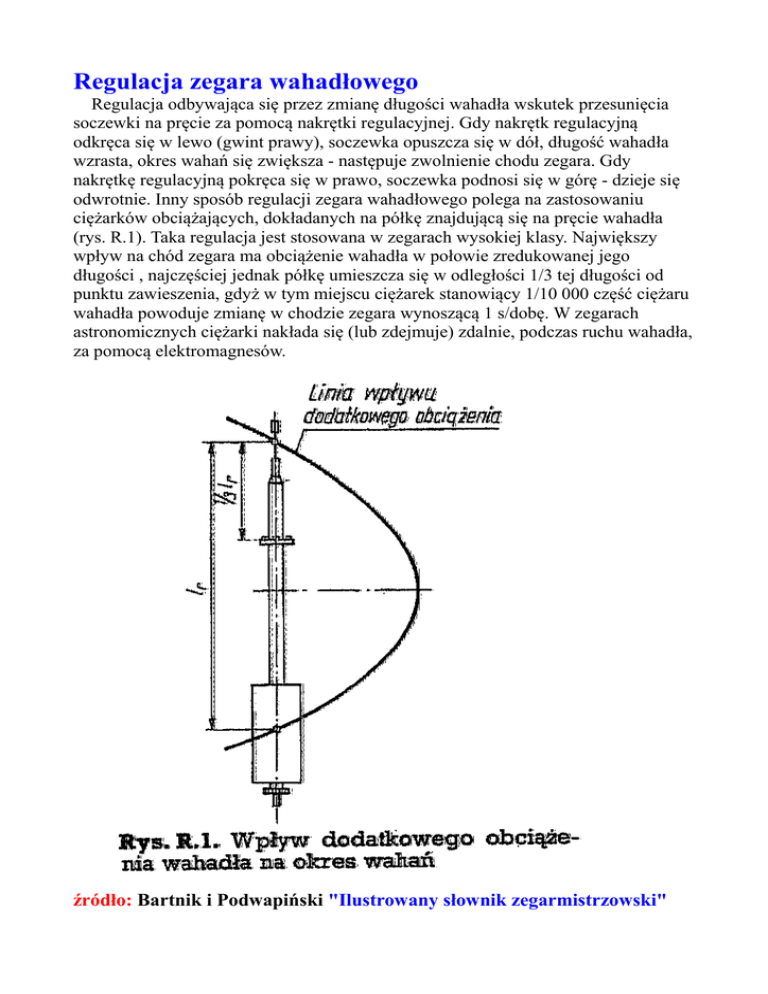 Regulacja zegara wahadłowego Regulacja odbywająca się przez zmianę długości wahadła wskutek przesunięcia soczewki na pręcie za pomocą nakrętki regulacyjnej. Gdy nakrętk regulacyjną odkręca się w lewo (gwint prawy), soczewka opuszcza się w dół, długość wahadła wzrasta, okres wahań się zwiększa - następuje zwolnienie chodu zegara. Gdy nakrętkę regulacyjną pokręca się w prawo, soczewka podnosi się w górę - dzieje się odwrotnie. Inny sposób regulacji zegara wahadłowego polega na zastosowaniu ciężarków obciążających, dokładanych na półkę znajdującą się na pręcie wahadła (rys. R.1). Taka regulacja jest stosowana w zegarach wysokiej klasy. Największy wpływ na chód zegara ma obciążenie wahadła w połowie zredukowanej jego długości , najczęściej jednak półkę umieszcza się w odległości 1/3 tej długości od punktu zawieszenia, gdyż w tym miejscu ciężarek stanowiący 1/10 000 część ciężaru wahadła powoduje zmianę w chodzie zegara wynoszącą 1 s/dobę. W zegarach astronomicznych ciężarki nakłada się (lub zdejmuje) zdalnie, podczas ruchu wahadła, za pomocą elektromagnesów. źródło: Bartnik i Podwapiński "Ilustrowany słownik zegarmistrzowski"