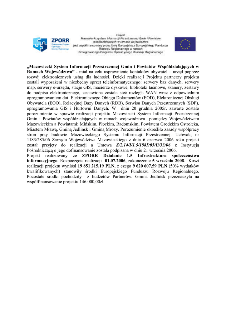 „Mazowiecki System Informacji Przestrzennej Gmin i Powiatów Współdziałających w Ramach Województwa” - miał na celu usprawnienie kontaktów obywatel – urząd poprzez rozwój elektronicznych usług dla ludności. Dzięki realizacji Projektu partnerzy projektu zostali wyposażeni w niezbędny sprzęt teleinformatycznego: serwery baz danych, serwery map, serwery e-urzędu, stacje GIS, macierze dyskowe, biblioteki taśmowe, skanery, zestawy do podpisu elektronicznego, zestawiona została sieć rozległa WAN wraz z odpowiednim oprogramowaniem dot. Elektronicznego Obiegu Dokumentów (EOD), Elektronicznej Obsługi Obywatela (EOO), Relacyjnej Bazy Danych (RDB), Serwisu Danych Przestrzennych (SDP), oprogramowania GIS i Hurtowni Danych. W dniu 20 grudnia 2005r. zawarte zostało porozumienie w sprawie realizacji projektu Mazowiecki System Informacji Przestrzennej Gmin i Powiatów współdziałających w ramach województwa pomiędzy Województwem Mazowieckim a Powiatami: Mińskim, Płockim, Radomskim, Powiatem Grodzkim Ostrołęka, Miastem Mławą, Gminą Jedlińsk i Gminą Mrozy. Porozumienie określiło zasady współpracy stron przy budowie Mazowieckiego Systemu Informacji Przestrzennej. Uchwałą nr 1183/285/06 Zarządu Województwa Mazowieckiego z dnia 6 czerwca 2006 roku projekt został przyjęty do realizacji a Umowa Z/2.14/I/1.5/1885/05/U/33/06 z Instytucją Pośredniczącą o jego dofinansowanie została podpisana w dniu 21 września 2006. Projekt realizowany ze ZPORR Działanie 1.5 Infrastruktura społeczeństwa informacyjnego. Rozpoczęcie realizacji 01.07.2006, zakończenie 5 września 2008. Koszt realizacji projektu wyniósł 19 851 215,19 PLN, z czego 9 620 607,59 PLN (50% wydatków kwalifikowanych) stanowiły środki Europejskiego Funduszu Rozwoju Regionalnego. Pozostałe środki pochodziły z budżetów Partnerów. Gmina Jedlińsk przeznaczyła na współfinansowanie projektu 146.000,00zł.