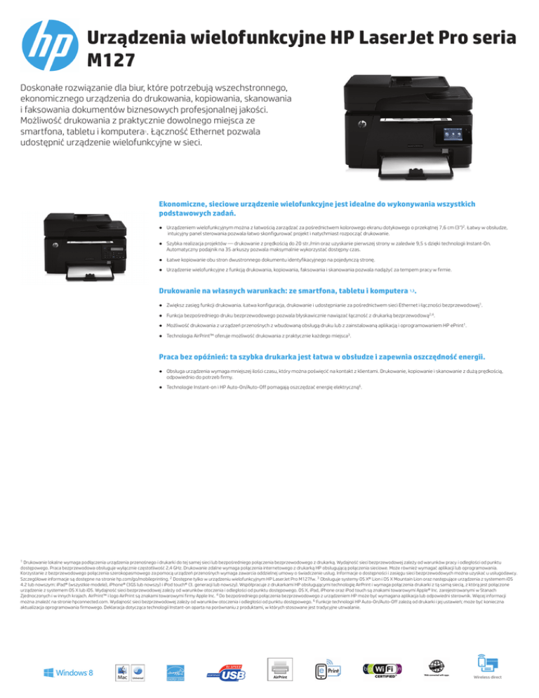 Urządzenia wielofunkcyjne HP LaserJet Pro seria M127 Doskonałe rozwiązanie dla biur, które potrzebują wszechstronnego, ekonomicznego urządzenia do drukowania, kopiowania, skanowania i faksowania dokumentów biznesowych profesjonalnej jakości. Możliwość drukowania z praktycznie dowolnego miejsca ze smartfona, tabletu i komputera . Łączność Ethernet pozwala udostępnić urządzenie wielofunkcyjne w sieci. 1 Ekonomiczne, sieciowe urządzenie wielofunkcyjne jest idealne do wykonywania wszystkich podstawowych zadań. ● Urządzeniem wielofunkcyjnym można z łatwością zarządzać za pośrednictwem kolorowego ekranu dotykowego o przekątnej 7,6 cm (3")2. Łatwy w obsłudze, intuicyjny panel sterowania pozwala łatwo skonfigurować projekt i natychmiast rozpocząć drukowanie. ● Szybka realizacja projektów — drukowanie z prędkością do 20 str./min oraz uzyskanie pierwszej strony w zaledwie 9,5 s dzięki technologii Instant-On. Automatyczny podajnik na 35 arkuszy pozwala maksymalnie wykorzystać dostępny czas. ● Łatwe kopiowanie obu stron dwustronnego dokumentu identyfikacyjnego na pojedynczą stronę. ● Urządzenie wielofunkcyjne z funkcją drukowania, kopiowania, faksowania i skanowania pozwala nadążyć za tempem pracy w firmie. Drukowanie na własnych warunkach: ze smartfona, tabletu i komputera 1,3. ● Zwiększ zasięg funkcji drukowania. Łatwa konfiguracja, drukowanie i udostępnianie za pośrednictwem sieci Ethernet i łączności bezprzewodowej1. ● Funkcja bezpośredniego druku bezprzewodowego pozwala błyskawicznie nawiązać łączność z drukarką bezprzewodową2,4. ● Możliwość drukowania z urządzeń przenośnych z wbudowaną obsługą druku lub z zainstalowaną aplikacją i oprogramowaniem HP ePrint1. ● Technologia AirPrint™ oferuje możliwość drukowania z praktycznie każdego miejsca3. Praca bez opóźnień: ta szybka drukarka jest łatwa w obsłudze i zapewnia oszczędność energii. ● Obsługa urządzenia wymaga mniejszej ilości czasu, który można poświęcić na kontakt z klientami. Drukowanie, kopiowanie i skanowanie z dużą prędkością, odpowiednio do potrzeb firmy. ● Technologie Instant-on i HP Auto-On/Auto-Off pomagają oszczędzać energię elektryczną6. 1 Drukowanie lokalne wymaga podłączenia urządzenia przenośnego i drukarki do tej samej sieci lub bezpośredniego połączenia bezprzewodowego z drukarką. Wydajność sieci bezprzewodowej zależy od warunków pracy i odległości od punktu dostępowego. Praca bezprzewodowa obsługuje wyłącznie częstotliwość 2,4 GHz. Drukowanie zdalne wymaga połączenia internetowego z drukarką HP obsługującą połączenia sieciowe. Może również wymagać aplikacji lub oprogramowania. Korzystanie z bezprzewodowego połączenia szerokopasmowego za pomocą urządzeń przenośnych wymaga zawarcia oddzielnej umowy o świadczenie usług. Informacje o dostępności i zasięgu sieci bezprzewodowych można uzyskać u usługodawcy. Szczegółowe informacje są dostępne na stronie hp.com/go/mobileprinting. 2 Dostępne tylko w urządzeniu wielofunkcyjnym HP LaserJet Pro M127fw. 3 Obsługuje systemy OS X® Lion i OS X Mountain Lion oraz następujące urządzenia z systemem iOS 4.2 lub nowszym: iPad® (wszystkie modele), iPhone® (3GS lub nowszy) i iPod touch® (3. generacji lub nowszy). Współpracuje z drukarkami HP obsługującymi technologię AirPrint i wymaga połączenia drukarki z tą samą siecią, z którą jest połączone urządzenie z systemem OS X lub iOS. Wydajność sieci bezprzewodowej zależy od warunków otoczenia i odległości od punktu dostępowego. OS X, iPad, iPhone oraz iPod touch są znakami towarowymi Apple® Inc. zarejestrowanymi w Stanach Zjednoczonych i w innych krajach. AirPrint™ i logo AirPrint są znakami towarowymi firmy Apple Inc. 4 Do bezpośredniego połączenia bezprzewodowego z urządzeniem HP może być wymagana aplikacja lub odpowiedni sterownik. Więcej informacji można znaleźć na stronie hpconnected.com. Wydajność sieci bezprzewodowej zależy od warunków otoczenia i odległości od punktu dostępowego. 6 Funkcje technologii HP Auto-On/Auto-Off zależą od drukarki i jej ustawień; może być konieczna aktualizacja oprogramowania firmowego. Deklaracja dotycząca technologii Instant-on oparta na porównaniu z produktami, w których stosowane jest tradycyjne utrwalanie. Urządzenia wielofunkcyjne HP LaserJet Pro seria M127 DANE TECHNICZNE Funkcje Drukowanie, kopiowanie, skanowanie, faksowanie Technologia druku Druk laserowy Standardowe języki drukarki PCLm/PCLmS Prędkość druku A4 w czerni: Do 20 str./min; Pierwsza strona, czerń: W ciągu zaledwie 9,5 s Opcje wydruku z dupleksem Ręczny (z obsługą przez sterownik) Rozdzielczość druku W czerni (best): Do 600 x 600 dpi; Rozdzielczość technologii druku FastRes 600; FastRes 1200 Obciążalność Miesięcznie, A4: Do 8000 stron Zalecana ilość stron drukowanych miesięcznie Od 250 do 2000 Pojemność automatycznego podajnika dokumentów Standardowo 35 arkuszy Prędkość kopiowania Czarny (A4): Do 20 kopii/min Rozdzielczość kopiowania Maksymalna liczba kopii Zawartość opakowania CZ181A: Urządzenie wielofunkcyjne HP LaserJet Pro M127fn; Zainstalowany fabrycznie startowy Panel sterowania M127fn: 2-wierszowy wyświetlacz LCD; Przyciski (strzałki w górę i w dół, OK, Cancel (Anuluj), Back Czarny (tekst i grafika): Do 600 x 600 dpi Akcesoria CF283A HP 83A oryginalny wkład z czarnym tonerem LaserJet Do 99 kopii Materiały eksploatacyjne CF283A HP 83A oryginalny wkład z czarnym tonerem LaserJet1500 stron Skala zmiany rozmiarów w kopiarce 25 do 400% Dołączone oprogramowanie Ustawienia kopiarki Liczba kopii; Przyciemnianie/rozjaśnianie; Zmniejszanie/powiększanie; Optymalizacja (szkic, tekst, tryb mieszany, obraz); Format papieru, układanie kopii Inteligentne cechy oprogramowania kopiarki Do 99 kopii; Zmniejszanie/powiększanie od 25 do 400%; Kontrast (jaśniej/ciemniej); 