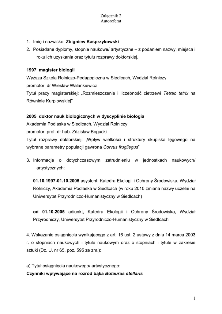 Załącznik 2 Autoreferat 1. Imię i nazwisko: Zbigniew Kasprzykowski 2. Posiadane dyplomy, stopnie naukowe/ artystyczne – z podaniem nazwy, miejsca i roku ich uzyskania oraz tytułu rozprawy doktorskiej. 1997 magister biologii Wyższa Szkoła Rolniczo-Pedagogiczna w Siedlcach, Wydział Rolniczy promotor: dr Wiesław Walankiewicz Tytuł pracy magisterskiej: „Rozmieszczenie i liczebność cietrzewi Tetrao tetrix na Równinie Kurpiowskiej” 2005 doktor nauk biologicznych w dyscyplinie biologia Akademia Podlaska w Siedlcach, Wydział Rolniczy promotor: prof. dr hab. Zdzisław Bogucki Tytuł rozprawy doktorskiej: „Wpływ wielkości i struktury skupiska lęgowego na wybrane parametry populacji gawrona Corvus frugilegus” 3. Informacje o dotychczasowym zatrudnieniu w jednostkach naukowych/ artystycznych: 01.10.1997-01.10.2005 asystent, Katedra Ekologii i Ochrony Środowiska, Wydział Rolniczy, Akademia Podlaska w Siedlcach (w roku 2010 zmiana nazwy uczelni na Uniwersytet Przyrodniczo-Humanistyczny w Siedlcach) od 01.10.2005 adiunkt, Katedra Ekologii i Ochrony Środowiska, Wydział Przyrodniczy, Uniwersytet Przyrodniczo-Humanistyczny w Siedlcach 4. Wskazanie osiągnięcia wynikającego z art. 16 ust. 2 ustawy z dnia 14 marca 2003 r. o stopniach naukowych i tytule naukowym oraz o stopniach i tytule w zakresie sztuki (Dz. U. nr 65, poz. 595 ze zm.): a) Tytuł osiągnięcia naukowego/ artystycznego: Czynniki wpływające na rozród bąka Botaurus stellaris 1 Załącznik 2 Autoreferat Na osiągnięcie składa się cykl sześciu artykułów naukowych, których sumaryczny IF wynosi 6,920, a suma punktów MNiSW – 155. b) (autor/ autorzy, tytuł/ tytuły publikacji, rok wydania, nazwa wydawnictwa) (IF według roku publikacji, dla publikacji z 2014 przyjęto IF z 2013 roku, punktacja czasopism naukowych MNiSW z dnia 17.12.2013) 1. Polak M., Kasprzykowski Z., Kucharczyk M. Micro-habitat nest preferences of the great bittern, Botaurus stellaris, on fishponds in central-eastern Poland. 2008. Annales Zoologici Fennici 45:102-108. IF: 1,210/ pkt. MNiSW: 25 Udział w badaniach i współautorstwo: brałem współudział w zbieraniu materiału, opracowaniu wyników oraz pisaniu artykułu, co stanowi według mnie 40% wkładu. 2. Polak M., Kasprzykowski Z. Reproduction parameters of the Great Bittern Botaurus stellaris in the fish ponds of eastern Poland. 2010. Acta Ornithologica 45: 75-81. IF: 0,889/ pkt. MNiSW: 30 Udział w badaniach i współautorstwo: brałem współudział w zbieraniu materiału, opracowaniu wyników oraz pisaniu artykułu, co stanowi według mnie 50% wkładu. 3. Kasprzykowski Z., Polak M. Habitat quality and breeding parameters in relation to female mating status in the polygynous Eurasian Bittern Botaurus stellaris. 2013. Journal of Ornithology 154: 403–409. IF: 1,927/ pkt. MNiSW: 40 Udział w badaniach i współautorstwo: brałem współudział w zbieraniu materiału, opracowaniu wyników oraz pisaniu artykułu, co stanowi według mnie 70% wkładu. 2 Załącznik 2 Autoreferat 4. Polak M., Kasprzykowski Z. The effect of weather conditions on the breeding biology of the Eurasian Bittern Botaurus stellaris in eastern Poland. 2013. Ethology Ecology & Evolution 25: 243-252. IF 1,150/ pkt. MNiSW: 20 Udział w badaniach i współautorstwo: brałem współudział w zbieraniu materiału, opracowaniu wyników oraz pisaniu artykułu, co stanowi według mnie 40% wkładu. 5. Kasprzykowski Z., Polak M., Chylarecki P. Effects of weather conditions, time of breeding, brood size and hatching order on Eurasian Bittern nestling growth in a food-rich fishpond habitat. 2014. Annales Zoologici Fennici 51: 477-487. IF: 1,030 z 2013/ pkt. MNiSW: 25 Udział w badaniach i współautorstwo: brałem współudział w zbieraniu materiału, opracowaniu wyników oraz pisaniu artykułu, co stanowi według mnie 70% wkładu. 6. Kasprzykowski Z., Polak M. Environmental variables predict timing of breeding in the polygynous Eurasian bittern Botaurus stellaris. 2014. Folia Zoologica 63: 188-193. IF 0,714 z 2013/ pkt. MNiSW: 15 Udział w badaniach i współautorstwo: brałem współudział w zbieraniu materiału, opracowaniu wyników oraz pisaniu artykułu, co stanowi według mnie 70% wkładu. c) Omówienie celu naukowego ww. prac i osiągniętych wyników wraz z omówieniem ich ewentualnego wykorzystania. Bąk Botaurus stellaris, w odróżnieniu do innych przedstawicieli czaplowatych Ardeidae, cechuje się poligynicznym systemem kojarzenia. W terytorium jednego samca może funkcjonować kilka lęgów, lecz nie uczestniczy on z reguły w opiece nad potomstwem. Samce wykazują zachowania terytorialne i zwabiają samice charakterystycznym głosem godowym. Rozmieszczenie samic związane jest głównie z zasobnością środowiska oraz odpowiednimi miejscami do założenia gniazda. 3 Załącznik 2 Autoreferat Omawiany gatunek zasiedla szerokie spektrum środowisk wodnych. Preferuje szuwary trzcinowe Phragmites autralis, choć lęgi często znajdowane są w szuwarach pałkowych Typha langustifolia i turzycach Carex sp.. Wyjątkowo wysiadujące samice stwierdzano również na polach ryżowych, zaroślach wierzbowych, a nawet w uprawach jęczmienia. Ważnym komponentem siedliskowym dla tego gatunku jest gęsta roślinność, tworząca miejsce lęgowe, a także odpowiedni poziom wody, stanowiący barierę dla drapieżników i zapewniający miejsce zdobywania pokarmu. Zasobne żerowisko pełni ważną rolę zwłaszcza w pierwszym okresie karmienia piskląt, gdy samica musi ogrzewać pisklęta. Pokarm zdobywany jest wtedy bezpośrednio w pobliżu gniazda. Skryty tryb życia oraz ograniczone występowanie w Europie były przyczyną słabego poznania biologii tego gatunku. Większość badań wykonywanych dotyczyła niewielkich i zmniejszających swą liczebność populacji. Podstawowe dane o preferencjach siedliskowych samców, wybiórczości gniazdowania i parametrów lęgowych pochodziły przede wszystkim z izolowanych stano