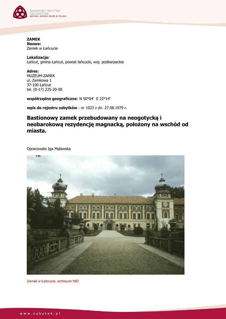 ZAMEK Nazwa: Zamek w Łańcucie Lokalizacja: Łańcut, gmina Łańcut, powiat łańcucki, woj. podkarpackie Adres: MUZEUM-ZAMEK ul. Zamkowa 1 37-100 Łańcut tel. (0-17) 225-20-08 współrzędne geograficzne: N 50°04' E 22°14' wpis do rejestru zabytków : nr 1023 z dn. 27.08.1979 r. Bastionowy zamek przebudowany na neogotycką i neobarokową rezydencję magnacką, położony na wschód od miasta. Opracowała Iga Malawska Zamek w Łańcucie, archiwum NID Historia Łańcuta sięga wczesnego średniowiecza. Na wzgórzu, do dziś zwanym Łysą Górą istniała w początkach XIV wieku osada. Król Kazimierz Wielki, który w latach 1340-1349 zajął ziemię przemyską, nadał Łysą Górę wojewodzie sandomierskiemu i staroście ruskiemu Ottonowi z Pilczy (ur. ok. 1340 – zm. 1384). Pozostałości tej pierwszej warowni, datowanej na XIV i XV wiek, nie zachowały się. Obok obronnej budowli król Kazimierz Wielki lokował w 1349 r. miasto. Rodzina Pileckich bardzo urosła na znaczeniu za czasów panowania Władysława Jagiełły. Żona Ottona – Jadwiga Melsztyńska była matką chrzestną króla, a ich jedyna córka – Elżbieta z Pilczy Granowska herbu Topór została w 1417 roku trzecią żoną Władysława Jagiełły i była koronowana na królową Polski. Źródła podają, że Pileccy gościli w swojej siedzibie króla Zygmunta Starego i cesarza Zygmunta Luksemburczyka. Tu także odbyło się spotkanie króla Władysława Jagiełły z księciem litewskim Witoldem. Ostatnim właścicielem Łańcuta z rodu Pileckich był Krzysztof (1568-1586). Po jego śmierci Łańcut przeszedł na własność Stadnickich herbu Szreniawa i w rękach tej rodziny pozostał do 1628 roku. W końcu XVI lub na początku XVII wieku przeniesiono siedzibę na tereny obecnego zamku. Fundatorem nowego założenia był Krzysztof Pilecki albo Stanisław Stadnicki zwany „Diabłem Łańcuckim”. Stanisław niedoceniany za męstwo i czyny wojenne (wyprawy na Gdańsk, Moskwę i Węgry) zaczął występować przeciwko królowi i sejmowi. Ignorował wyroki sądowe, napadał na sąsiednie siedziby. Toczył prywatna wojnę ze starostą leżajskim Łukaszem Opalińskim. W 1608 roku wojska starosty zrównały z ziemią siedzibę Pileckich i Stadnickich. W tym samym roku miasto przeżyło najazd Tatarów. Jest niewykluczone, że wtedy właśnie podjęto decyzję o budowie nowej warowni. Po śmierci Stanisława Stadnickiego w roku 1610 dobra łańcuckie odziedziczyli jego dwaj synowie: Władysław i Stanisław. W pierwszym etapie budowy nowego fortalicjum powstała czworoboczna wieża obronna o wymiarach 8 x 8,5 metra. Następnie Stadniccy dostawili do wieży budynek na planie prostokąta o wymiarach 15 x 24 metry. W latach 1610-1620 powstało murowane założenie w kształcie zbliżonym do podkowy, zamknięte od południa murem i przejazdem bramnym. Na narożach budowli pobudowano cztery niewielkie pięcioboczne baszty alkierzowe a całość prawdopodobnie otoczono ziemno-drewnianymi fortyfikacjami. W 1628 roku nowym właścicielem zamku i miasta został Stanisław Lubomirski (1583-1649), wojewoda krakowski. W mieście wprowadził przepisy pozwalające na szybki rozwój rzemiosła, poprawił obwarowania miejskie. I chociaż jego główną siedzibą był Wiśnicz, to całkowicie przebudował dotychczasowy zamek Stadnickich. W latach 1629-1641 powstało nowoczesne założenie typu „palazzo in fortezza. Pięcioboczne, na planie gwiazdy, ziemno-murowane fortyfikacje bastionowe i głębokie suche fosy otaczały znajdującą się wewnątrz rezydencję. Przeniesiono wjazd do rezydencji na stronę zachodnią (uprzednio brama wjazdowa znajdowała się od południa). Nowy wjazd do zamku prowadził przez zwodzony most i ufortyfikowaną bramę. Zamek pozbawiono cech obronnych i przekształcono we wczesnobarokową rezydencję. Składał się z czterech skrzydeł. Dawne pięcioboczne alkierze przekształcono na narożne baszty, które otrzymały okna w miejsce strzelnic. Wnętrza urządzono zgodnie z duchem epoki. Zamek w Łańcucie zaprojektował nadworny architekt Stanisława Lubomirskiego – Maciej Trapola. Projektował on również zamek w Połonnem, budowle w Wiśniczu (ratusz, kościoły, przebudowa zamku ). Łańcuckie fortyfikacje są autorstwa Krzysztofa Mieroszewskiego - inżyniera i sekretarza królewskiego, fortyfikatora Jasnej Góry, Krakowa, autora dzieła Architectura militaria. W wyniku podziału dóbr rodowych w 1642 roku dobra łańcuckie otrzymał od ojca Jerzy Sebastian Lubomirski (1616 – 1667), późniejszy marszałek wielki koronny (od 1649 roku). Podczas potopu szwedzkiego zniszczone zostało miasto, natomiast sam zamek nie ucierpiał. Być może nowoczesne fortyfikacje wzniesione przez Mieroszewskiego spowodowały, że w 1655 roku generał Douglas prowadzący wojska szwedzkie wycofał się spod zamku. Zamek w Łańcucie był jednym z nielicznych zamków w Polsce, które nie zostały zdobyte przez Szwedów. Jerzy Sebastian zawiązał konfederację, której celem było stworzenie armii do walki ze Szwedami. Z tego też powodu w Łańcucie gościł król Jan Kazimierz, który przybył tu ze Śląska. W 1657 roku łańcuckie fortyfikacje okazały się za mocne także dla szwedzkich sojuszniczych wojsk księcia Siedmiogrodu - Jerzego II Rakoczego. Po pożarze zamku w 1688 roku przeprowadzono remont i przebudowę. Pracami kierował niderlandzki architekt Lubomirskich Tylman z Gameren. Jego dziełem są barokowe hełmy na basztach ujmujących elewację frontową. Unowocześniono fortyfikacje tworząc m.in. nowe stanowiska dla strzelców. Właścicielem zamku był wtedy Stanisław Herakliusz Lubomirski (1642-1702), mecenas sztuki i poeta. Ostatnim z rodu Lubomirskich właścicielem Łańcuta był Stanisław, marszałek wielki koronny. Władał zamkiem od 1745 roku do swojej śmierci w roku 1783. Żoną Stanisława była Elżbieta Izabela z Czartoryskich, córka Augusta Aleksandra Czartoryskiego i Marii Zofii Sienia
