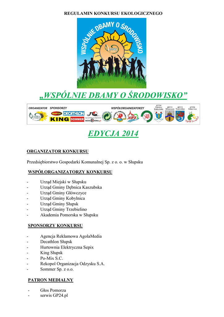 REGULAMIN KONKURSU EKOLOGICZNEGO „WSPÓLNIE DBAMY O ŚRODOWISKO” EDYCJA 2014 ORGANIZATOR KONKURSU Przedsiębiorstwo Gospodarki Komunalnej Sp. z o. o. w Słupsku WSPÓŁORGANIZATORZY KONKURSU - Urząd Miejski w Słupsku Urząd Gminy Dębnica Kaszubska Urząd Gminy Główczyce Urząd Gminy Kobylnica Urząd Gminy Słupsk Urząd Gminy Trzebielino Akademia Pomorska w Słupsku SPONSORZY KONKURSU - Agencja Reklamowa AgolaMedia Decathlon Słupsk Hurtownia Elektryczna Sepix King Słupsk Po-Mix S.C. Rekopol Organizacja Odzysku S.A. Sommer Sp. z o.o. PATRON MEDIALNY - Głos Pomorza serwis GP24.pl CELE KONKURSU 1. Podnoszenie świadomości ekologicznej oraz kształtowanie właściwych postaw związanych z ochroną środowiska. 2. Promocja nowych rozwiązań w gospodarce odpadami. 3. Zrozumienie konieczności ochrony środowiska w miejscu zamieszkania. 4. Dostrzeganie zależności pomiędzy człowiekiem, a otaczającym go środowiskiem. 5. Odkrywanie własnych zdolności i możliwości twórczych. TEMATYKA KONKURSU 1. Główne hasło konkursu brzmi : „WSPÓLNIE DBAMY O ŚRODOWISKO”. 2. Prace powinny zawierać treści ekologiczne ukazujące prawidłowe postawy wobec środowiska przyrodniczego, np.: segregację odpadów, recykling, wpływ ekologii na zdrowie człowieka, ekologiczny krajobraz, piękno przyrody, efekty zmian w systemie gospodarki odpadami, pracę służb PGK na rzecz utrzymania czystości i unieszkodliwiania odpadów. ZASADY KONKURSU 1. Konkurs adresowany jest do młodzieży szkolnej z terenu miasta Słupska oraz gmin: Dębnica Kaszubska, Główczyce, Kobylnica, Słupsk i Trzebielino, w wieku od 10 do 19 lat (uczniowie klas IV-VI szkół podstawowych, gimnazjów oraz szkół ponadgimnazjalnych). 2. Konkurs przeprowadzony będzie w dwóch etapach: 1) Etap I - na szczeblu gminnym. 2) Etap II - na szczeblu regionalnym. 3. Najlepsze prace w Etapie I, wyłonione przez powołane przez gminy komisje konkursowe, wezmą udział w Etapie II, którego rozstrzygnięcie odbędzie się w siedzibie PGK Sp. z o.o. w Słupsku. KATEGORIE KONKURSOWE 1. Kategoria plastyczna: plakat użyj haseł ekologicznych zachęcających do ochrony środowiska przyrodniczego, - technika wykonania dowolna, - format plakatu A4 lub A3 2. Kategoria techniczna eko-rzecz - wykorzystaj rzeczy niepotrzebne, nieużyteczne (odpady) do stworzenia czegoś nowego, przydatnego i pożytecznego, - technika wykonania oraz wielkość pracy dowolna 3. Kategoria fotograficzna: fotografia – pokaż piękno otaczającego nas środowiska naturalnego w mieście lub poza nim; ukaż pracę PGK Sp. z o.o. w Słupsku oraz pozytywne zmiany w systemie gospodarki odpadami, - format zapisu JPG 4. W kategoriach plastycznej i technicznej każdy uczestnik konkursu ma prawo do złożenia tylko jednej pracy wykonanej samodzielnie i indywidualnie (prace zbiorowe nie będą brane pod uwagę), w kategorii fotograficznej każdy uczestnik ma prawo do złożenia maksymalnie trzech prac. Do pracy należy dołączyć: - imię i nazwisko oraz wiek autora; - tytuł pracy; - adres, nazwę i numer szkoły oraz imię i nazwisko nauczyciela/opiekuna pod kierunkiem którego została przygotowana praca; - numer telefonu kontaktowego oraz adres e-mail 5. Zgłoszenie prac do konkursu jest równoznaczne z przekazaniem praw autorskich do nich na rzecz Organizatora, o których mowa w art. 50 ustawy z dnia 4 lutego 1994r. o prawach autorskich i prawach pokrewnych (Dz. U. z 1994r., Nr 24, poz. 83) oraz ze zgodą na publikację na stronie internetowej Organizatora oraz w materiałach wydawanych przez Organizatora. TERMINY 1. Prace konkursowe w kategoriach plastycznej i technicznej należy dostarczyć osobiście bądź drogą pocztową do właściwego z uwagi na miejsce zamieszkania Urzędu Gminy, lub w przypadku uczestników z miasta Słupska, do siedziby PGK Sp. z o.o.: Siedziba PGK Sp. z o. o. (ul. Szczecińska 112, 76-200 Słupsk) - uczniowie z terenu Miasta Słupska Urząd Gminy Dębnica Kaszubska (ul. Zjednoczenia 16a, 76-248 Dębnica Kaszubska) uczniowie z terenu Gminy Dębnica Kaszubska Urząd Gminy Główczyce (ul. Kościuszki 8, 76-220 Główczyce) - uczniowie z terenu Gminy Główczyce Urząd Gminy Kobylnica (ul. Główna 20, 76-251 Kobylnica) - uczniowie z terenu Gminy Kobylnica Urząd Gminy Słupsk (ul. Sportowa 34, 76-200 Słupsk) - uczniowie z terenu Gminy Słupsk Urząd Gminy Trzebielino (Trzebielino 7a, 77-235 Trzebielino) - uczniowie z terenu Gminy Trzebielino. 1. Prace konkursowe w kategorii fotograficznej, niezależnie od miejsca zamieszkania, należy dostarczyć osobiście na nośniku danych lub przesłać na adres e-mailowy [email protected]. 2. Ostateczny termin dostarczenia prac - 3 października 2014 r. 3. Prace zgłoszone po terminie nie będą przyjmowane. 4. Uroczyste wręczenie nagród i certyfikatów „Młodego Ekologa” planowane jest na dzień 30 października 2014 r. w auli Akademii Pomorskiej przy ul. Boh. Westerplatte 64 w Słupsku. NAGRODY 1. Komisja konkursowa, powołana przez Organizatora, z udziałem przedstawicieli Współorganizatorów konkursu, dokona oceny prac w Etapie II i wyłoni głównych laureatów konkursu. 2. W każdej kategorii konkursowej nagrodzeni zostaną autorzy trzech najlepszych w opinii komisji konkursowej prac. Organizator planuje również wyróżnienie prac szczególnie ciekawych, które nie zostaną zakwalifikowane do głównych nagród. Dodatkowo nagrodzone zostaną najlepsze prace uczniów z danej gminy. 3. Dla autorów nagrodzonych oraz wyróżnionych prac przewidziane są atrakcyjne nagrody rzeczowe: a) Sprzęt elektroniczny i fotograficzny b) Karty zakupowe do sklepu Decathlon c) Ekologiczne gadżety PGK Sp. z o.o. 4. W zależności od poziomu konkursu Organizator zastrzega sobie prawo innego podziału nagród. 5. O przyznaniu nagród, laureaci konkursu zostaną powiadomieni telefonicznie. INFORMACJE DODATKOWE 1. Prace dostarczone na konkurs stanowią własność Organizatora konkursu. 2. Organizator za