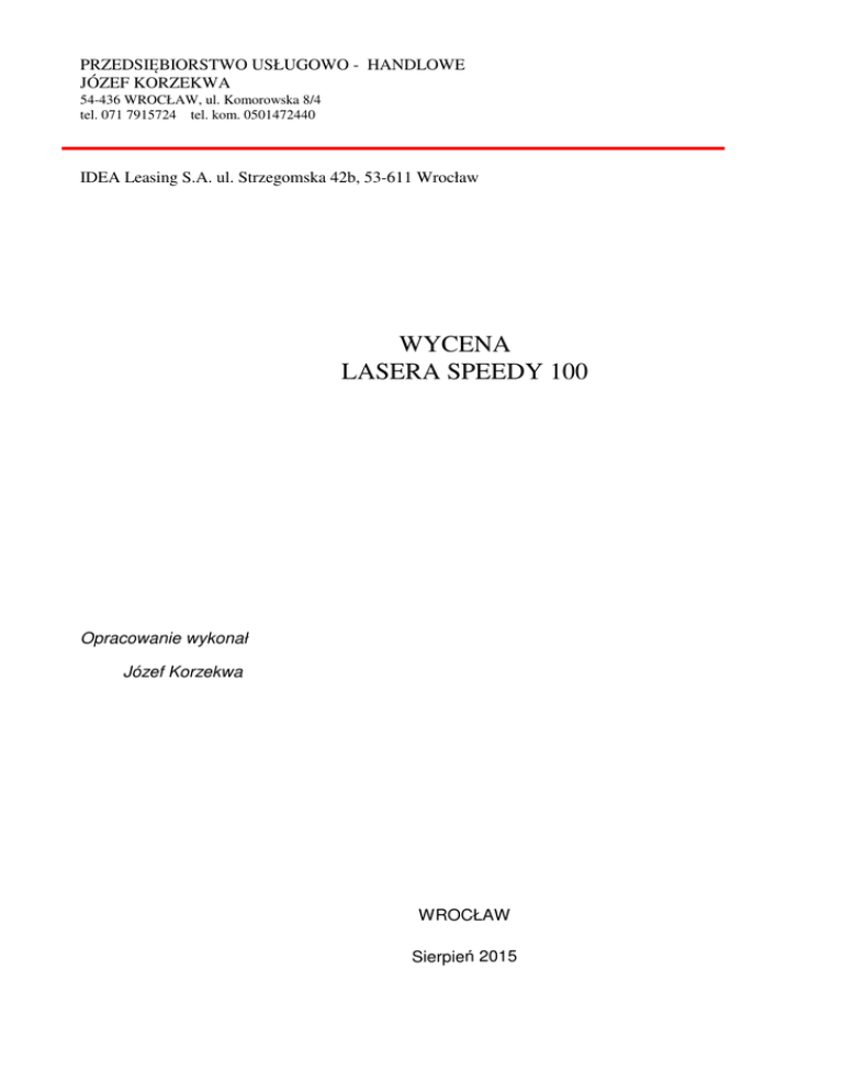 PRZEDSIĘBIORSTWO USŁUGOWO - HANDLOWE JÓZEF KORZEKWA 54-436 WROCŁAW, ul. Komorowska 8/4 tel. 071 7915724 tel. kom. 0501472440 IDEA Leasing S.A. ul. Strzegomska 42b, 53-611 Wrocław WYCENA LASERA SPEEDY 100 Opracowanie wykonał Józef Korzekwa WROCŁAW Sierpień 2015 2 WYCENA LASERA SPEEDY 100 1.Podstawa formalna Podstawą niniejszego opracowania jest zlecenie firmy Idea Leasing Wrocław z dnia 12.08.2015 r. 2.Podstawa merytoryczna Merytoryczną podstawę opracowania stanowią: - Informacje o wyposażeniu i cenach urządzeń strony internetowe - Oferty sprzedaży TROTEC 3.Cel opracowania Celem opracowania jest określenie stanu technicznego i ustalenie aktualnej wartości rynkowej używanego lasera celem jego zbycia. 4.Wizja lokalna W dniu 24.08.2015 r. dokonano oględzin, oraz wykonano fotografie lasera w miejscu jego składowania tj. w magazynie składowym firmy IDEA Leasing we Wrocławiu przy ul. Strzegomskiej 42b. Wyjaśnień oraz pomocy podczas oględzin udzielił przedstawiciel Idea Leasing. 5. Identyfikacja maszyn Na podstawie tabliczek znamionowych przymocowanych trwale na urządzeniu jak również wiedzy własnej, stwierdzam zgodność rzeczową urządzenia. 6. Analiza wyników oględzin W wyniku oględzin ustalono następujące dane: kompactowy laser CO2 urządzenie do cięcia i grawerowania materiałów takich jak akryl, drewno, folie, guma, szkło, tekstylia. Producent: - TROTEK - Austria - Typ 100RC30 - Seria nr S1-R7 7 - Rok produkcji 2008 - Źródło CO2 - Pole robocze 610 x 305 mm, maksymalna wysokość materiału 170 mm. - Moc lasera 12 – 60 W - Nie stwierdzono śladów uszkodzeń zewnętrznych. - 3 7. Ustalenie aktualnej wartości rynkowej lasera Model wycenianego lasera obecnie jest nadal produkowany z niewielkimi zmianami konstrukcyjnymi. Do wyceny zastosowano podejście kosztowe, zdefiniowane następującym wzorem określającym wartość odtworzeniową: W = C ( 1 - s/100 ) x n x k x r gdzie: W – wartość aktualna rynkowa urządzenia C - wartość nowego lasera tego samego typu i modelu lub podobnego s - stopień zużycia technicznego ustalony w czasie wizji lokalnej, z uwzględnieniem stosunku czasu efektywnego użytkowania do średniego czasu eksploatacji, czyli stopień zużycia wywołany normalną eksploatacją. n - wskaźnik podobieństwa urządzenia wycenianego do urządzenia stanowiącego podstawę wyceny k - wskaźnik nowoczesności, określony przy pomocy wzoru: k = 1 - α (Te - 1 ) gdzie: α - wskaźnik empiryczny zależny m. in. od kontynuacji produkcji danego środka i dostępności części zamiennych Te - ilość lat eksploatacji r – wskaźnik równowagi rynkowej zależny przede wszystkim od podaży i popytu na wyceniane środki na rynku wtórnym oraz popytu i stabilności rynku zbytu na usługi wykonywane na wycenianych urządzeniach. C – cenę nowego lasera tego samego modelu ustalono na podstawie oferty TROTEC, która wynosi 22 000 zł. netto. s – stopień zużycia ustalono na 30% n – wskaźnik podobieństwa wynosi 0,9 k – wskaźnik nowoczesności wynosi 0,88 przy α = 0,03 i siedem lat eksploatacji r – wskaźnik równowagi rynkowej zastosowano 0,8 W = C (1 - s/100) x n x k x r =22 000(1-30/100)x 0,9 x 0,88 x 0,8 = 9 757 PLN netto Po zaokrągleniu wartość rynkową lasera oszacowano na 9 800 PLN netto słownie: dziewięć tysięcy osiemset zł. netto