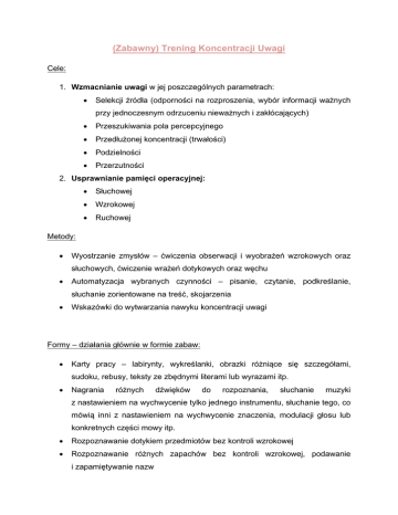(Zabawny) Trening Koncentracji Uwagi Cele: 1. Wzmacnianie uwagi w jej poszczególnych parametrach: • Selekcji źródła (odporności na rozproszenia, wybór informacji ważnych przy jednoczesnym odrzuceniu nieważnych i zakłócających) • Przeszukiwania pola percepcyjnego • Przedłużonej koncentracji (trwałości) • Podzielności • Przerzutności 2. Usprawnianie pamięci operacyjnej: • Słuchowej • Wzrokowej • Ruchowej Metody: • Wyostrzanie zmysłów – ćwiczenia obserwacji i wyobrażeń wzrokowych oraz słuchowych, ćwiczenie wrażeń dotykowych oraz węchu • Automatyzacja wybranych czynności – pisanie, czytanie, podkreślanie, słuchanie zorientowane na treść, skojarzenia • Wskazówki do wytwarzania nawyku koncentracji uwagi Formy – działania głównie w formie zabaw: • Karty pracy – labirynty, wykreślanki, obrazki różniące się szczegółami, sudoku, rebusy, teksty ze zbędnymi literami lub wyrazami itp. • Nagrania różnych dźwięków do rozpoznania, słuchanie muzyki z nastawieniem na wychwycenie tylko jednego instrumentu, słuchanie tego, co mówią inni z nastawieniem na wychwycenie znaczenia, modulacji głosu lub konkretnych części mowy itp. • Rozpoznawanie dotykiem przedmiotów bez kontroli wzrokowej • Rozpoznawanie różnych zapachów bez kontroli wzrokowej, podawanie i zapamiętywanie nazw • Testy i psychozabawy ułatwiające rozpoznanie swoich słabych i mocnych stron w funkcjonowaniu uwagi • Zapamiętywanie i odtwarzanie obrazów, dźwięków, rytmów, ciągów wyrazowych, ruchów Praca z uczniami klas IV, w grupie maksymalnie 16–osobowej, ćwiczenia indywidualne, w parach, w małych grupach; 45 minut / tydzień Ważna informacja: Trening Koncentracji Uwagi jest kołem dodatkowym, a nie treningiem w dosłownym znaczeniu. Może wspomagać rozwój i umiejętności związane z koncentrowaniem się, jednak nie leczy zaburzeń uwagi! Oprac.: Aneta Galińska