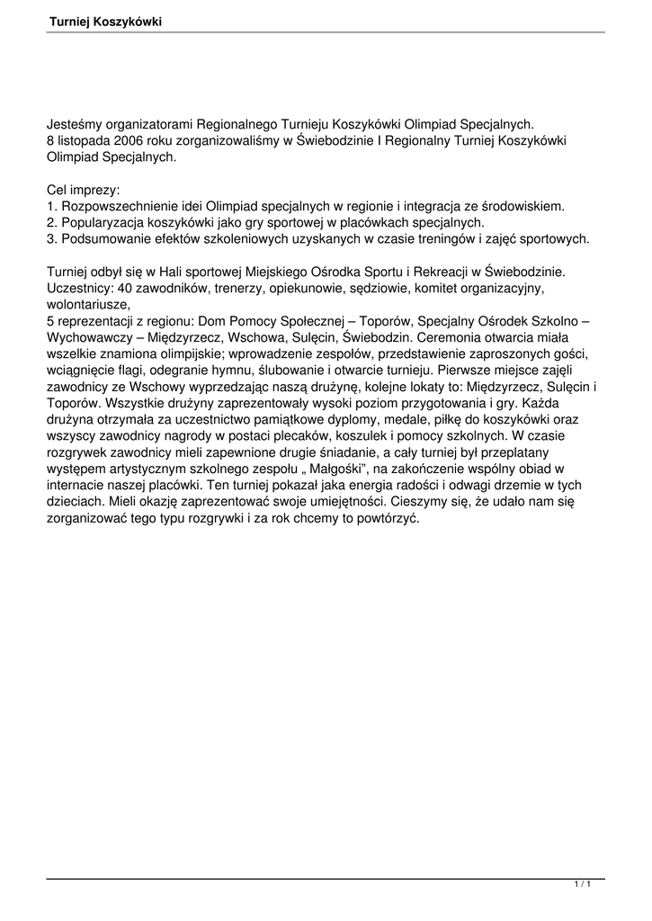 Turniej Koszykówki Jesteśmy organizatorami Regionalnego Turnieju Koszykówki Olimpiad Specjalnych. 8 listopada 2006 roku zorganizowaliśmy w Świebodzinie I Regionalny Turniej Koszykówki Olimpiad Specjalnych. Cel imprezy: 1. Rozpowszechnienie idei Olimpiad specjalnych w regionie i integracja ze środowiskiem. 2. Popularyzacja koszykówki jako gry sportowej w placówkach specjalnych. 3. Podsumowanie efektów szkoleniowych uzyskanych w czasie treningów i zajęć sportowych. Turniej odbył się w Hali sportowej Miejskiego Ośrodka Sportu i Rekreacji w Świebodzinie. Uczestnicy: 40 zawodników, trenerzy, opiekunowie, sędziowie, komitet organizacyjny, wolontariusze, 5 reprezentacji z regionu: Dom Pomocy Społecznej – Toporów, Specjalny Ośrodek Szkolno – Wychowawczy – Międzyrzecz, Wschowa, Sulęcin, Świebodzin. Ceremonia otwarcia miała wszelkie znamiona olimpijskie; wprowadzenie zespołów, przedstawienie zaproszonych gości, wciągnięcie flagi, odegranie hymnu, ślubowanie i otwarcie turnieju. Pierwsze miejsce zajęli zawodnicy ze Wschowy wyprzedzając naszą drużynę, kolejne lokaty to: Międzyrzecz, Sulęcin i Toporów. Wszystkie drużyny zaprezentowały wysoki poziom przygotowania i gry. Każda drużyna otrzymała za uczestnictwo pamiątkowe dyplomy, medale, piłkę do koszykówki oraz wszyscy zawodnicy nagrody w postaci plecaków, koszulek i pomocy szkolnych. W czasie rozgrywek zawodnicy mieli zapewnione drugie śniadanie, a cały turniej był przeplatany występem artystycznym szkolnego zespołu „ Małgośki”, na zakończenie wspólny obiad w internacie naszej placówki. Ten turniej pokazał jaka energia radości i odwagi drzemie w tych dzieciach. Mieli okazję zaprezentować swoje umiejętności. Cieszymy się, że udało nam się zorganizować tego typu rozgrywki i za rok chcemy to powtórzyć. 1/1