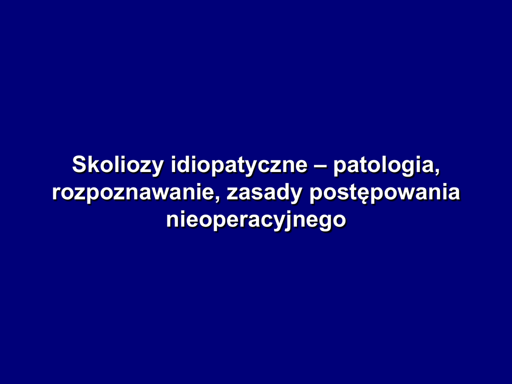 Skoliozy idiopatyczne – patologia, rozpoznawanie, zasady postępowania nieoperacyjnego Plan wykładu Definicja skoliozy Patomorfologia skoliozy Analiza płaszczyzny strzałkowej w skoliozie Gorsetowanie skolioz Ćwiczenia w skoliozach Skoliometr Badanie radiologiczne Długość kończyn dolnych Historia naturalna nieleczonych skolioz Podsumowanie - zasady postępowania Definicja skoliozy idiopatycznej Rozwojowe zniekształcenie kręgosłupa i tułowia Przyczyna schorzenia jest nieznana Charakter deformacji jest trójpłaszczyznowy Kąt na radiogramie wynosi co najmniej 10° Pogarsza się w okresach szybkiego wzrastania kręgosłupa Występowanie skolioz idiopatycznych Strukturalna skolioza 2-3 % dzieci Funkcjonalna skolioza jako tzw. „wada postawy” 20-30% ? „Skolioza” funkcjonalna <=> skolioza strukturalna funkcjonalne wygięcie kręgosłupa lędźwiowego w lewo z powodu obniżenia miednicy Morfologia tułowia w idiopatycznej skoliozie piersiowej Obraz kliniczny Linia wyrostków kolczystych jest lekko wygięta w okolicy szczytowej, zwykle Th8 - Th9. W tej strefie zmniejszona jest fizjologiczna kifoza piersiowa. Kompensacyjnie wzrasta kifoza w sąsiednich segmentach piersiowych proksymalnych. Dekompensacja tułowia skierowana jest w stronę wypukłości skoliozy. Lewe biodro wystaje do boku i powoduje asymetrię talii. Deformacja rotacyjna może być umiarkowana, niewidoczna w wyproście, wyraźna w zgięciu tułowia do przodu. Dalsze asymetrie tułowia są wtórne. Morfologia tułowia w idiopatycznej skoliozie piersiowej Obraz radiologiczny Sekwencja kilku (siedem) kręgów formujących krzywiznę Górny kręg krańcowy (najbardziej nachylony) zwykle Th5 Dolny kręg krańcowyTh12 lub L1 Rotacja osiowa kręgów stopniowo wzrasta od kręgów krańcowych w stronę szczytowego Th8 lub Th9 lub Th10 jest kręgiem szczytowym (najbardziej odchylony od osi ciała, najmocniej zrotowany, najbardziej zniekształcony) Zdjęcie boczne wykazuje segmentarne zmniejszenie fizjologicznej kifozy piersiowej, któremu towarzyszy kompensacyjne zwiększenie kifozy w segmentach sąsiednich powyżej Morfologia tułowia w idiopatycznej skoliozie piersiowej Patologia klatki piersiowej (1) MORFOLOGICZNA – deformacja klatki piersiowej (2) FUNKCJONALNA – zmniejszona ekspansja klatki Tkanki miękkie klatki piersiowej wykazują skrócenia i przykurcze: powięź powierzchniowa i głeboka, mięśnie międzyżebrowe, więzadła, torebki stawów, przepona Kostna klatka piersiowa wykazuje deformację, na którą składają się : (1’) nieprawidłowy kształt żeber : kąt żebra (trzon-szyjka) zmniejszony po stronie wypukłości, zwiększony po stronie wklęsłości (2’) nieprawidłowa przestrzenna orientacja żeber : głowa i szyjka są zorientowane strzałkowo po stronie wypukłej, a czołowo po stronie wklęsłej Klatka piersiowa uzyskuje kształt elipsy w płaszczyźnie poprzecznej Dawny podział Grucy i Weisfloga Skoliozy I° Skoliozy II° Skoliozy III° 0° - 30° 30° - 60° pow. 60° ćwiczenia gorsety operacje Obecne wartości kąta Cobba: Skoliozy I° Skoliozy II° Skoliozy III° 10° - 24° 25° - 40° pow. 50° (wiek rozwojowy) ćwiczenia gorsety i ćw. operacje Skolioza idiopatyczna jako trójpłaszczyznowe zniekształcenie kręgosłupa i tułowia Uproszczone pojęcie : „boczne” skrzywienie kręgosłupa Galen - scoliosis Kluczowe znaczenie deformacji w płaszczyznie strzałkowej: zmniejszenie fizjologicznej kifozy piersiowej lub zmniejszenie fizjologicznej lordozy lędźwiowej. Skolioza idiopatyczna uproszczone polskie mianownictwo: „boczne skrzywienie kręgosłupa” Galen - scoliosis Zmniejszona kifoza piersiowa jako cecha skoliozy piersiowej Znaczenie fizjologicznej kifozy piersiowej Naturalna krzywizna wpleciona między lordozę szyjną i lędźwiową. Gwarantuje prawidłową statykę kręgosłupa i rozmieszczenie środka ciężkości ciała. Zapewnia fizjologiczną ruchomość kręgosłupa. Wpływa amortyzująco na czaszkę i jej zawartość. Zwiększa wymiar przednio-tylny klatki piersiowej i jej pojemność. Odpowiada za prawidłową mechanikę klatki piersiowej (orientacja stawów żebrowo-kręgowych i amplituda ruchu żeber). Stabilizuje kręgosłup = zabezpiecza przed wyboczeniem. Rotacja osiowa kręgów: ruch obrotu kręgu wokół osi długiej kręgosłupa pojęcie garbu w skoliozie bok a-p osiowy widok z tyłu trzecia płaszczyzna Patomorfologia skolioz - wnioski 1. Zmniejszanie się fizjologicznej kifozy piersiowej jest stałą cechą progresującej skoliozy piersiowej. 2. Trójpłaszczyznowe korygowanie skoliozy jest osiągalne tylko pod warunkiem odtworzenia fizjologicznej kifozy piersiowej. 3. Intensywne ćwiczenia stosowane na zajęciach „gimnastyki korekcyjnej” polegające na wzmacnianiu długich mięśni grzbietu działających po cięciwie łuku skoliozy i po cięciwie łuku lordozy mogą niepotrzebnie lordotyzować kręgosłup piersiowy. Szkodliwa lordotyzacja kręgosłupa piersiowego w skoliozach piersiowych Sposoby leczenia skolioz idiopatycznych Ćwiczenia Gorsety Operacje Leczenie gorsetowe skolioz Gorset Cheneau Gorset Milwaukee Gorset Boston Gorset SpineCor POBRANIE MIARY NEGATYW POZYTYW MODELOWANIE POZYTYWU SKORUPA POLIPROPYLENOWA PRZYMIARKA ODBIÓR FABRICATION PLATREE negatyw pozytyw gorset pozytyw po korekcji Rozległe przestrzenie wolne zapewniające przesunięcie wklęsłych okolic tułowia Wykorzystanie wzrastania do uzyskania korekcji Odwrócenie niekorzystnego toru oddechowego Efekt „antygrawitacyjny” Specyfika gorsetu Cheneau respektowanie lordozy lędźwiowej Prawidłowo: kompensacja w gorsecie Ewolucja gorsetu Cheneau od gorsetu symetrycznego do asymetrycznego Funkcja przestrzeni odciążających pozycja swobodna wdech Funkcja przestrzeni odciążających pozycja swobodna wdech pozycja leżąca SOSORT Society on Scoliosis Orthopaedic and Rehabilitation Treatment www.sosort.org C. Michel, P. Stagnara Rev Chir Orthop 1987 : 134-147 Kąt skoliozy